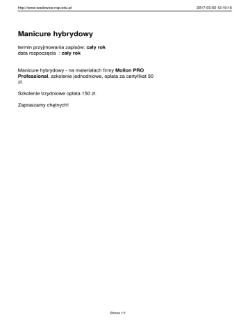 http://www.wadowice.nsp.edu.pl 2017-03-02 12:10:16 Manicure hybrydowy termin przyjmowania zapisów: cały rok data rozpoczęcia : cały rok Manicure hybrydowy - na materiałach firmy Mollon PRO Professional, szkolenie jednodniowe, opłata za certyfikat 30 zł. Szkolenie trzydniowe opłata 150 zł. Zapraszamy chętnych! Strona 1/1