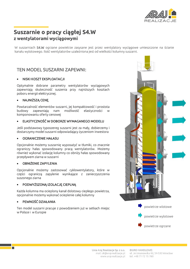 Suszarnie o pracy ciągłej S4.W z wentylatorami wyciągowymi W suszarniach S4.W ogrzane powietrze zasysane jest przez wentylatory wyciągowe umieszczone na ścianie kanału wylotowego. Ilość wentylatorów uzależniona jest od wielkości kolumny suszarni. TEN MODEL SUSZARNI ZAPEWNI: NISKI KOSZT EKSPLOATACJI Optymalnie dobrane parametry wentylatorów wyciągowych zapewniają skuteczność suszenia przy najniższych kosztach poboru energii elektrycznej. NAJNIŻSZĄ CENĘ Powtarzalność elementów suszarni, jej kompaktowość i prostota budowy zapewniają nam możliwość elastyczności w komponowaniu oferty cenowej ELASTYCZNOŚĆ W DOBORZE WYMAGANEGO MODELU Jeśli podstawowy typoszereg suszarni jest za mały, dobierzemy i dostarczymy model suszarni odpowiadający życzeniom inwestora OGRANICZENIE HAŁASU Opcjonalnie możemy suszarnię wyposażyć w tłumiki, co znacznie ograniczy hałas spowodowany pracą wentylatorów. Możemy również wykonać izolację kolumny co obniży hałas spowodowany przepływem ziarna w suszarni OBNIŻENIE ZAPYLENIA Opcjonalnie możemy zastosować cyklowentylatory, które w części ograniczą zapylenie wynikające z zanieczyszczenia suszonego ziarna PODWYŻSZONĄ IZOLACJĘ CIEPLNĄ Każda kolumna ma ocieplony kanał dolotowy ciepłego powietrza, opcjonalnie możemy wykonać ocieplenie całej kolumny PEWNOŚĆ DZIAŁANIA Ten model suszarni pracuje z powodzeniem już w setkach miejsc w Polsce i w Europie powietrze wlotowe powietrze wylotowe powietrze ogrzane Suszarnie o pracy ciągłej S4.W z wentylatorami wyciągowymi CHARAKTERYSTYKA W suszarniach S4.W ogrzane powietrze zasysane jest przez wentylatory wyciągowe umieszczone na ścianie kanału wylotowego. Ilość wentylatorów uzależniona jest od wielkości kolumny suszarni. DANE TECHNICZNE Model suszarni Pojemność zasypowa 1) Przybliżona moc cieplna bez wymiennika Suszarnia S 418.W jedn. S406. S410. S414. S418. S416. S420. S424. S428. S432. S436. S440. t 16 22 28 36 55 69 79 89 99 113 123 kW 600 1160 1630 2150 2440 3250 3950 4880 4880 6510 7900 KUKURYDZA- wydajność przy suszeniu z 30% do 15% 2) Wydajność godzinowa Wydajność dobowa t/h 2,4 4,8 6,5 9,5 12,0 14,5 16,9 21,8 24,0 29,0 38,7 t/24h 58 115 156 228 288 348 406 523 576 696 929 KUKURYDZA- wydajność przy suszeniu z 25% do 15% Wydajność godzinowa Wydajność dobowa 3) t/h 2,9 5,9 7,8 11,7 14,7 17,6 20,5 26,4 29,3 35,0 46,9 t/24h 70 142 187 281 353 422 492 634 703 840 1126 15,0 360 22,5 540 30,0 720 39,0 936 47,0 1128 55,0 1320 67,0 1608 74,0 1776 88,0 108,0 2112 2592 PSZENICA- wydajność przy suszeniu z 19% do 15% 4) Wydajność godzinowa Wydajność dobowa t/h t/24h 7,5 180 RZEPAK - wydajność przy suszeniu z 13% do 7% 5) Wydajność godzinowa Wydajność dobowa t/h 4,0 8,0 12,0 15,0 15,0 18,0 22,5 26,0 30,0 33,0 40,0 t/24h 96 192 288 360 360 432 540 624 720 792 960 SŁONECZNIK- wydajność przy suszeniu z 13% do 7% Wydajność godzinowa 6) t/h 1,3 2,6 3,9 5,1 9,6 11,6 13,5 17,3 19,3 23,1 30,8 t/24h 31 62 94 122 230 278 324 415 463 554 739 Ilość wentylatorów wyciągowych szt. 1 2 3 4 5 6 7 9 10 12 16 Zapotrzebowanie na energię elektryczną Wydajność dobowa Wymiary kolumny kW 9,7 17,6 25,8 34,1 42 50,9 59,9 75,7 83,2 101 132,6 szerokość m 2,4 2,4 2,4 2,4 4,0 4,0 4,0 4,0 4,0 4,0 4,0 wysokość m 9,2 11,6 14,0 17,0 16,8 19,8 22,2 24,6 27,0 30,0 32,4 długość m 4,9 4,9 4,9 4,9 4,9 4,9 4,9 4,9 4,9 6,4 6,4 Producent zastrzega sobie możliwość wprowadzenia zmian technicznych * Wydajności podano dla mokrego ziarna na wlocie do suszarni 1) Pojemność zasypową podano dla pszenicy o gęstości 750 kg/m 3 2) Wydajność dla kukurydzy, przy suszeniu z 30% do 15%, podano dla temperatury suszenia 110 0C przy temperaturze zewnętrznej 50C. Zużycie oleju opałowego wynosi około 1,5 l/t%, gazu ziemnego GZ50 1,3 m 3/t%, a gazu płynnego 2,0 l/t% 3) Wydajność dla kukurydzy, przy suszeniu z 25% do 15%, podano dla temperatury suszenia 110 0C przy temperaturze zewnętrznej 100C. Zużycie oleju opałowego wynosi około 1,71 l/t%, gazu ziemnego GZ50 1,67 m 3/t% 4) Wydajność dla pszenicy podano dla temperatury suszenia 950C przy temperaturze zewnętrznej 150C. Zużycie oleju wynosi około 1,1 l/t%, gazu ziemnego GZ50 1,0 m 3/t%, a gazu płynnego 1,5 l/t% 5) Wydajność dobową dla rzepaku podano dla gęstości 680 kg/m3, temperatura suszenia 80 0C przy temperaturze zewnętrznej 150C. Zużycie oleju wynosi około 1,1 l/t%, gazu ziemnego GZ50 1,0 m 3/t%, a gazu płynnego 1,5 l/t% 6) Wydajność dla słonecznika podano dla temperatury suszenia 800C przy temperaturze zewnętrznej 150C. Zużycie oleju opałowego wynosi około 1,47 l/t%, a gazu ziemnego GZ50 1,43 m3/t% 09.2015