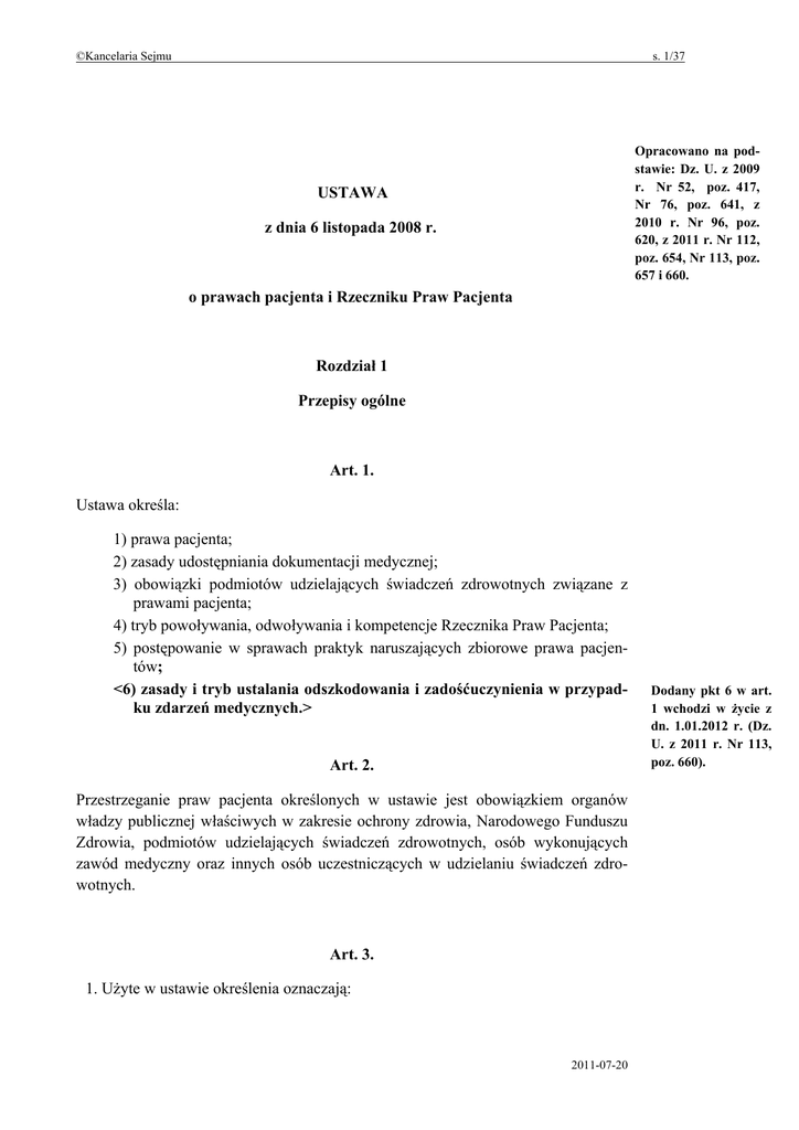 ©Kancelaria Sejmu s. 1/37 Opracowano na podstawie: Dz. U. z 2009 r. Nr 52, poz. 417, Nr 76, poz. 641, z 2010 r. Nr 96, poz. 620, z 2011 r. Nr 112, poz. 654, Nr 113, poz. 657 i 660. USTAWA z dnia 6 listopada 2008 r. o prawach pacjenta i Rzeczniku Praw Pacjenta Rozdział 1 Przepisy ogólne Art. 1. Ustawa określa: 1) prawa pacjenta; 2) zasady udostępniania dokumentacji medycznej; 3) obowiązki podmiotów udzielających świadczeń zdrowotnych związane z prawami pacjenta; 4) tryb powoływania, odwoływania i kompetencje Rzecznika Praw Pacjenta; 5) postępowanie w sprawach praktyk naruszających zbiorowe prawa pacjentów; <6) zasady i tryb ustalania odszkodowania i zadośćuczynienia w przypadku zdarzeń medycznych.> Art. 2. Przestrzeganie praw pacjenta określonych w ustawie jest obowiązkiem organów władzy publicznej właściwych w zakresie ochrony zdrowia, Narodowego Funduszu Zdrowia, podmiotów udzielających świadczeń zdrowotnych, osób wykonujących zawód medyczny oraz innych osób uczestniczących w udzielaniu świadczeń zdrowotnych. Art. 3. 1. Użyte w ustawie określenia oznaczają: 2011-07-20 Dodany pkt 6 w art. 1 wchodzi w życie z dn. 1.01.2012 r. (Dz. U. z 2011 r. Nr 113, poz. 660). ©Kancelaria Sejmu s. 2/37 1) opiekun faktyczny – osobę sprawującą, bez obowiązku ustawowego, stałą opiekę nad pacjentem, który ze względu na wiek, stan zdrowia albo stan psychiczny opieki takiej wymaga; 2) osoba bliska – małżonka, krewnego lub powinowatego do drugiego stopnia w linii prostej, przedstawiciela ustawowego, osobę pozostającą we wspólnym pożyciu lub osobę wskazaną przez pacjenta; 3) osoba wykonująca zawód medyczny – osobę wykonującą zawód medyczny, o której mowa w art. 2 ust. 1 pkt 2 ustawy z dnia 15 kwietnia 2011 r. o działalności leczniczej (Dz. U. Nr 112, poz. 654); 4) pacjent – osobę zwracającą się o udzielenie świadczeń zdrowotnych lub korzystającą ze świadczeń zdrowotnych udzielanych przez podmiot udzielający świadczeń zdrowotnych lub osobę wykonującą zawód medyczny; 5) podmiot udzielający świadczeń zdrowotnych – podmiot wykonujący działalność leczniczą, o którym mowa w art. 2 ust. 1 pkt 5 ustawy z dnia 15 kwietnia 2011 r. o działalności leczniczej; 6) świadczenie zdrowotne – świadczenie zdrowotne, o którym mowa w art. 2 ust. 1 pkt 10 ustawy z dnia 15 kwietnia 2011 r. o działalności leczniczej; 7) (uchylony). 2. Ilekroć w ustawie jest mowa o lekarzu, rozumie się przez to także lekarza dentystę oraz felczera w zakresie wynikającym z przepisów o zawodzie felczera. Art. 4. 1. W razie zawinionego naruszenia praw pacjenta sąd może przyznać poszkodowanemu odpowiednią sumę tytułem zadośćuczynienia pieniężnego za doznaną krzywdę na podstawie art. 448 Kodeksu cywilnego. 2. W razie zawinionego naruszenia prawa pacjenta do umierania w spokoju i godności sąd może, na żądanie małżonka, krewnych lub powinowatych do drugiego stopnia w linii prostej lub przedstawiciela ustawowego, zasądzić odpowiednią sumę pieniężną na wskazany przez nich cel społeczny na podstawie art. 448 Kodeksu cywilnego. 3. Przepisu ust. 1 nie stosuje się do zawinionego naruszenia prawa pacjenta do: 1) przechowywania rzeczy wartościowych w depozycie podmiotu leczniczego wykonującego działalność leczniczą w rodzaju stacjonarne i całodobowe świadczenia zdrowotne; 2) informacji o rodzaju i zakresie świadczeń zdrowotnych udzielanych przez podmioty udzielające świadczeń zdrowotnych; 3) dostępu do dokumentacji medycznej dotyczącej jego stanu zdrowia. Art. 5. Kierownik podmiotu udzielającego świadczeń zdrowotnych lub upoważniony przez niego lekarz może ograniczyć korzystanie z praw pacjenta w przypadku wystąpienia zagrożenia epidemicznego lub ze względu na bezpieczeństwo zdrowotne pacjentów, 2011-07-20 ©Kancelaria Sejmu s. 3/37 a w przypadku praw, o których mowa w art. 33 ust. 1, także ze względu na możliwości organizacyjne podmiotu. Rozdział 2 Prawo pacjenta do świadczeń zdrowotnych Art. 6. 1. Pacjent ma prawo do świadczeń zdrowotnych odpowiadających wymaganiom aktualnej wiedzy medycznej. 2. Pacjent ma prawo, w sytuacji ograniczonych możliwości udzielenia odpowiednich świadczeń zdrowotnych, do przejrzystej, obiektywnej, opartej na kryteriach medycznych, procedury ustalającej kolejność dostępu do tych świadczeń. 3. Pacjent ma prawo żądać, aby udzielający mu świadczeń zdrowotnych: 1) lekarz zasięgnął opinii innego lekarza lub zwołał konsylium lekarskie; 2) pielęgniarka (położna) zasięgnęła opinii innej pielęgniarki (położnej). 4. Lekarz może odmówić zwołania konsylium lekarskiego lub zasięgnięcia opinii innego lekarza, jeżeli uzna, że żądanie, o którym mowa w ust. 3, jest bezzasadne. 5. Żądanie, o którym mowa w ust. 3, oraz odmowę, o której mowa w ust. 4, odnotowuje się w dokumentacji medycznej. 6. Przepisy ust. 4 i 5 stosuje się do pielęgniarki (położnej) w zakresie zasięgania opinii innej pielęgniarki (położnej). Art. 7. 1. Pacjent ma prawo do natychmiastowego udzielenia świadczeń zdrowotnych ze względu na zagrożenie zdrowia lub życia. 2. W przypadku porodu pacjentka ma prawo do uzyskania świadczeń zdrowotnych związanych z porodem. Art. 8. Pacjent ma prawo do świadczeń zdrowotnych udzielanych z należytą starannością przez podmioty udzielające świadczeń zdrowotnych w warunkach odpowiadających określonym w odrębnych przepisach wymaganiom fachowym i sanitarnym. Przy udzielaniu świadczeń zdrowotnych osoby wykonujące zawód medyczny kierują się zasadami etyki zawodowej określonymi przez właściwe samorządy zawodów medycznych. 2011-07-20 ©Kancelaria Sejmu s. 4/37 Rozdział 3 Prawo pacjenta do informacji Art. 9. 1. Pacjent ma prawo do informacji o swoim stanie zdrowia. 2. Pacjent, w tym małoletni, który ukończył 16 lat, lub jego ustawowy przedstawiciel mają prawo do uzyskania od lekarza przystępnej 