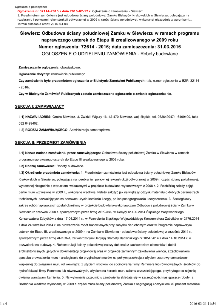 1z4 Ogłoszenie powiązane: Ogłoszenie nr 32114-2016 z dnia 2016-02-12 r. Ogłoszenie o zamówieniu - Siewierz 1. Przedmiotem zamówienia jest odbudowa ściany południowej Zamku Biskupów Krakowskich w Siewierzu, polegająca na rozebraniu i ponownej rekonstrukcji odtworzonej w 2009 r. części ściany południowej, wykonanej niezgodnie z warunkami... Termin składania ofert: 2016-03-04 Siewierz: Odbudowa ściany południowej Zamku w Siewierzu w ramach programu naprawczego usterek do Etapu III zrealizowanego w 2009 roku Numer ogłoszenia: 72614 - 2016; data zamieszczenia: 31.03.2016 OGŁOSZENIE O UDZIELENIU ZAMÓWIENIA - Roboty budowlane Zamieszczanie ogłoszenia: obowiązkowe. Ogłoszenie dotyczy: zamówienia publicznego. Czy zamówienie było przedmiotem ogłoszenia w Biuletynie Zamówień Publicznych: tak, numer ogłoszenia w BZP: 32114 - 2016r. Czy w Biuletynie Zamówień Publicznych zostało zamieszczone ogłoszenie o zmianie ogłoszenia: nie. SEKCJA I: ZAMAWIAJĄCY I. 1) NAZWA I ADRES: Gmina Siewierz, ul. Żwirki i Wigury 16, 42-470 Siewierz, woj. śląskie, tel. 0326499471, 6499400, faks 032 6499402. I. 2) RODZAJ ZAMAWIAJĄCEGO: Administracja samorządowa. SEKCJA II: PRZEDMIOT ZAMÓWIENIA II.1) Nazwa nadana zamówieniu przez zamawiającego: Odbudowa ściany południowej Zamku w Siewierzu w ramach programu naprawczego usterek do Etapu III zrealizowanego w 2009 roku. II.2) Rodzaj zamówienia: Roboty budowlane. II.3) Określenie przedmiotu zamówienia: 1. Przedmiotem zamówienia jest odbudowa ściany południowej Zamku Biskupów Krakowskich w Siewierzu, polegająca na rozebraniu i ponownej rekonstrukcji odtworzonej w 2009 r. części ściany południowej, wykonanej niezgodnie z warunkami wskazanymi w projekcie budowlano-wykonawczym z 2008 r. 2. Rozbiórką należy objąć partie muru wzniesione w 2009 r., wykonane wadliwie. Należy założyć jak największy odzysk materiału o dobrych parametrach technicznych, pozwalających na ponowne użycie kamienia i cegły, po ich posegregowaniu i oczyszczeniu. 3. Szczegółowy zakres robót naprawczych został określony w projekcie budowlano-wykonawczym Odbudowa południowej ściany Zamku w Siewierzu z czerwca 2008 r. sporządzonym przez firmę ARKONA, w Decyzji nr 400.2014 Śląskiego Wojewódzkiego Konserwatora Zabytków z dnia 17.04.2014 r., w Pozwoleniu Śląskiego Wojewódzkiego Konserwatora Zabytków nr 2176.2014 z dnia 24 września 2014 r. na prowadzenie robót budowlanych przy zabytku nieruchomym oraz w Programie naprawczym usterek do Etapu III, zrealizowanego w 2009 r. na Zamku w Siewierzu - odbudowa ściany południowej z września 2014 r., sporządzonym przez firmę ARKONA, zatwierdzonym Decyzją Starosty Będzińskiego nr 1054.2014 z dnia 14.10.2014 r. o pozwoleniu na budowę. 4. Rekonstrukcji ściany południowej należy dokonać z zachowaniem elementów i detali architektonicznych ujętych w dokumentacji projektowej oraz w projekcie zamiennym zakotwienia wieńca, z zachowaniem sposobu prowadzenia muru - analogicznie do oryginalnych murów na pełnym przekroju z użyciem zaprawy cementowo- wapiennej do związania muru od wewnątrz, z użyciem środków do spoinowania firmy Remmers lub równoważnych, środków do hydrofobizacji firmy Remmers lub równoważnych, użyciem na koronie muru szlamu uszczelniającego, przykrytego co najmniej dwiema warstwami kamienia. 5. Na wykonanie przedmiotu zamówienia składają się w szczególności następujące roboty: a. Rozbiórka wadliwie wykonanej w 2009 r. części muru ściany południowej Zamku z segregacją i odzyskiem 70 procent materiału 2016-03-31 11:54 2z4 kamiennego i ceglanego, b. Rekonstrukcja muru: Ustawienie rusztowań, Demontaż krat w oknach górnej kondygnacji ściany południowej, Rozbiórka środkowej części muru kamiennego i ceglanego ściany południowej począwszy od korony murów do posadowienia (blachy ołowianej oddzielającej stary mur od nowego), także pod wieńcem oraz fragmentu górnej części ścianki działowej, z zachowaniem wcześniej istniejącej części ściany południowej od frontu, z zachowaniem wykonanego poprzednio wieńca żelbetowego oraz z zachowaniem dolnej części ściany działowej, do ok. 2 m nad poziomem terenu, Oczyszczenie skrajów muru po rozbiórce z pyłów kamienno-cementowych, piasku i ziemi miękkimi szczotkami stalowymi oraz spłukanie powierzchni wodą, Rekonstrukcja rozebranych części ściany wraz ze spoinowaniem muru, Do odbudowy ściany należy zastosować kamień i cegłę pochodzące w maksymalnej ilości z odzysku oraz sezonowany lub rozbiórkowy kamień wapienny pochodzący z okolicznych budynków lub kamionek; kamień nie może odbiegać kolorystycznie od koloru kamienia fragmentów istniejących ściany; należy unikać stosowania szerokich spoin stosując wtykanie drobnego kamienia; do murowania i uzupełnienia ubytków, można użyć tradycyjnej zaprawy cementowo-wapiennej M7 z dodatkiem w zwieńczeniu muru środków uplastyczniających Mörteldicht MD III lub równoważnych; c. Odtworzenie zawartych w ścianie elementów architektonicznych wskazanych w pierwotnym projekcie budowlanym: przemurowanie wątku ceglanego z dobraniem pierwotnego budulca z odzysku lub zlecenie wykonania nowych cegieł wg oryginalnego wzoru; stosować cegłę o wymiarach gotyckich; ubytki w cegłach można uzupełnić kitami dopasowanymi kolorystycznie zaprawą Restauriermörtel SK firmy REMMERS lub równoważną; odtworzenie okien ściany I i II kondygnacji poprzez analogiczne powielenie istniejących, w układzie i liczbie według rycin z XIX w.; drugie okno II kondygnacji - patrząc od strony zachodniej, zrekonstruowane w postaci niszy widocznej od wewnątrz zamku, zamurowane od strony zewnętrznej; renowacja reliktu drugiego - licząc od strony zachodniej okna III kondygnacji i odtworzenie fragmentu podokiennika a także fragmentu ceglanego nadproża w postaci łuku; uczytelnienie reliktu gotyckiej bramy na podstawie istniejącej ryci