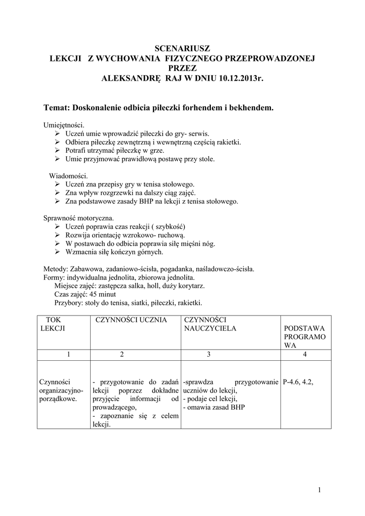 Konspekt lekcji z techniki gry w tenisa stołowego