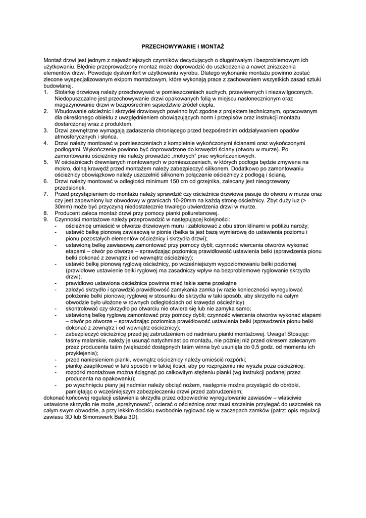 PRZECHOWYWANIE I MONTAŻ Montaż drzwi jest jednym z najważniejszych czynników decydujących o długotrwałym i bezproblemowym ich użytkowaniu. Błędnie przeprowadzony montaż może doprowadzić do uszkodzenia a nawet zniszczenia elementów drzwi. Powoduje dyskomfort w użytkowaniu wyrobu. Dlatego wykonanie montażu powinno zostać zlecone wyspecjalizowanym ekipom montażowym, które wykonają prace z zachowaniem wszystkich zasad sztuki budowlanej. 1. Stolarkę drzwiową należy przechowywać w pomieszczeniach suchych, przewiewnych i niezawilgoconych. Niedopuszczalne jest przechowywanie drzwi opakowanych folią w miejscu nasłonecznionym oraz magazynowanie drzwi w bezpośrednim sąsiedztwie źródeł ciepła. 2. Wbudowanie ościeżnic i skrzydeł drzwiowych powinno być zgodne z projektem technicznym, opracowanym dla określonego obiektu z uwzględnieniem obowiązujących norm i przepisów oraz instrukcji montażu dostarczonej wraz z produktem. 3. Drzwi zewnętrzne wymagają zadaszenia chroniącego przed bezpośrednim oddziaływaniem opadów atmosferycznych i słońca. 4. Drzwi należy montować w pomieszczeniach z kompletnie wykończonymi ścianami oraz wykończonymi podłogami. Wykończenie powinno być doprowadzone do krawędzi ściany (otworu w murze). Po zamontowaniu ościeżnicy nie należy prowadzić „mokrych” prac wykończeniowych. 5. W ościeżnicach drewnianych montowanych w pomieszczeniach, w których podłoga będzie zmywana na mokro, dolną krawędź przed montażem należy zabezpieczyć silikonem. Dodatkowo po zamontowaniu ościeżnicy obowiązkowo należy uszczelnić silikonem połączenie ościeżnicy z podłogą i ścianą. 6. Drzwi należy montować w odległości minimum 150 cm od grzejnika, zalecany jest nieogrzewany przedsionek. 7. Przed przystąpieniem do montażu należy sprawdzić czy ościeżnica drzwiowa pasuje do otworu w murze oraz czy jest zapewniony luz obwodowy w granicach 10-20mm na każdą stronę ościeżnicy. Zbyt duży luz (> 30mm) może być przyczyną niedostatecznie trwałego utwierdzenia drzwi w murze. 8. Producent zaleca montaż drzwi przy pomocy pianki poliuretanowej. 9. Czynności montażowe należy przeprowadzić w następującej kolejności: ościeżnicę umieścić w otworze drzwiowym muru i zablokować z obu stron klinami w pobliżu naroży; ustawić belkę pionową zawiasową w pionie (belka ta jest bazą wymiarową do ustawienia poziomu i pionu pozostałych elementów ościeżnicy i skrzydła drzwi); ustawioną belkę zawiasową zamontować przy pomocy dybli; czynność wiercenia otworów wykonać etapami – otwór po otworze – sprawdzając poziomicą prawidłowość ustawienia belki (sprawdzenia pionu belki dokonać z zewnątrz i od wewnątrz ościeżnicy); ustawić belkę pionową ryglową ościeżnicy, po wcześniejszym wypoziomowaniu belki poziomej (prawidłowe ustawienie belki ryglowej ma zasadniczy wpływ na bezproblemowe ryglowanie skrzydła drzwi); prawidłowo ustawiona ościeżnica powinna mieć takie same przekątne założyć skrzydło i sprawdzić prawidłowość zamykania zamka (w razie konieczności wyregulować położenie belki pionowej ryglowej w stosunku do skrzydła w taki sposób, aby skrzydło na całym obwodzie było ułożone w równych odległościach od krawędzi ościeżnicy) skontrolować czy skrzydło po otwarciu nie otwiera się lub nie zamyka samo; ustawioną belkę ryglową zamontować przy pomocy dybli; czynność wiercenia otworów wykonać etapami – otwór po otworze – sprawdzając poziomicą prawidłowość ustawienia belki (sprawdzenia pionu belki dokonać z zewnątrz i od wewnątrz ościeżnicy); zabezpieczyć ościeżnicę przed jej zabrudzeniem od nadmiaru pianki montażowej. Uwaga! Stosując taśmy malarskie, należy je usunąć natychmiast po montażu, nie później niż przed okresem zalecanym przez producenta taśm (większość dostępnych taśm winna być usunięta do 0,5 godz. od momentu ich przyklejenia); przed naniesieniem pianki, wewnątrz ościeżnicy należy umieścić rozpórki; piankę zaaplikować w taki sposób i w takiej ilości, aby po rozprężeniu nie wyszła poza ościeżnicę; rozpórki montażowe można ściągnąć po całkowitym stężeniu pianki (wg instrukcji podanej przez producenta na opakowaniu); po wyschnięciu piany jej nadmiar należy obciąć nożem, następnie można przystąpić do obróbki, pamiętając o wcześniejszym zabezpieczeniu drzwi przed zabrudzeniem; dokonać końcowej regulacji ustawienia skrzydła przez odpowiednie wyregulowanie zawiasów – właściwie ustawione skrzydło nie może „sprężynować”, ocierać o ościeżnicę oraz musi szczelnie przylegać do uszczelek na całym swym obwodzie, a przy lekkim docisku swobodnie ryglować się w zaczepach zamków (patrz: opis regulacji zawiasu 3D lub Simonswerk Baka 3D).