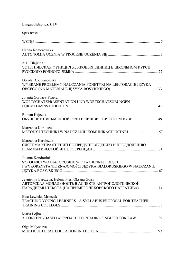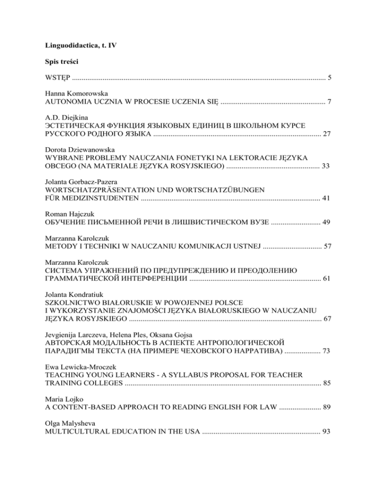 Linguodidactica, t. IV Spis treści WSTĘP ..................................................................................................................................... 5 Hanna Komorowska AUTONOMIA UCZNIA W PROCESIE UCZENIA SIĘ ....................................................... 7 A.D. Diejkina ЭСТЕТИЧЕСКАЯ ФУНКЦИЯ ЯЗЫКОВЫХ ЕДИНИЦ В ШКОЛЬНОМ КУРСЕ РУССКОГО РОДНОГО ЯЗЫКА ........................................................................................ 27 Dorota Dziewanowska WYBRANE PROBLEMY NAUCZANIA FONETYKI NA LEKTORACIE JĘZYKA OBCEGO (NA MATERIALE JĘZYKA ROSYJSKIEGO) ................................................. 33 Jolanta Gorbacz-Pazera WORTSCHATZPRÄSENTATION UND WORTSCHATZÜBUNGEN FÜR MEDIZINSTUDENTEN .............................................................................................. 41 Roman Нajczuk ОБУЧЕНИЕ ПИСЬМЕННОЙ РЕЧИ В ЛИШВИСТИЧЕСКОМ ВУЗЕ .......................... 49 Marzanna Karolczuk METODY I TECHNIKI W NAUCZANIU KOMUNIKACJI USTNEJ ............................... 57 Marzanna Кarolczuk СИСТЕМА УПРАЖНЕНИЙ ПО ПРЕДУПРЕЖДЕНИЮ И ПРЕОДОЛЕНИЮ ГРАММАТИЧЕСКОЙ ИНТЕРФЕРЕНЦИИ ..................................................................... 61 Jolanta Kondratiuk SZKOLNICTWO BIAŁORUSKIE W POWOJENNEJ POLSCE I WYKORZYSTANIE ZNAJOMOŚCI JĘZYKA BIAŁORUSKIEGO W NAUCZANIU JĘZYKA ROSYJSKIEGO ..................................................................................................... 67 Jevgienija Larczeva, Helena Ples, Oksana Gojsa АВТОРСКАЯ МОДАЛЬНОСТЬ В АСПЕКТЕ АНТРОПОЛОГИЧЕСКОЙ ПАРАДИГМЫ ТЕКСТА (НА ПРИМЕРЕ ЧЕХОВСКОГО НАРРАТИВА) ................... 73 Ewa Lewicka-Mroczek TEACHING YOUNG LEARNERS - A SYLLABUS PROPOSAL FOR TEACHER TRAINING COLLEGES ....................................................................................................... 85 Maria Lojko A CONTENT-BASED APPROACH TO READING ENGLISH FOR LAW ...................... 89 Olga Malysheva MULTICULTURAL EDUCATION IN THE USA .............................................................. 93 Anna Mietluk TRANSKRYPCJA FONETYCZNA W SŁOWNIKU WIELOJĘZYCZNYM .................... 97 Żanna Pyłkowsкa ПОДЪЯЗЫК НАУКИ НА ПРАКТИЧЕСКИХ ЗАНЯТИЯХ ПО РУССКОМУ ЯЗЫКУ ДЛЯ СТУДЕНТОВ-ФИЛОЛОГОВ .................................................................................. 105 Natalja Rudenko УМОВНА МОДАЛЬНIСТЬ I ЗАСОБИ Ï ВИРАЖЕННЯ ............................................... 109 Anna Stelmaszuk СИНТАКСИЧЕСКИЕ ЕДИНИЦЫ И МЕСТО СРЕДИ НИХ СЛОЖНОГО ПРЕДЛОЖЕНИЯ ........................................................................................ 117 Nadjeżda Sulimienko МЕНТАЛЬНОСТЬ СОВРЕМЕННИКА В ЕЕ ТЕКСТОВОМ ВОПЛОЩЕНИИ (ЛЕКСИЧЕСКИЙ АСПЕКТ) ............................................................................................. 127 Dorota Szymaniuk TEACHING ENGLISH INTONATION TO POLISH STUDENTS (EXERCISES FOR ELEMENTARY LEVEL) ........................................................................................... 135 Robert Szymula SŁOWNICTWO SYSTEMU TEZAURUSÓW BIBLIOTEKI SEJMOWEJ NA PRZYKŁADZIE MIKROTEZAURUSA "OŚWIATA" ............................................. 141 Rimma Teremowа СИСТЕМА МИКРОПОЛЕЙ ПРЯМОГО ПРИЧИННОГО ОБОСНОВАНИЯ В СОВРЕМЕННОМ РУССКОМ ЯЗЫКЕ ........................................................................ 147 Carolyn Trotman Radecki THE FIRST STEPS TOWARDS REDESIGNING A THIRD (FINAL) YEAR SPEAKING COURSE AT A TEACHERS TRAINING COLLEGE ...................................................... 153 Valenтina Vegvari ИСПОЛЬЗОВАНИЕ РЕКЛАМ В ОБУЧЕНИИ ИНОСТРАННОМУ ЯЗЫКУ ............. 167 Hanna Voronicz СЛОВОЗМIННI ФОРМИ YКPAÏHCЬKОÏ МОВИ В АРЕАЛЬНОМУ АСПЕКТI ...... 171 METODOLOGIA SPECJALISTYCZNEGO (MEDYCZNEGO) JĘZYKA OBCEGO GDAŃSK 14-16.09.2000 ..................................................................................................... 175 Jan Zaniewski, Anna Stelmaszuk, Zdzisław Jaroszewicz PROCES KSZTAŁTOWANIA I ROZWOJU TWÓRCZEJ AKTYWNOŚCI STUDENTÓW-MEDYKÓW NA LEKTORACIE JĘZYKA OBCEGO ............................ 175 Urszula Kokot TRUDNOŚCI W PERCEPCJI TEKSTÓW MEDYCZNYCH ORAZ METODY ICH POKONYWANIA ....................................................................................................... 183 Anna Stelmaszuk ПРОБЛЕМЫ ТЕКСТООБРАЗОВАНИЯ В ВЫСШЕЙ ШКОЛЕ ................................... 191 Joanna Rak ROLA KWESTIONARIUSZA W METODOLOGII JĘZYKA OBCEGO SPECJALISTYCZNEGO .................................................................................................... 199 Jolanta Gorbacz-Pazera HORYZONTALNY I WERTYKALNY PODZIAŁ JĘZYKA SPECJALISTYCZNEGO MEDYCYNY ....................................................................................................................... 207 Danuta Budzyń-Słota PRAKTYCZNE ZASTOSOWANIE MATERIAŁÓW ŹRÓDŁOWYCH JAKO NARZĘDZIA ROZWIJANIA ZINTEGROWANYCH UMIEJĘTNOŚCI JĘZYKOWYCH ORAZ ŚWIADOMOŚCI JĘZYKOWEJ I AUTONOMII UCZĄCYCH SIĘ JĘZYKA OBCEGO SPECJALISTYCZNEGO ................................................................... 215 RECENZJE, OMÓWIENIA I SPRAWOZDANIA ............................................................. 227
