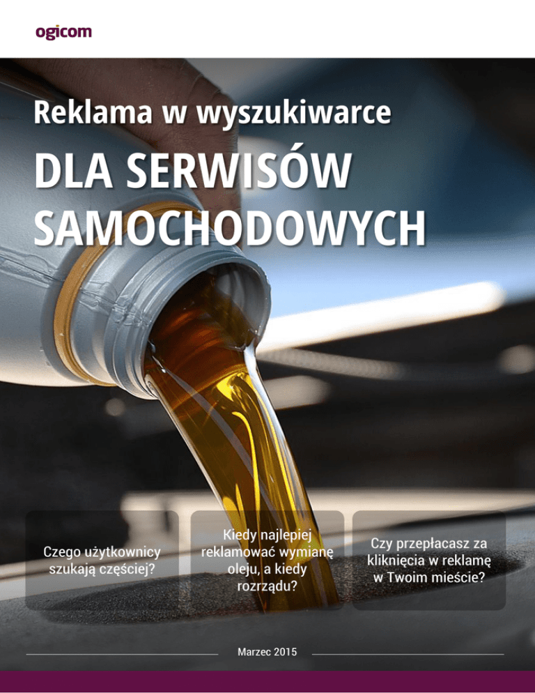 Reklama w wyszukiwarce DLA SERWISÓW SAMOCHODOWYCH Czego użytkownicy szukają częściej? Kiedy najlepiej reklamować wymianę oleju, a kiedy rozrządu? Marzec 2015 Czy przepłacasz za kliknięcia w reklamę w Twoim mieście? Frazy branżowe – markami pojazdów Dla analizy rynku wytypowaliśmy listę popularnych fraz branżowych. Wszystkie frazy były wpisywane w dopasowaniu przybliżonym, aby dać obraz wstępnego potencjału – widać, ile razy który serwis podlega wyszukiwaniu w skali miesiąca oraz przybliżony koszt kliknięcia (CPC). Słowo kluczowe Kliknięcia Wyświetlenia Koszt Śr. CPC Śr. poz. warsztat samochodowy 8 562 133 258 23.054,27 2,69 1,68 serwis samochodowy 4 570 121 334 9.196,82 2,01 1,31 serwis fiat 81 4 535 218,15 2,68 1,45 serwis mercedes 325 17 969 811,08 2,49 1,7 serwis bmw 636 24 049 1.388,22 2,18 1,72 serwis citroen 631 26 889 1.226,63 1,94 1,83 serwis renault 1 488 21 887 2.562,17 1,72 1,72 serwis toyota 1 064 36 467 2.372,07 2,23 1,76 serwis peugeot 1 019 19 671 2.480,15 2,43 1,84 serwis skoda 1 016 23 603 1.661,25 1,64 1,99 serwis opel 3 082 38 649 4.798,27 1,56 1,48 serwis ford 2 923 35 562 7.130,47 2,44 1,44 serwis audi 2 069 30 670 4.670,51 2,26 1,5 Dla oszacowania ogólnopolskiego potencjału fraz zastosowaliśmy w prognozach nieograniczony budżet. 2 Frazy branżowe – merytoryką usług Wybraliśmy kilka przykładowych fraz, aby sprawdzić, z jaką częstotliwością miesięczną są one wpisywane w wyszukiwarkę w skali całego kraju. Dzięki temu wiać wyraźnie, jakie rodzaje usług są najczęściej poszukiwane. Słowo kluczowe Kliknięcia Wyświetlenia Koszt Śr. CPC Śr. poz. wymiana oleju 19 748 189 452 47.340,57 2,4 1,37 wymiana rozrządu 17 944 148 998 44.796,25 2,5 1,25 naprawa skrzyni biegów 3 497 40 179 8.491,02 2,43 1,83 naprawa silnika 1 856 13 366 3.107,36 1,67 1,17 lakierowanie samochodu 1 565 7 094 2.486,44 1,59 1,28 wymiana klocków hamulcowych 834 13 894 2.289,56 2,75 1,29 wymiana opon 630 23 856 1.054,33 1,67 1,63 naprawa turbosprężarki 606 11 417 914,52 1,51 2,17 regeneracja turbosprężarki 572 16 234 1.443,21 2,52 2,06 naprawa blacharska 254 967 599,69 2,36 1,21 Dla oszacowania ogólnopolskiego potencjału fraz zastosowaliśmy w prognozach nieograniczony budżet. 3 Kiedy kierowcy wymieniają olej? Jedną z najbardziej interesujących fraz jest niezwykle popularne w Polsce zapytanie „wymiana oleju”. Sprawdziliśmy trendy sezonowe wyszukiwania dla tej frazy. Wymiana oleju Widać wyraźnie, że zainteresowanie wymianą oleju ma Trend ma charakter delikatnie rosnący. Analizowaliśmy charakter sezonowy. Szczyt zainteresowania przypada dane od roku 2008 do początku roku 2015 i można co roku w miesiącu marcu lub kwietniu (co oznaczono stwierdzić, iż zainteresowanie tą frazą nieznacznie strzałkami na wykresie). rośnie w czasie. 4 „Wymiana rozrządu” coraz częściej wyszukiwaną frazą w Polsce. Jedną z najbardziej interesujących fraz jest niezwykle popularne w Polsce zapytanie „wymiana rozrządu”. Sprawdziliśmy trendy sezonowe wyszukiwania dla tej frazy. Wymiana rozrządu Zainteresowanie wymianą rozrządu rośnie o wiele wyraźniej niż wymianą oleju. Trudno natomiast doszukać się jednoznacznych trendów o charakterze sezonowym, choć najczęściej szczyt zainteresowania ma miejsce w miesiącach letnich (lipiec-sierpień) i wiosennych (marzec-kwiecień). 5 Na jakich urządzeniach szuka się fraz związanych z serwisem aut? Stacjonarne 84% Tablety 12% Telefony 4% Analizując wyszukania na terenie całego kraju stwierdziliśmy, że najwięcej osób wyszukuje fraz z tej branży przy użyciu komputerów stacjonarnych, a najmniej – przy użyciu smartfonów. Trendy mobilne nie są zatem jeszcze w tej branży tak silne. 6 Wymiana oleju w dużych miastach Sprawdziliśmy, z jakimi warunkami i jakim potencjałem mogą w przybliżeniu mierzyć się właściciele warsztatów, chcących reklamować się po frazie „wymiana oleju” Wymiana oleju – cena za pojedyncze kliknięcie w reklamę (CPC) Wymiana oleju – liczba wyświetleń reklamy Okazuje się, że cena jaką przyjdzie średnio zapłacić za Istotne różnice dotyczą natomiast liczby wyświetleń tej kliknięcie w dużym polskim mieście nie jest szczególnie frazy w wynikach wyszukiwania w analizowanych zróżnicowana i waha się w przedziale 1,36 - 1,74 zł. miastach. Okazuje się bowiem, że o ile w Gdańsku możemy się spodziewać ok. 16 tys. wyświetleń, o tyle w Krakowie aż 65 tys. 7 Frazy specjalistyczne - miastami Przeanalizowaliśmy zbiór fraz, związanych z merytoryką usług i porównaliśmy sytuację dla dużych, polskich miast – oto szacunkowa LICZBA KLIKNIĘĆ, na którą mogą liczyć reklamujący swoje warsztaty samochodowe w wyszukiwarce Google. Słowo kluczowe Gdańsk Kraków Poznań Warszawa Wrocław SUMA lakierowanie samochodu 0 0 0 102 0 102 naprawa blacharska 0 59 11 0 0 71 naprawa silnika 146 0 85 29 26 286 naprawa skrzyni biegów 4 10 44 31 12 101 naprawa turbosprężarki 69 2 159 35 3 269 regeneracja turbosprężarki 1 9 4 7 7 27 serwis samochodowy 260 69 141 89 227 786 warsztat samochodowy 177 13 121 137 42 490 wymiana klocków hamulcowych 17 5 1 20 1 44 wymiana oleju 14 132 104 257 353 860 wymiana opon 1 1 0 6 8 18 wymiana rozrządu 10 396 490 165 59 1 120 Suma końcowa 699 697 1 162 877 738 4 173 8 Ile budżetu na to wszystko potrzeba? Dla analiz w poszczególnych miastach zasymulowaliśmy kampanię prowadzoną z budżetem ok. 1500 zł netto miesięcznie, co oznacza dzienny budżet na poziomie 50 zł. Prognozy wykonano narzędziami Google Planer Słów Kluczowych oraz Google Trends, Budżet dzienny 50,- zł Maks. cena za kliknięcie Wyświetlenia / m-c 12-46 tys. Kliknięcia / m-c 2,75 700-1.200 Jak można zaoszczędzić? Koncentracja geograficzna Koncentracja merytoryczna Niższy budżet dzienny Budżet można zmniejszyć i wciąż osiągać Drugim sposobem na ograniczenie wielkości Trzecim sposobem jest po pr