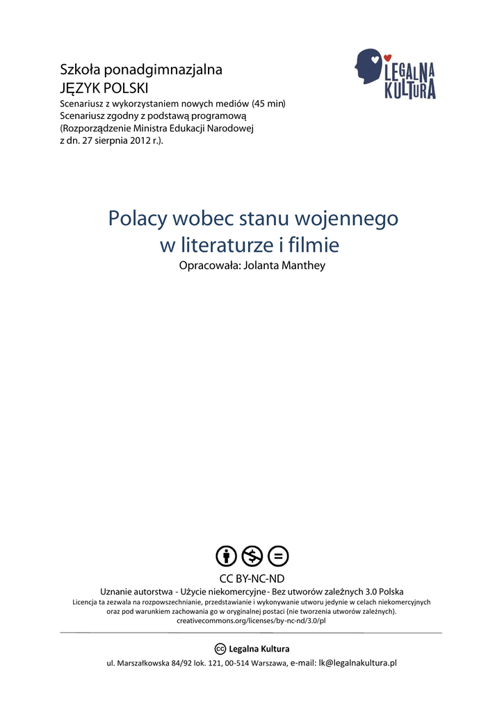Szkoła ponadgimnazjalna JĘZYK POLSKI Scenariusz z wykorzystaniem nowych mediów (45 min) Scenariusz zgodny z podstawą programową (Rozporządzenie Ministra Edukacji Narodowej z dn. 27 sierpnia 2012 r.). Polacy wobec stanu wojennego w literaturze i filmie Opracowała: Jolanta Manthey CC BY-NC-ND Uznanie autorstwa - Użycie niekomercyjne - Bez utworów zależnych 3.0 Polska Licencja ta zezwala na rozpowszechnianie, przedstawianie i wykonywanie utworu jedynie w celach niekomercyjnych oraz pod warunkiem zachowania go w oryginalnej postaci (nie tworzenia utworów zależnych). creativecommons.org/licenses/by-nc-nd/3.0/pl ul. Marszałkowska 84/92 lok. 121, 00-514 Warszawa, e-mail: [email protected] Cele lekcji: Uczeń: - kształtuje właściwą postawę obywatelską; - ćwiczy umiejętność wyszukiwania informacji w Internecie oraz ich selekcjonowania; - doskonali umiejętność czytania ze zrozumieniem; - nabywa umiejętności potrzebne do życia w społeczeństwie informacyjnym. Metody: - praca z tekstami kultury (film, plakat, fragment utworu literackiego); - praca indywidualna w domu; - praca w grupach; Środki dydaktyczne: - obejrzany przed zajęciami film Waldemara Krzystka Ostatni prom (dostępny na DVD w serii Klasyka kina polskiego); - odbite fragmenty Wschodów i zachodów księżyca T. Konwickiego (przeczytane w domu); - karty pracy; - dostęp do Internetu; - rzutnik multimedialny/tablica interaktywna. Przygotowanie do lekcji: Uczniowie otrzymują odbite fragmenty Wschodów i zachodów księżyca T. Konwickiego z poleceniami do wykonania (Załącznik 1). Powiązanie z podstawą programową z języka polskiego: I. Analiza i interpretacja tekstów kultury. Uczeń zna teksty literackie i inne teksty kultury wskazane przez nauczyciela. - wybrane filmy z twórczości polskich reżyserów (np. Krzysztofa Kieślowskiego, Andrzeja Munka, Andrzeja Wajdy, Krzysztofa Zanussiego); II. Analiza i interpretacja tekstów kultury. 1.Wstępne rozpoznanie. Uczeń: 1) prezentuje własne przeżycia wynikające z kontaktu z dziełem sztuki; 2) określa problematykę utworu; 2. Analiza. Uczeń: 4) rozpoznaje w utworze sposoby kreowania świata przedstawionego i bohatera (narracja, fabuła, sytuacja liryczna, akcja); 3. Interpretacja. Uczeń: 1) wykorzystuje w interpretacji elementy znaczące dla odczytania sensu utworu (np. słowa-klucze, wyznaczniki kompozycji); 2) wykorzystuje w interpretacji utworu konteksty (np. literackie, kulturowe, filozoficzne, religijne); 3) porównuje funkcjonowanie tych samych motywów w różnych utworach literackich; 4) odczytuje treści alegoryczne i symboliczne utworu. 4. Wartości i wartościowanie. Uczeń: 2) dostrzega obecne w utworach literackich oraz innych tekstach kultury wartości narodowe i uniwersalne; 3) dostrzega w świecie konflikty wartości (np. równości i wolności, sprawiedliwości i miłosierdzia) oraz rozumie źródła tych konfliktów. III. Tworzenie wypowiedzi. 1. Mówienie i pisanie. Uczeń: 1) tworzy dłuższy tekst pisany lub mówiony(rozprawka, recenzja, referat, interpretacja utworu literackiego lub fragmentu) zgodnie z podstawowymi regułami jego organizacji, przestrzegając zasad spójności znaczeniowej i logicznej; 2) przygotowuje wypowiedź (wybiera formę gatunkową i odpowiedni układ kompozycyjny, analizuje temat, wybiera formę kompozycyjną, sporządza plan wypowiedzi, dobiera właściwe słownictwo); 3) tworzy samodzielną wypowiedź argumentacyjną. Przebieg lekcji: FAZA WSTĘPNA Nauczyciel podaje temat lekcji, zapowiadając pracę z różnymi tekstami kultury. Następnie odtwarza ze strony http://ninateka.pl/film/ekk-docks-docs-1-miejsce-damiano-ascenzi-docks-docs-gdansk-remix około czterominutowy film Damiano Asceziego, będący remixem archiwaliów dotyczących okresu od sierpnia 1980 roku do grudnia 1981. W swobodnej rozmowie ustala z uczniami najważniejsze fakty historyczne z tego okresu, po czym prosi o przedstawienie pracy domowej − uczniowie prezentują swoje uwagi na temat reakcji pisarza na „karnawał Solidarności” i wprowadzenie stanu wojennego. Następnie nauczyciel pyta uczniów o znane im dzieła literackie i filmowe podejmujące tematykę stanu wojennego (warto podkreślić, że wbrew pozorom, nie ma ich wiele!), zapowiada analizę filmu Waldemara Krzystka. FAZA REALIZACYJNA Uczniowie wspólnie określają czas i miejsce akcji (grudzień 1981, Świnoujście), przypominają bohaterów, opisują sytuację przedstawioną w filmie (bohaterowie to zróżnicowane społecznie postaci, wszyscy spotykają się jako pasażerowie promu płynącego w wycieczkowy rejs do Szwecji). Nauczyciel dzieli uczniów na 5 grup, które otrzymują karty pracy (Załącznik 1). Po upływie czasu przeznaczonego na wspólną pracę (ok. 10 minut) przedstawiciele grup prezentują wyniki. FAZA PODSUMOWUJĄCA Nauczyciel poleca sformułowanie wniosków dotyczących obrazu społeczeństwa przedstawionego w filmie, prosi uczniów o komentarz. Co łączy analizowany w domu fragment książki Konwickiego i film Krzystka? Zadanie domowe: Zinterpretuj jeden z dostępnych w Internecie plakatów do filmu − albo Andrzeja Budka (link: http://www.poster.pl/poster/budek_ostatni_prom) albo Stasysa Eydrigeviciusa (link: http://www.poster.pl/poster/stasys_ostatni_prom). Załącznik 1 Przeczytaj podany fragment i odpowiedz na pytania zamieszczone poniżej. Tadeusz Konwicki, Wschody i zachody księżyca (1) Odrzuca mnie. Odrzuca mnie od beletrystyki. Z siłą silnika odrzutowego odrzuca mnie od roboty fabularnej. Utrzymanie prestiżu wymaga płodzenia od czasu do czasu powieści. Już najwyższa pora , żeby wykrztusić z siebie tom prozy. Ale nie mogę. Ale nie mogę. (…) I oto raptem odczuwam ochotę, żeby zaśpiewać. Żeby przy pomocy przymiotników, zaimków i kropek, przy pomocy materiału epickiego zaśpiewać sobie znienacka i pociągnąć za uszy czytelnika w stronę nieba, z którym będziemy mieli do czynienia z tym moim własnym, osobistym,