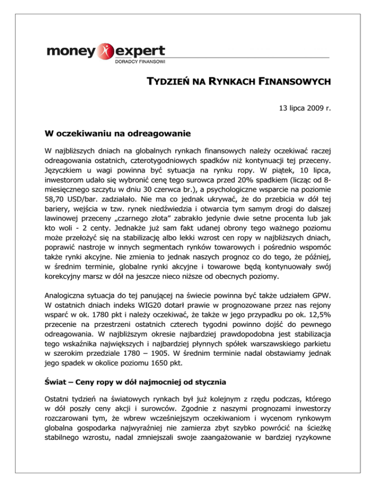TYDZIEŃ NA RYNKACH FINANSOWYCH 13 lipca 2009 r. W oczekiwaniu na odreagowanie W najbliższych dniach na globalnych rynkach finansowych należy oczekiwać raczej odreagowania ostatnich, czterotygodniowych spadków niż kontynuacji tej przeceny. Języczkiem u wagi powinna być sytuacja na rynku ropy. W piątek, 10 lipca, inwestorom udało się wybronić cenę tego surowca przed 20% spadkiem (licząc od 8miesięcznego szczytu w dniu 30 czerwca br.), a psychologiczne wsparcie na poziomie 58,70 USD/bar. zadziałało. Nie ma co jednak ukrywać, że do przebicia w dół tej bariery, wejścia w tzw. rynek niedźwiedzia i otwarcia tym samym drogi do dalszej lawinowej przeceny „czarnego złota” zabrakło jedynie dwie setne procenta lub jak kto woli - 2 centy. Jednakże już sam fakt udanej obrony tego ważnego poziomu może przełożyć się na stabilizację albo lekki wzrost cen ropy w najbliższych dniach, poprawić nastroje w innych segmentach rynków towarowych i pośrednio wspomóc także rynki akcyjne. Nie zmienia to jednak naszych prognoz co do tego, że później, w średnim terminie, globalne rynki akcyjne i towarowe będą kontynuowały swój korekcyjny marsz w dół na jeszcze nieco niższe od obecnych poziomy. Analogiczna sytuacja do tej panującej na świecie powinna być także udziałem GPW. W ostatnich dniach indeks WIG20 dotarł prawie w prognozowane przez nas rejony wsparć w ok. 1780 pkt i należy oczekiwać, że także w jego przypadku po ok. 12,5% przecenie na przestrzeni ostatnich czterech tygodni powinno dojść do pewnego odreagowania. W najbliższym okresie najbardziej prawdopodobna jest stabilizacja tego wskaźnika największych i najbardziej płynnych spółek warszawskiego parkietu w szerokim przedziale 1780 – 1905. W średnim terminie nadal obstawiamy jednak jego spadek w okolice poziomu 1650 pkt. Świat – Ceny ropy w dół najmocniej od stycznia Ostatni tydzień na światowych rynkach był już kolejnym z rzędu podczas, którego w dół poszły ceny akcji i surowców. Zgodnie z naszymi prognozami inwestorzy rozczarowani tym, że wbrew wcześniejszym oczekiwaniom i wycenom rynkowym globalna gospodarka najwyraźniej nie zamierza zbyt szybko powrócić na ścieżkę stabilnego wzrostu, nadal zmniejszali swoje zaangażowanie w bardziej ryzykowne aktywa. Tak jak należało tego oczekiwać, wraz z początkiem nowego miesiąca, kwartału i półrocza skupili się oni jednak przede wszystkim na surowcach. Nie powinno to jednak dziwić, gdyż w I półroczu zarówno ropa, jak i miedź zanotowały gigantyczne wręcz wzrosty, zyskując odpowiednio aż 65,5% i 61,1%. Do zwiększenia się niepewności na rynkach co do perspektyw gospodarczych przyczyniały się zarówno niejednoznaczne dane makro, mieszane informacje ze spółek oraz prognozy MFW. Jeśli chodzi o tę pierwszą kwestię, to w przypadku doniesień z USA lepsze od prognoz okazały się być te dotyczące czerwcowego odczytu indeksu ISM dla sektora usług oraz te o tygodniowym bezrobociu, jednak gorsze od spodziewanych były już te dotyczące nastrojów amerykańskich konsumentów za pierwszą połowę lipca. Z kolei w przypadku wyników kwartalnych sezon ich publikacji otwarty został 8 lipca przez koncern aluminiowy Alcoa, którego rezultaty były nieco lepsze od prognoz. Spółka ta co prawda odnotowała trzecią z rzędu stratę, ale było ona mniejsza od prognozowanej. Niestety jednak już dzień później naftowy Chevron postraszył, że jego wyniki, które upubliczni 31 lipca, mogą rozczarować. Analitycy, ankietowani przez największe agencje informacyjne, spodziewają się, że w II kwartale zysk spółek z indeksu S&P 500 średnio zmniejszył się o 35%, czyli mniej więcej o tyle samo, co w I kwartale, kiedy to spadł o 33%. Mimo że to i tak lepiej niż zanotowane w IV kwartale 2008 r. (-61%), to i tak nadal bardzo, ale to bardzo słabo. Co do prognoz Międzynarodowego Funduszu Walutowego, to z jednej strony były one pozytywne, gdyż instytucja ta podniosła ocenę wzrostu PKB globalnej gospodarki w przyszłym roku do 2,5% z 1,9%, a z drugiej już negatywne, bo „minus” w bieżącym roku ma wynieść nie 1,3%, ale 1,4%. Jakby tego było mało, na rynku pojawiły się głosy odnośnie tego, że Stanom Zjednoczonym potrzebny jest kolejny pakiet stymulacyjny, a mówił o tym nie tylko Warren Buffett, ale też doradczyni prezydenta Obamy, Laura D’Andrea Tyson. Na rynku akcji paneuropejski indeks DJ Stoxx 600 i amerykański indeks S&P 500 spadły o 3,35% i 1,93% czwarty tydzień z rzędu. Podobnie rzecz się miała z ogólnie obrazującym gospodarki rozwinięte indeksem MSCI World (-2,68%). Z kolei dla dalekowschodniego indeksu MSCI Asia Pacific, który zniżkował o 2,11%, był to trzeci, a dla globalnego indeksu MSCI AC World (-2,84%), drugi tydzień przeceny. Mocno w dół, bo o 3,95%, poszedł też indeks MSCI Emerging Markets. Z kolei na rynku surowców indeks Reuters/Jefferies CRB w ujęciu tygodniowym spadł o 5,02% do 233,51. Doszło do tego przy aż 10,25% (do 59,89 USD/bar.) najsilniejszej od stycznia w ujęciu tygodniowym przecenie sierpniowych kontraktów terminowych na lekką słodką ropę notowanych na Nymexie i 4,08% zniżce wrześniowych futuresów na miedź na Comexie (do 2,2115 USD/funt). W dół o 2,4% do 913 USD/oz. poszła w dół także cena złota, a dokładnie kurs XAU/USD. Niewielka tylko zmiana dotyczyła natomiast wartości amerykańskiej waluty. Indeks dolarowy spadł, ale jedynie nieznacznie, bo o 0,19% do 80,233. W przypadku najbardziej płynnej pary walutowej świata, czyli EUR/USD, nastąpiła także delikatna, 0,34% przecena do 1,3934. MSCI AC World MSCI World MSCI Emerging Markets MSCI Asia Pacific DJ Stoxx 600 S&P500 03.07.09 241,24 946,80 766,32 102,80 204,08 896,42 10.07.09 234,39 921,40 736,02 100,63 197,25 879,13 Zmiana -2,84% -2,68% -3,95% -2,11% -3,35% -1,93% EUR/USD Indeks dolarowy spot Kontrakty ropa US Kontrakty miedź US Złoto spot - XAU/USD LIBOR