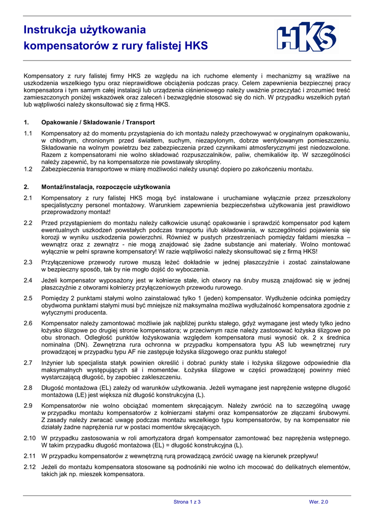 Instrukcja użytkowania kompensatorów z rury falistej HKS Kompensatory z rury falistej firmy HKS ze względu na ich ruchome elementy i mechanizmy są wrażliwe na uszkodzenia wszelkiego typu oraz nieprawidłowe obciążenia podczas pracy. Celem zapewnienia bezpiecznej pracy kompensatora i tym samym całej instalacji lub urządzenia ciśnieniowego należy uważnie przeczytać i zrozumieć treść zamieszczonych poniżej wskazówek oraz zaleceń i bezwzględnie stosować się do nich. W przypadku wszelkich pytań lub wątpliwości należy skonsultować się z firmą HKS. 1. Opakowanie / Składowanie / Transport 1.1 1.2 Kompensatory aż do momentu przystąpienia do ich montażu należy przechowywać w oryginalnym opakowaniu, w chłodnym, chronionym przed światłem, suchym, niezapylonym, dobrze wentylowanym pomieszczeniu. Składowanie na wolnym powietrzu bez zabezpieczenia przed czynnikami atmosferycznymi jest niedozwolone. Razem z kompensatorami nie wolno składować rozpuszczalników, paliw, chemikaliów itp. W szczególności należy zapewnić, by na kompensatorze nie powstawały skropliny. Zabezpieczenia transportowe w miarę możliwości należy usunąć dopiero po zakończeniu montażu. 2. Montaż/instalacja, rozpoczęcie użytkowania 2.1 Kompensatory z rury falistej HKS mogą być instalowane i uruchamiane wyłącznie przez przeszkolony specjalistyczny personel montażowy. Warunkiem zapewnienia bezpieczeństwa użytkowania jest prawidłowo przeprowadzony montaż! 2.2 Przed przystąpieniem do montażu należy całkowicie usunąć opakowanie i sprawdzić kompensator pod kątem ewentualnych uszkodzeń powstałych podczas transportu i/lub składowania, w szczególności pojawienia się korozji w wyniku uszkodzenia powierzchni. Również w pustych przestrzeniach pomiędzy fałdami mieszka – wewnątrz oraz z zewnątrz - nie mogą znajdować się żadne substancje ani materiały. Wolno montować wyłącznie w pełni sprawne kompensatory! W razie wątpliwości należy skonsultować się z firmą HKS! 2.3 Przyłączeniowe przewody rurowe muszą leżeć dokładnie w jednej płaszczyźnie i zostać zainstalowane w bezpieczny sposób, tak by nie mogło dojść do wyboczenia. 2.4 Jeżeli kompensator wyposażony jest w kołnierze stałe, ich otwory na śruby muszą znajdować się w jednej płaszczyźnie z otworami kołnierzy przyłączeniowych przewodu rurowego. 2.5 Pomiędzy 2 punktami stałymi wolno zainstalować tylko 1 (jeden) kompensator. Wydłużenie odcinka pomiędzy obydwoma punktami stałymi musi być mniejsze niż maksymalna możliwa wydłużalność kompensatora zgodnie z wytycznymi producenta. 2.6 Kompensator należy zamontować możliwie jak najbliżej punktu stałego, gdyż wymagane jest wtedy tylko jedno łożysko ślizgowe po drugiej stronie kompensatora; w przeciwnym razie należy zastosować łożyska ślizgowe po obu stronach. Odległość punktów łożyskowania względem kompensatora musi wynosić ok. 2 x średnica nominalna (DN). Zewnętrzna rura ochronna w przypadku kompensatora typu AS lub wewnętrznej rury prowadzącej w przypadku typu AF nie zastępuje łożyska ślizgowego oraz punktu stałego! 2.7 Inżynier lub specjalista statyk powinien określić i dobrać punkty stałe i łożyska ślizgowe odpowiednie dla maksymalnych występujących sił i momentów. Łożyska ślizgowe w części prowadzącej powinny mieć wystarczającą długość, by zapobiec zakleszczeniu. 2.8 Długość montażowa (EL) zależy od warunków użytkowania. Jeżeli wymagane jest naprężenie wstępne długość montażowa (LE) jest większa niż długość konstrukcyjna (L). 2.9 Kompensatorów nie wolno obciążać momentem skręcającym. Należy zwrócić na to szczególną uwagę w przypadku montażu kompensatorów z kołnierzami stałymi oraz kompensatorów ze złączami śrubowymi. Z zasady należy zwracać uwagę podczas montażu wszelkiego typu kompensatorów, by na kompensator nie działały żadne naprężenia rur w postaci momentów skręcających. 2.10 W przypadku zastosowania w roli amortyzatora drgań kompensator zamontować bez naprężenia wstępnego. W takim przypadku długość montażowa (EL) = długość konstrukcyjna (L). 2.11 W przypadku kompensatorów z wewnętrzną rurą prowadzącą zwrócić uwagę na kierunek przepływu! 2.12 Jeżeli do montażu kompensatora stosowane są podnośniki nie wolno ich mocować do delikatnych elementów, takich jak np. mieszek kompensatora. Strona 1 z 3 Wer. 2.0 Instrukcja użytkowania kompensatorów z rury falistej HKS 2.13 Kontrolę ciśnieniową oraz kontrolę szczelności układu przeprowadzać dopiero po prawidłowo wykonanym montażu punktów stałych i łożysk prowadzących. 2.14 Podczas montażu uważać, by nie zostały uszkodzone mieszki kompensatorów (np. przez odpryski spawalnicze, obciążenia termiczne, uszkodzenia mechaniczne, wgniecenia, zarysowania, obciążenia udarowe, spadające przedmioty, zabrudzenia, itp.) oraz aby pomiędzy fałdy nie dostały się żadne ciała obce. Fałdy muszą być i pozostawać zarówno z zewnątrz jak i w wewnątrz swobodne, aby kompensator mógł spełnić swoją rolę. 2.15 Napinacze należy usunąć dopiero po zakończeniu montażu kompensatora. 2.16 Izolacje wolno umieszczać jedynie po uprzedniej konsultacji z firmą HKS i nie na mieszku kompensatora. 2.17 Kompensator nie może służyć jako przewodnik dla prądu elektrycznego, np. podczas prac spawalniczych, gdyż grozi to uszkodzeniem metalowego mieszka. 2.18 Kompensator należy zainstalować w taki sposób, by możliwym było przeprowadzanie w regularnych odstępach czasu pełnej kontroli wzrokowej pod kątem uszkodzeń. W przypadku widocznych uszkodzeń w postaci np. wgnieceń, pęknięć, korozji, przebarwień lub nieregularnych odkształceń należy niezwłocznie powiadomić firmę HKS i/lub wymienić kompensator. 2.19 Należy bezwzględnie stosować się do powszechnie obowiązujących przepisów w zakresie bezpieczeństwa ora