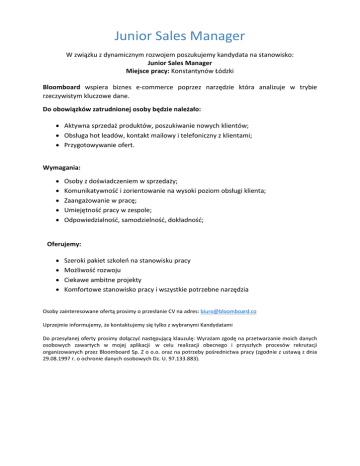 Junior Sales Manager W związku z dynamicznym rozwojem poszukujemy kandydata na stanowisko: Junior Sales Manager Miejsce pracy: Konstantynów Łódzki Bloomboard wspiera biznes e-commerce poprzez narzędzie która analizuje w trybie rzeczywistym kluczowe dane. Do obowiązków zatrudnionej osoby będzie należało:  Aktywna sprzedaż produktów, poszukiwanie nowych klientów;  Obsługa hot leadów, kontakt mailowy i telefoniczny z klientami;  Przygotowywanie ofert. Wymagania:      Osoby z doświadczeniem w sprzedaży; Komunikatywność i zorientowanie na wysoki poziom obsługi klienta; Zaangażowanie w pracę; Umiejętność pracy w zespole; Odpowiedzialność, samodzielność, dokładność; Oferujemy:     Szeroki pakiet szkoleń na stanowisku pracy Możliwość rozwoju Ciekawe ambitne projekty Komfortowe stanowisko pracy i wszystkie potrzebne narzędzia Osoby zainteresowane ofertą prosimy o przesłanie CV na adres: [email protected] Uprzejmie informujemy, że kontaktujemy się tylko z wybranymi Kandydatami Do przesyłanej oferty prosimy dołączyć następującą klauzulę: Wyrażam zgodę na przetwarzanie moich danych osobowych zawartych w mojej aplikacji w celu realizacji obecnego i przyszłych procesów rekrutacji organizowanych przez Bloomboard Sp. Z o o.o. oraz na potrzeby pośrednictwa pracy (zgodnie z ustawą z dnia 29.08.1997 r. o ochronie danych osobowych Dz. U. 97.133.883).
