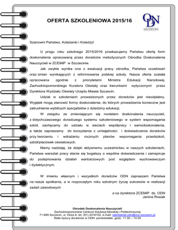 OFERTA SZKOLENIOWA 2015/16 Szanowni Państwo, Koleżanki i Koledzy! U progu roku szkolnego 2015/2016 przekazujemy Państwu ofertę form doskonalenia opracowaną przez doradców metodycznych Ośrodka Doskonalenia Nauczycieli w ZCEMiP w Szczecinie. Jak zwykle wynika ona z ewaluacji pracy ośrodka, Państwa oczekiwań oraz zmian wynikających z reformowania polskiej szkoły. Nasza oferta została opracowana zgodnie z priorytetami Ministra Edukacji Zachodniopomorskiego Kuratora Oświaty oraz kierunkami Narodowej, wytyczonymi przez Dyrektora Wydziału Oświaty Urzędu Miasta Szczecin. Udział w szkoleniach prowadzonych przez doradców jest nieodpłatny. Wyjątek mogą stanowić formy doskonalenia, do których prowadzenia konieczne jest zatrudnienie wybitnych specjalistów z dziedziny edukacji. W związku ze zmieniającym się modelem doskonalenia nauczycieli, z dotychczasowego doradczego systemu szkoleniowego w system wspomagania szkół, zachęcamy do udziału w sieciach współpracy i samodoskonalenia, a także zapraszamy przy tworzeniu i do korzystania z umiejętności wdrażaniu rocznych planów i doświadczenia doradców wspomagania przedszkoli, szkół/placówek oświatowych. Mamy nadzieję, że dzięki aktywnemu uczestnictwu w naszych szkoleniach, Państwa warsztat pracy stanie się bogatszy o wspólne doświadczenia i zainspiruje do podejmowania działań wartościowych pod względem wychowawczym i dydaktycznym. W imieniu własnym i wszystkich doradców ODN zapraszam Państwa na nasze spotkania, a w rozpoczętym roku szkolnym życzę sukcesów w realizacji zadań zawodowych z-ca dyrektora ZCEMiP ds. ODN Janina Rosiak Ośrodek Doskonalenia Nauczycieli Zachodniopomorskie Centrum Edukacji Morskiej i Politechnicznej 71-699 Szczecin, ul. Hoża 6, tel. (91) 4316102, e-mail: [email protected] Stałe dyżury doradców w ODN: poniedziałek, godz. 11:30 – 14:30 OFERTA SZKOLENIOWA 2015/16 Tytuł szkolenia: PODSTAWA PROGRAMOWA Z CHEMII W ZAKRESIE PODSTAWOWYM, A TREŚCI KSZTAŁCENIA ZAWARTE W PODRĘCZNIKACH Obszar edukacji: chemia Adresaci szkolenia: nauczyciele szkół ponadgimnazjalnych Cele szkolenia: po zakończeniu szkolenia nauczyciel: analizuje podstawę programową z chemii w zakresie podstawowym na IV etapie edukacji selekcjonuje informacje zawarte w podręcznikach w kontekście podstawy programowej wybiera z podręcznika treści kształcenia niezbędne do prawidłowej realizacji podstawy Liczba godzin: 6 Proponowane terminy szkoleń: październik, listopad, luty, marzec, kwiecień Miejsce przeprowadzenia szkolenia: VI LO w Szczecinie, ul. Jagiellońska 41 Doradca ODN odpowiedzialny za organizację: Katarzyna Kurpios Osoba prowadząca szkolenie: Katarzyna Kurpios Zgłoszenia indywidualne i grupowe, wyłącznie w formie elektronicznej, na formularzach pobranych ze strony ODN http://odn.zce.szczecin.pl/oferta.htm, należy przesyłać na adres e-mail: [email protected] Udział w szkoleniu jest bezpłatny. Szkolenie zostanie zrealizowane, jeśli zbierze się minimum 10 osób. Ośrodek Doskonalenia Nauczycieli Zachodniopomorskie Centrum Edukacji Morskiej i Politechnicznej 71-699 Szczecin, ul. Hoża 6, tel. (91) 4316102, e-mail: [email protected] Stałe dyżury doradców w ODN: poniedziałek, godz. 11:30 – 14:30 OFERTA SZKOLENIOWA 2015/16 Tytuł szkolenia: OBOWIĄZKOWE DOŚWIADCZENIA Z CHEMII W LICEUM Obszar edukacji: chemia Adresaci szkolenia: nauczyciele chemii liceum Cele szkolenia: po zakończeniu szkolenia nauczyciel: analizuje podstawę programową z chemii w zakresie podstawowym na IV etapie edukacji w kontekście obowiązkowych doświadczeń uczniowskich przygotowuje projekty doświadczeń przygotowuje niezbędny sprzęt, szkło i odczynniki chemiczne Liczba godzin: 6 Proponowane terminy szkoleń: październik, listopad, luty, marzec, kwiecień Miejsce przeprowadzenia szkolenia: VI LO w Szczecinie, ul. Jagiellońska 41 Doradca ODN odpowiedzialny za organizację: Katarzyna Kurpios Osoba prowadząca szkolenie: Katarzyna Kurpios Zgłoszenia indywidualne i grupowe, wyłącznie w formie elektronicznej, na formularzach pobranych ze strony ODN http://odn.zce.szczecin.pl/oferta.htm, należy przesyłać na adres e-mail: [email protected] Udział w szkoleniu jest bezpłatny. Szkolenie zostanie zrealizowane, jeśli zbierze się minimum 10 osób. Ośrodek Doskonalenia Nauczycieli Zachodniopomorskie Centrum Edukacji Morskiej i Politechnicznej 71-699 Szczecin, ul. Hoża 6, tel. (91) 4316102, e-mail: [email protected] Stałe dyżury doradców w ODN: poniedziałek, godz. 11:30 – 14:30 OFERTA SZKOLENIOWA 2015/16 Tytuł szkolenia: OBOWIĄZKOWE DOŚWIADCZENIA Z CHEMII W GIMNAZJUM Obszar edukacji: chemia Adresaci szkolenia: nauczyciele chemii gimnazjum Cele szkolenia: po zakończeniu szkolenia nauczyciel: analizuje podstawę programową z chemii w zakresie podstawowym na III etapie edukacji w kontekście obowiązkowych doświadczeń uczniowskich przygotowuje projekty doświadczeń przygotowuje niezbędny sprzęt, szkło i odczynniki chemiczne Liczba godzin: 6 Proponowane terminy szkoleń: październik, listopad, luty, marzec, kwiecień Miejsce przeprowadzenia szkolenia: VI LO w Szczecinie, ul. Jagiellońska 41 Doradca ODN odpowiedzialny za organizację: Katarzyna Kurpios Osoba prowadząca szkolenie: Katarzyna Kurpios Zgłoszenia indywidualne i grupowe, wyłącznie w formie elektronicznej, na formularzach pobranych ze strony ODN http://odn.zce.szczecin.pl/oferta.htm, należy przesyłać na adres e-mail: [email protected] Udział w szkoleniu jest bezpłatny. Szkolenie zostanie zrealizowane, jeśli zbierze się minimum 10 osób. Ośrodek Doskonalenia Nauczycieli Zachodniopomorskie Centrum Edukacji Morskiej i Politechnicznej 71-699 Szczecin, ul. Hoża 6, tel. (91) 4316102, e-mail: [email protected] Stałe dyżury doradców w ODN: poniedziałek, godz. 11:30 – 14:30 OFERTA SZKOLENIOWA 2015/16 Tytuł szkolenia: MATURA Z CHEMII - KONSTRUOWANIE ZADAŃ PROBLEMOWYCH, WIELOPUNKTOWYCH Obszar edukacji: chemia Ad