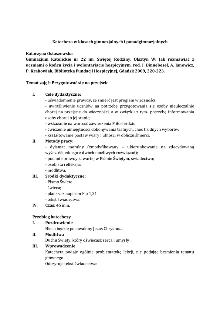 Katecheza w klasach gimnazjalnych i ponadgimnazjalnych Katarzyna Ostaszewska Gimnazjum Katolickie nr 22 im. Świętej Rodziny, Olsztyn W: Jak rozmawiać z uczniami o końcu życia i wolontariacie hospicyjnym, red. J. Binnebesel, A. Janowicz, P. Krakowiak, Biblioteka Fundacji Hospicyjnej, Gdańsk 2009, 220-223. Temat zajęć: Przygotować się na przejście I. II. III. IV. Cele dydaktyczne: - uświadomienie prawdy, że śmierć jest progiem wieczności; - uwrażliwienie uczniów na potrzebę przygotowania się osoby nieuleczalnie chorej na przejście do wieczności, a w związku z tym- potrzebę informowania osoby chorej o jej stanie; - wskazanie na wartość zawierzenia Miłosierdziu; - ćwiczenie umiejętności dokonywania trafnych, choć trudnych wyborów; - kształtowanie postaw wiary i ufności w obliczu śmierci. Metody pracy: - dylemat moralny (zmodyfikowany – ukierunkowanie na zdecydowaną wyższość jednego z dwóch możliwych rozwiązań); - podanie prawdy zawartej w Piśmie Świętym, świadectwo; - osobista refleksja; - modlitwa. Środki dydaktyczne: - Pismo Święte - świeca; - plansza z napisem Flp 1,21 - tekst świadectwa. Czas: 45 min. Przebieg katechezy I. Pozdrowienie Niech będzie pochwalony Jezus Chrystus… II. Modlitwa Duchu Święty, który oświecasz serca i umysły… III. Wprowadzenie Katecheta podaje ogólnie problematykę lekcji, nie podając brzmienia tematu głównego. Odczytuje tekst świadectwa: Zabolała mnie noga, trochę spuchła. Nic strasznego. Po paru dniach dołączyła się dość mocna zadyszka. Poszedłem do lekarza.. zbadał, posłuchał, pomyślał i dał skierowanie do szpitala. Zaczęło się leczenie. Prawie standard. Następnie odczytuje tekst – rozterki pani ordynator oddziału: Zrobiłam parę dodatkowych badań i okazało się, że pacjent będący prawie okazem zdrowia fizycznego i najlepszego samopoczucia… jest człowiekiem umierającym. Pacjent jest 25-letnim człowiekiem, właściwie w swej świadomości stoi u progu życia. Jak mu powiedzieć o jego stanie? A może nic nie mówić? (jeśli potrzeba, katecheta odczytuje tekst jeszcze raz) IV. Aktywizacja 1. Konfrontacja z dylematem Katecheta stawia pytanie: Co powinna zrobić pani ordynator: powiedzieć pacjentowi prawdę czy też zataić ją? Uczniowie zastanawiają się nad swoim stanowiskiem oraz decydują, które z dwóch rozwiązań uważają za bardziej słuszne. Jest to czas na samodzielną pracę ucznia, powinna ona odbywać się w ciszy (czas ok. 1-2 min.). Katecheta ustala, na podstawie deklaracji uczniów, kto jest za pierwszym, kto za drugim rozwiązaniem. Dzieli klasę na dwie różniące się opiniami grupy, które następnie zajmują miejsca naprzeciw siebie. 2. „Rozgrzewka”, czyli podawanie argumentów Grupy, zachowując zasadę udzielania głosu, podają argumenty uzasadniające zajęte stanowisko. Uczniowie podają argumenty – najpierw z jednej grupy, potem z drugiej. Katecheta nie może dopuścić do dyskusji, ani też do tego, aby kolejny argument był wypowiedziany jako bezpośrednia reakcja na słowa przeciwnika. Musi dopilnować, aby uczniowie słuchali argumentów grupy przeciwnej. 3. Praca w grupach Katecheta każdą z grup dzieli na podgrupy – 2-3 osobowe. Uczniowie w utworzonych mniejszych grupach dokonują oceny argumentów popierających ich stanowisko i zastanawiają się który z nich jest najbardziej przekonujący. Ustalają wartości skłaniające do dokonania takiego a nie innego wyboru, poszukują możliwych konsekwencji podjętej decyzji. 4. Prezentacja owoców pracy i refleksja na forum Uczniowie z małych grup na przemian prezentują efekty swojej pracy: odczytują najsilniejsze argumenty, wartości leżące u podstaw podjętej decyzji oraz zidentyfikowane przykre konsekwencje zajętego stanowiska. Katecheta zachęca uczniów argumentów strony przeciwnej. V. do wypowiadania najwartościowszych Puenta Katecheta odczytuje dalszą część świadectwa: Pani ordynator po rannym obchodzie poprosiła mnie do swego gabinetu i zakomunikowała mi mój stan oględnie i delikatnie, choć bardzo jasno. Słuchałem tego w tym pokoju pogrążonym w lekkim półmroku jak strasznej bajki. Rozbudzona wyobraźnia snuła obrazy malowane czarną rozpaczą. Obolałe i nikomu niepotrzebne ciało, z dnia na dzień coraz słabsze i coraz bardziej odrażające swym wychudzeniem. Chude kości i płonące gorączką oczy, wypatrujące każdej iskierki nadziei. A wreszcie ostatnie akordy w przerażającym skowycie obolałej duszy i wyniszczonego ciała, i ten najgorszy koniec, zanurzony w mrocznych oparach niebytu i niepewności, dodatkowo zagłuszany odgłosami aparatury medycznej ostatniej posługi. Podziękowałem i wyszedłem z tego mrocznego pomieszczenia, pijany czarnym nieszczęściem. Chwila na refleksję w ciszy. Wyszedłem przed budynek szpitalny i usiadłem na ławce przy niewielkim skwerku. Spojrzałem w wyzłocone słońcem niebo, po którym wiatr leniwie przepędzał niewielkie chmurki i gdzie tańczyła w locie cała gromada jaskółek. I nagłe olśnienie – to Bóg woła mnie po imieniu. Dociera do mej świadomości radosna wieść, że mój Stwórca bardzo mnie kocha, jeśli pozwala mi dotknąć zakrytych tajemnic przyszłości i mojego „odlotu”. Konsultacje w Instytucie Onkologii w Gliwicach potwierdziły szpitalne rozpoznanie, a czas „odlotu” ustalony na tygodnie, najwyżej miesiące, choć jak wszystko, co podlega nieubłagalnej statystyce, jest jednak w ręku Boga. Wszystko zawierzyłem dobremu i miłosiernemu Bogu. Uświadomiłem sobie, że kochający Bóg dał mi czas na uporządkowanie wszystkich spraw ziemskich i dobre przygotowanie się do tych ostatecznych. Odnalazłem niewielką książeczkę zakonnika Paula O’Sullivana pod znamiennym tytułem „Jak uniknąć czyśćca”, której wskazania zacząłem realizować bardzo skrupulatnie. Teraz z radosną niecierpliwością oczekuję realizacji tej cudownej zapowiedzi, o k