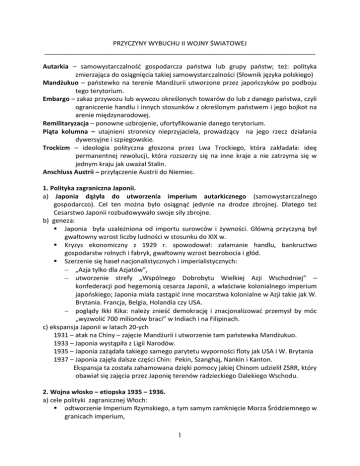 PRZYCZYNY WYBUCHU II WOJNY ŚWIATOWEJ ___________________________________________________________________________ Autarkia – samowystarczalnośd gospodarcza paostwa lub grupy paostw; też: polityka zmierzająca do osiągnięcia takiej samowystarczalności (Słownik języka polskiego) Mandżukuo – paostewko na terenie Mandżurii utworzone przez japooczyków po podboju tego terytorium. Embargo – zakaz przywozu lub wywozu określonych towarów do lub z danego paostwa, czyli ograniczenie handlu i innych stosunków z określonym paostwem i jego bojkot na arenie międzynarodowej. Remilitaryzacja – ponowne uzbrojenie, ufortyfikowanie danego terytorium. Piąta kolumna – utajnieni stronnicy nieprzyjaciela, prowadzący na jego rzecz działania dywersyjne i szpiegowskie. Trockizm – ideologia polityczna głoszona przez Lwa Trockiego, która zakładała: ideę permanentnej rewolucji, która rozszerzy się na inne kraje a nie zatrzyma się w jednym kraju jak uważał Stalin. Anschluss Austrii – przyłączenie Austrii do Niemiec. 1. Polityka zagraniczna Japonii. a) Japonia dążyła do utworzenia imperium autarkicznego (samowystarczalnego gospodarczo). Cel ten można było osiągnąd jedynie na drodze zbrojnej. Dlatego też Cesarstwo Japonii rozbudowywało swoje siły zbrojne. b) geneza: Japonia była uzależniona od importu surowców i żywności. Główną przyczyną był gwałtowny wzrost liczby ludności w stosunku do XIX w. Kryzys ekonomiczny z 1929 r. spowodował: załamanie handlu, bankructwo gospodarstw rolnych i fabryk, gwałtowny wzrost bezrobocia i głód. Szerzenie się haseł nacjonalistycznych i imperialistycznych: „Azja tylko dla Azjatów”, utworzenie strefy „Wspólnego Dobrobytu Wielkiej Azji Wschodniej” – konfederacji pod hegemonią cesarza Japonii, a właściwie kolonialnego imperium japooskiego; Japonia miała zastąpid inne mocarstwa kolonialne w Azji takie jak W. Brytania. Francja, Belgia, Holandia czy USA. poglądy Ikki Kika: należy znieśd demokrację i znacjonalizowad przemysł by móc „wyzwolid 700 milionów braci” w Indiach i na Filipinach. c) ekspansja Japonii w latach 20-ych 1931 – atak na Chiny – zajęcie Mandżurii i utworzenie tam paostewka Mandżukuo. 1933 – Japonia wystąpiła z Ligii Narodów. 1935 – Japonia zażądała takiego samego parytetu wyporności floty jak USA i W. Brytania 1937 – Japonia zajęła dalsze części Chin: Pekin, Szanghaj, Nankin i Kanton. Ekspansja ta została zahamowana dzięki pomocy jakiej Chinom udzielił ZSRR, który obawiał się zajęcia przez Japonię terenów radzieckiego Dalekiego Wschodu. 2. Wojna włosko – etiopska 1935 – 1936. a) cele polityki zagranicznej Włoch: odtworzenie Imperium Rzymskiego, a tym samym zamknięcie Morza Śródziemnego w granicach imperium, 1 wzmocnienie mocarstwowości Włoch poprzez podniesienie autorytetu paostwa, odwrócenie uwagi opinii publicznej od problemów społecznych i ekonomicznych; ekspansja miała pomóc w ich rozwiązaniu. b) Etiopia była niepodległym paostwem, monarchią, na czele której stał cesarz Hajle Sellasje; członkiem Ligi Narodów. c) przebieg konfliktu: 1934 – tajne układy włosko – francuski i włosko – angielski, w którym rządy tych paostw wyrażają zgodę na zajęcie przez Włochy części terytorium Etiopii. 1935 – agresja Włoch na Etiopię (Abisynię) Liga Narodów nałożyła sankcje ekonomiczne na Włochy – zablokowano kredyty międzynarodowe i wprowadzono zakaz handlu z Włochami (z embarga wyłączono węgiel, stal i ropę). 1936 – zakooczenie podboju Etiopii. Ogłoszono powstanie Drugiego Imperium Rzymskiego. 3. Zbrojenia Niemiec 1935 r. i remilitaryzacja Nadrenii w 1936 r. a) cele polityki zagranicznej III Rzeszy Hitler przejął pełnię władzy w paostwie po śmierci Hindenburga już w 1934 r. Wówczas rozpoczął realizowad swój plan „zdobycia przestrzeni życiowej” dla Niemców i przekształcenia III Rzeszy w mocarstwo. By to osiągnąd musiał zbudowad potężną armię, a tym samym „złamad dyktat wersalski” – postanowienia traktatu wersalskiego. b) w 1935 r. wprowadzono w Niemczech powszechną służbę wojskową, utworzono lotnictwo i rozbudowano marynarkę wojenną, a także utworzono sztab generalny. Ani Francja ani Wielka Brytania nie podjęły żadnych działao przeciwko Niemcom. W. Brytania podpisała z Hitlerem układ morski, w którym ustalono wysokośd tonażu niemieckiej floty na 35% tonażu floty brytyjskiej. c) w 1936 r. wojska niemieckie wkroczyły do Nadrenii, którą remilitaryzowano. ) i wypowiedziały układy lokarneoskie z 1925 ( o gwarancji nienaruszalności swojej zachodniej granicy). Francja i Wielka Brytania zdobyły się jedynie na protesty dyplomatyczne lecz nie podjęły żadnych zdecydowanych kroków, co tym bardziej umocniło Hitlera w przekonaniu, że jest bezkarny. W odpowiedzi Belgia zerwała sojusz militarny z Francją i ogłosiła swoją neutralnośd. 4. Hiszpaoska wojna domowa 1936 – 1939 a) geneza wojny: Hiszpania miała krótką historię demokracji – była republiką parlamentarną dopiero od 1931 r. Była krajem niestabilnym, w którym rywalizowało ze sobą wiele stronnictw politycznych. od 1936 r. władzę w paostwie przejął rząd lewicowy (Front Ludowy), który był koalicją partii republikaoskich, socjalistycznych, trockistowskich i komunistycznych. Rozpoczął on program reform wymierzonych w duchowieostwo i w armię. Armią podległa redukcji, a na duchowieostwo spadły represje. W paostwie szerzył się chaos – dochodziło do mordów politycznych i strajków, wzrastało bezrobocie,. Polityce nowego rządu sprzeciwiła się grupa oficerów, która spróbowała przejąd władzę. Na czele puczu stanęli gen. Emilio Mola Vidal, gen. José Sanjurjo y Scannell i gen. Francisco Franco. Buntowników poparła prawica, głownie hiszpaoscy faszyści skupieni w partii Falanga Hiszpaoska oraz monarchiści. 2 b) wojna domowa wybuchła w lipcu 1936 r. Sił