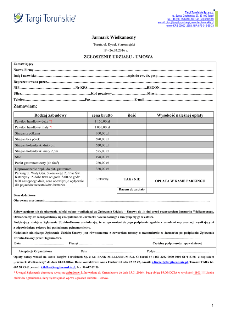 Targi Toruńskie Sp. z o.o. ul. Szosa Chełmińska 27, 87-100 Toruń tel. +48 (56) 6582090, fax +48 (56) 6582099 e-mail: [email protected], www.targitorunskie.pl numer KRS 0000012502, NIP: 879-016-69-33 Jarmark Wielkanocny Toruń, ul. Rynek Staromiejski 18 - 26.03.2016 r. ZGŁOSZENIE UDZIAŁU - UMOWA Zamawiający: Nazwa Firmy…………………………………………………………………………………………….…………………………………………… Imię i nazwisko…………….….……………………………………………………wpis do ew. dz. gosp…………….…………………………… Reprezentowana przez………………………………………….…………………………………………………………………………………… NIP………………….………………..……..Nr KRS…………………………………………….REGON………………………………...……… Ulica…………………………………………………….Kod pocztowy………………………….Miasto……………………………...………..… Telefon……………………………………………..Fax………………………….……..E-mail…………………………………………………… Zamawiam: Rodzaj zabudowy cena brutto Pawilon handlowy duży *1 1 160,00 zł Pawilon handlowy mały *1 1 005,00 zł Stragan z półkami 760,00 zł Stragan bez półek 690,00 zł Stragan holenderski duży 3m 620,00 zł Stragan holenderski mały 2,5m 575,00 zł Stół 198,00 zł 2 Punkt gastronomiczny (do 6m ) 760,00 zł Doprowadzenie prądu do pkt. gastronom. Parking ul. Wały Gen. Sikorskiego 23/Plac Św. Katarzyny 15 doba trwa od godz. 8.00 do godz. 8.00 następnego dnia, cena obowiązuje wyłącznie dla pojazdów uczestników Jarmarku 360,00 zł 3 zł/dobę ilość Wysokość należnej opłaty TAK / NIE OPŁATA W KASIE PARKINGU Razem do zapłaty Dane dodatkowe: Oferowany asortyment:……………………………………….………………………….………………………………………………………………………….. Zobowiązujemy się do uiszczenia całości opłaty wynikającej ze Zgłoszenia Udziału – Umowy do 14 dni przed rozpoczęciem Jarmarku Wielkanocnego. Oświadczamy, że zaznajomiliśmy się z Regulaminem Jarmarku Wielkanocnego i akceptujemy go w całości. Podpisujący niniejsze Zgłoszenie Udziału-Umowę oświadczają, że są uprawnieni do jego podpisania zgodnie z zasadami reprezentacji wynikającymi z odpowiedniego rejestru lub posiadanego pełnomocnictwa. Nadesłanie niniejszego Zgłoszenia Udziału-Umowy jest równoznaczne z zawarciem umowy o uczestnictwie w Jarmarku po podpisaniu Zgłoszenia Udziału-Umowy przez Organizatora. Data …………………………………… Akceptacja Organizatora …………………………………………. Pieczęć …………………………… Data ……………………………………… Czytelny podpis osoby upoważnionej Podpis ……………………………………………. Opłaty należy wnosić na konto Targów Toruńskich Sp. z o.o. BANK MILLENNIUM S.A. O/Toruń 67 1160 2202 0000 0000 6171 8758 z dopiskiem „Jarmark Wielkanocny” do dnia 04.03.2016r. Dane kontaktowe: Anna Fischer tel. 606 22 82 47, e-mail: [email protected], Tomasz Tlałka tel. 602 70 93 61, e-mail: [email protected], fax 56 612 02 56 * Uwaga! Zgłoszenia dotyczące wynajmu zabudowy, które wpłyną do Organizatora do dnia 15.01.2016r., będą objęte PROMOCJĄ w wyskości -10%!!!! Liczba obiektów ograniczona, liczy się kolejność wpłwu Zgłoszeń Udziału – Umów. 1