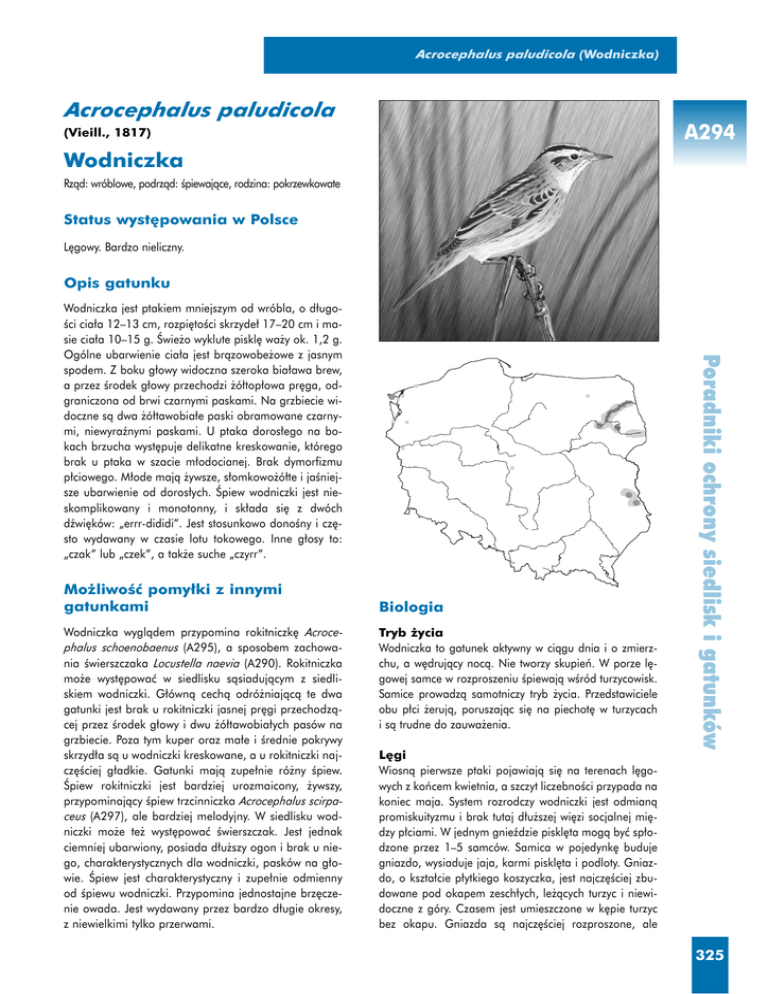 Acrocephalus paludicola (Wodniczka) Acrocephalus paludicola A294 (Vieill., 1817) Wodniczka Rzàd: wróblowe, podrzàd: Êpiewajàce, rodzina: pokrzewkowate Status wyst´powania w Polsce L´gowy. Bardzo nieliczny. Opis gatunku wodniczka Mo˝liwoÊç pomy∏ki z innymi gatunkami Wodniczka wyglàdem przypomina rokitniczk´ Acrocephalus schoenobaenus (A295), a sposobem zachowania Êwierszczaka Locustella naevia (A290). Rokitniczka mo˝e wyst´powaç w siedlisku sàsiadujàcym z siedliskiem wodniczki. G∏ównà cechà odró˝niajàcà te dwa gatunki jest brak u rokitniczki jasnej pr´gi przechodzàcej przez Êrodek g∏owy i dwu ˝ó∏tawobia∏ych pasów na grzbiecie. Poza tym kuper oraz ma∏e i Êrednie pokrywy skrzyd∏a sà u wodniczki kreskowane, a u rokitniczki najcz´Êciej g∏adkie. Gatunki majà zupe∏nie ró˝ny Êpiew. Âpiew rokitniczki jest bardziej urozmaicony, ˝ywszy, przypominajàcy Êpiew trzcinniczka Acrocephalus scirpaceus (A297), ale bardziej melodyjny. W siedlisku wodniczki mo˝e te˝ wyst´powaç Êwierszczak. Jest jednak ciemniej ubarwiony, posiada d∏u˝szy ogon i brak u niego, charakterystycznych dla wodniczki, pasków na g∏owie. Âpiew jest charakterystyczny i zupe∏nie odmienny od Êpiewu wodniczki. Przypomina jednostajne brz´czenie owada. Jest wydawany przez bardzo d∏ugie okresy, z niewielkimi tylko przerwami. Biologia Tryb ˝ycia Wodniczka to gatunek aktywny w ciàgu dnia i o zmierzchu, a w´drujàcy nocà. Nie tworzy skupieƒ. W porze l´gowej samce w rozproszeniu Êpiewajà wÊród turzycowisk. Samice prowadzà samotniczy tryb ˝ycia. Przedstawiciele obu p∏ci ˝erujà, poruszajàc si´ na piechot´ w turzycach i sà trudne do zauwa˝enia. Poradniki ochrony siedlisk i gatunków Wodniczka jest ptakiem mniejszym od wróbla, o d∏ugoÊci cia∏a 12–13 cm, rozpi´toÊci skrzyde∏ 17–20 cm i masie cia∏a 10–15 g. Âwie˝o wyklute piskl´ wa˝y ok. 1,2 g. Ogólne ubarwienie cia∏a jest bràzowobe˝owe z jasnym spodem. Z boku g∏owy widoczna szeroka bia∏awa brew, a przez Êrodek g∏owy przechodzi ˝ó∏top∏owa pr´ga, odgraniczona od brwi czarnymi paskami. Na grzbiecie widoczne sà dwa ˝ó∏tawobia∏e paski obramowane czarnymi, niewyraênymi paskami. U ptaka doros∏ego na bokach brzucha wyst´puje delikatne kreskowanie, którego brak u ptaka w szacie m∏odocianej. Brak dymorfizmu p∏ciowego. M∏ode majà ˝ywsze, s∏omkowo˝ó∏te i jaÊniejsze ubarwienie od doros∏ych. Âpiew wodniczki jest nieskomplikowany i monotonny, i sk∏ada si´ z dwóch dêwi´ków: „errr-dididi”. Jest stosunkowo donoÊny i cz´sto wydawany w czasie lotu tokowego. Inne g∏osy to: „czak” lub „czek”, a tak˝e suche „czyrr”. L´gi Wiosnà pierwsze ptaki pojawiajà si´ na terenach l´gowych z koƒcem kwietnia, a szczyt liczebnoÊci przypada na koniec maja. System rozrodczy wodniczki jest odmianà promiskuityzmu i brak tutaj d∏u˝szej wi´zi socjalnej mi´dzy p∏ciami. W jednym gnieêdzie piskl´ta mogà byç sp∏odzone przez 1–5 samców. Samica w pojedynk´ buduje gniazdo, wysiaduje jaja, karmi piskl´ta i podloty. Gniazdo, o kszta∏cie p∏ytkiego koszyczka, jest najcz´Êciej zbudowane pod okapem zesch∏ych, le˝àcych turzyc i niewidoczne z góry. Czasem jest umieszczone w k´pie turzyc bez okapu. Gniazda sà najcz´Êciej rozproszone, ale 325 Ptaki (cz´Êç II) Poradniki ochrony siedlisk i gatunków A294 w miejscach szczególnie obfitujàcych w pokarm wyst´pujà w wi´kszym zag´szczeniu. NajwczeÊniejsze l´gi rozpoczynajà si´ (z∏o˝enie pierwszego jaja) pod koniec pierwszej dekady maja. W Kotlinie Biebrzaƒskiej Êrednia data rozpoczynania 1. l´gu przypada∏a mi´dzy 15 i 22 maja, a 2. l´gu – mi´dzy 20 czerwca i 4 lipca. Do 2. l´gu przyst´puje mniej samic ni˝ do pierwszego. WielkoÊç zniesienia wynosi 3–6 jaj, zniesienia zawierajàce 5 jaj sà najcz´stsze. Okres wysiadywania trwa 14–16 dni. Piskl´ta przebywajà w gnieêdzie zwykle 14–17 dni, a osiàgajà samodzielnoÊç po 19–23 dniach od opuszczenia gniazda. Dojrza∏oÊç p∏ciowà osiàgajà pod koniec pierwszego roku ˝ycia i w drugim kalendarzowym roku ˝ycia pierwszy raz przyst´pujà do l´gów. Zag´szczenie w Kotlinie Biebrzaƒskiej w ró˝nych latach i miejscach wynosi∏o 1–11 samców/10 ha i 1–16 samic/10 ha. W´drówki W Kotlinie Biebrzaƒskiej liczebnoÊç wodniczek zaczyna si´ wyraênie zmniejszaç z koƒcem lipca i wi´kszoÊç ich znika z tego terenu przed koƒcem sierpnia. Wyniki obràczkowania i bezpoÊrednie obserwacje wskazujà, ˝e poczàtkowo lecà one na zachód wzd∏u˝ wybrze˝y Morza Pó∏nocnego i Kana∏u La Manche. WiadomoÊci powrotne o l´gowych wodniczkach zaobràczkowanych na Bagnach Biebrzaƒskich pochodzà z sierpnia z wybrze˝y Belgii, Walii, Normandii i Hiszpanii, co wskazuje, ˝e ogólnie kierujà si´ na CieÊnin´ Gibraltarskà. Równie˝ przelot wiosenny tà trasà jest wzgl´dnie dobrze udokumentowany. Poza tym sporadyczne obserwacje wodniczek w okresie w´drówki jesiennej pochodzà z ró˝nych miejsc kontynentu europejskiego, w tym równie˝ obserwacja sierpniowa z Grecji i wrzeÊniowa z Krety, co sugeruje istnienie tak˝e wschodniej trasy w´drówki lub przelotu szerokim frontem. Za istnieniem wschodniej trasy przemawia fakt regularnego obràczkowania wodniczek w Bu∏garii podczas przelotu jesiennego (sierpieƒ–paêdziernik), a tak˝e w mniejszej liczbie w maju, w czasie w´drówki wiosennej. Zimowanie Zimowanie wodniczki jest s∏abo poznane. Kilka wiadomoÊci powrotnych i nieliczne bezpoÊrednie obserwacje sugerujà, ˝e zimuje g∏ównie w Afryce Zachodniej, na po∏udnie od Sahary. W Polsce gatunek nie zimuje. Pokarm Pokarm doros∏ych nie by∏ badany. Pokarm pisklàt w Kotlinie Biebrzaƒskiej sk∏ada∏ si´ g∏ównie z pajàków, gàsienic motyli, muchówek, chruÊcików i pluskwiaków, które ∏àcznie stanowi∏y ok. 92%. Poza tym w sk∏ad diety wchodzi∏y te˝ wa˝ki, motyle, sza