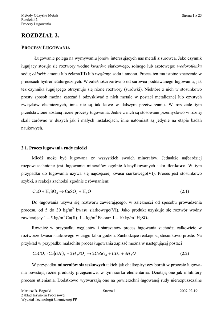 Metody Odzysku Metali Rozdział 2. Procesy Ługowania Strona 1 z 25 ROZDZIAŁ 2. PROCESY ŁUGOWANIA Ługowanie polega na wymywaniu jonów interesujących nas metali z surowca. Jako czynnik ługujący stosuje się roztwory wodne kwasów: siarkowego, solnego lub azotowego; wodorotlenku sodu; chlorki: amonu lub żelaza(III) lub węglany: sodu i amonu. Proces ten ma istotne znaczenie w procesach hydrometalurgicznych. W zależności zarówno od surowca poddawanego ługowaniu, jak też czynnika ługującego otrzymuje się różne roztwory (surówki). Niektóre z nich w stosunkowo prosty sposób można zatężać i odzyskiwać z nich metale w postaci metalicznej lub czystych związków chemicznych, inne nie są tak łatwe w dalszym przetwarzaniu. W rozdziale tym przedstawione zostaną różne procesy ługowania. Jedne z nich są stosowane przemysłowo w różnej skali zarówno w dużych jak i małych instalacjach, inne natomiast są jedynie na etapie badań naukowych. 2.1. Proces ługowania rudy miedzi Miedź może być ługowana ze wszystkich swoich minerałów. Jednakże najbardziej rozpowszechnione jest ługowanie minerałów ogólnie klasyfikowanych jako tlenkowe. W tym przypadku do ługowania używa się najczęściej kwasu siarkowego(VI). Proces jest stosunkowo szybki, a reakcja zachodzi zgodnie z równaniem: CuO + H 2SO 4 → CuSO 4 + H 2 O (2.1) Do ługowania używa się roztworu zawierającego, w zależności od sposobu prowadzenia procesu, od 5 do 30 kg/m3 kwasu siarkowego(VI). Jako produkt uzyskuje się roztwór wodny zawierający 1 – 5 kg/m3 Cu(II), 1 – kg/m3 Fe oraz 1 – 10 kg/m3 H2SO4. Również w przypadku węglanów i siarczanów proces ługowania zachodzi całkowicie w roztworze kwasu siarkowego w ciągu kilku godzin. Zachodzące reakcje są stosunkowo proste. Na przykład w przypadku malachitu proces ługowania zapisać można w następującej postaci CuCO3 ⋅ Cu (OH )2 + 2 H 2 SO 4 → 2CuSO 4 + CO 2 + 3H 2 O (2.2) W przypadku minerałów siarczkowych takich jak chalkopiryt czy bornit w procesie ługowania powstają różne produkty przejściowe, w tym siarka elementarna. Działają one jak inhibitory procesu utleniania. Dodatkowo wytwarzają one na powierzchni ługowanej rudy nierozpuszczalne Mariusz B. Bogacki Zakład Inżynierii Procesowej Wydział Technologii Chemicznej PP Strona 1 2007-02-19 Metody Odzysku Metali Rozdział 2. Procesy Ługowania Strona 2 z 25 powłoki (siarka elementarna), blokujące dostęp do powierzchni minerału czynnikom ługującym. Powoduje to, że reakcja roztwarzania rud siarczkowych jest bardzo wolna i może trwać od kilku miesięcy do nawet kilku lat celem pełnego rozpuszczenia minerału. Podstawowym problemem w procesie ługowania rud siarczkowych jest to, że siarczki są trudno rozpuszczalne w wodzie i ich roztwarzanie wymaga zastosowania odpowiednich czynników utleniających. Najczęściej utleniaczem są jony Fe3+. Mogą być one dostarczane do środowiska reakcji bezpośrednio w roztworze ługującym, lub też powstawać w trakcie procesu ługowania jako efekt utlenienia żelaza(II) do żelaza(III) tlenem atmosferycznym. Rzadziej jako utleniacz w procesie ługowania rud siarczkowych stosowany jest tlen atmosferyczny. W typowym procesie do ługowania używa się kwasu siarkowego(VI). Sam proces ługowania jest zdecydowanie bardziej złożony aniżeli w przypadku rud tlenkowych. Jak już wspomniano konieczna jest w roztworze obecność jonów żelaza(III), które pełnią rolę utleniacza. W zależności od stopnia utlenienia miedzi w rudzie siarczkowej przebieg tego procesu zapisać można na różne sposoby. W przypadku chalkozynu jako Cu2 S + 10Fe 3+ + 15SO42− + 4 H 2O → 2Cu 2+ + 10 Fe 2+ + 12 SO42− + 4 H 2 SO4 (2.3) lub kowelinu jako CuS + 8Fe 3+ + 12SO 24− + 4 H 2 O → Cu 2+ + 8Fe 2+ + 9SO 24− + 4 H 2SO 4 (2.4) W przypadku rud mieszanych takich jak chalkopiryt reakcję tę zapisać można w formie: CuFeS 2 + 10Fe 3+ + 15SO 24− + 4 H 2 O → 2Cu 2+ + 10Fe 2+ + 12SO 24− + 4 H 2SO 4 (2.5) Jak z przedstawionych reakcji (2.3) do (2.5) wynika w każdym przypadku reakcji roztwarzania rudy towarzyszy powstawanie kwasu siarkowego(VI). W rudach siarczkowych jako jeden ze składników występuje piryt (FeS2). Reaguje on z jonami Fe(III) przechodząc do roztworu wodnego. W reakcji tej powstają jony Fe(II) oraz kwas siarkowy(VI) zgodnie z reakcją: FeS 2 + 14 Fe 3+ + 21SO 24− + 8H 2 O → 15Fe 2+ + 15SO 24− + 8H 2SO 4 (2.6) Możliwa jest również bezpośrednia reakcja pirytu z tlenem z powietrza. Wymaga ona jednakże obecności odpowiednich szczepów bakterii 2 FeS 2 + 7O 2 + 2 H 2 O ⎯bakterie ⎯⎯→ 2 Fe 2 + + 2 SO 42 − + 2 H 2 SO 4 Mariusz B. Bogacki Zakład Inżynierii Procesowej Wydział Technologii Chemicznej PP Strona 2 (2.7) 2007-02-19 Metody Odzysku Metali Rozdział 2. Procesy Ługowania Strona 3 z 25 Powstające w reakcjach (2.2) do (2.7) jony żelaza(II) mogą być utleniane tlenem z powietrza do żelaza(III) dając zamknięty cykl produkcyjny. Reakcja ta zachodzi z udziałem katalizatora oraz kwasu siarkowego(VI) 4 Fe 2 + + 4 SO 42 − + O 2 + 2 H 2 SO 4 ⎯katalizato ⎯ ⎯⎯r → 4 Fe 3+ + 6SO 42 − + 2 H 2 O (2.8) We wszystkich reakcjach ługowania rud siarczkowych powstaje kwas siarkowy(VI). Może on być użyty ponownie w roztworach ługujących na przykład do ługowania rud tlenkowych lub też wykorzystany w reakcji utleniania żelaza(II) do żelaza(III) (reakcja 2.6). Nadmiar kwasu siarkowego można wydzielić i użyć w innych procesach przemysłu chemicznego. Typowy proces ługowania rudy siarczkowej miedzi z zastosowaniem kwasu siarkowego trwa zwykle około 200 dni. Proces ten pozwala na odzyskanie 75 do 80% zawartej w rudzie miedzi. Zastosowanie bakterii w roztworze ługującym pozwala okres ten skrócić do 40 – 60 dni przy tym samym poziomie odzysku miedzi z rudy. Innym utleniaczem stosowanym w procesie ługowania rud siarczkowych może być tlen z powietrza. Wprowadzenie tlenu do u