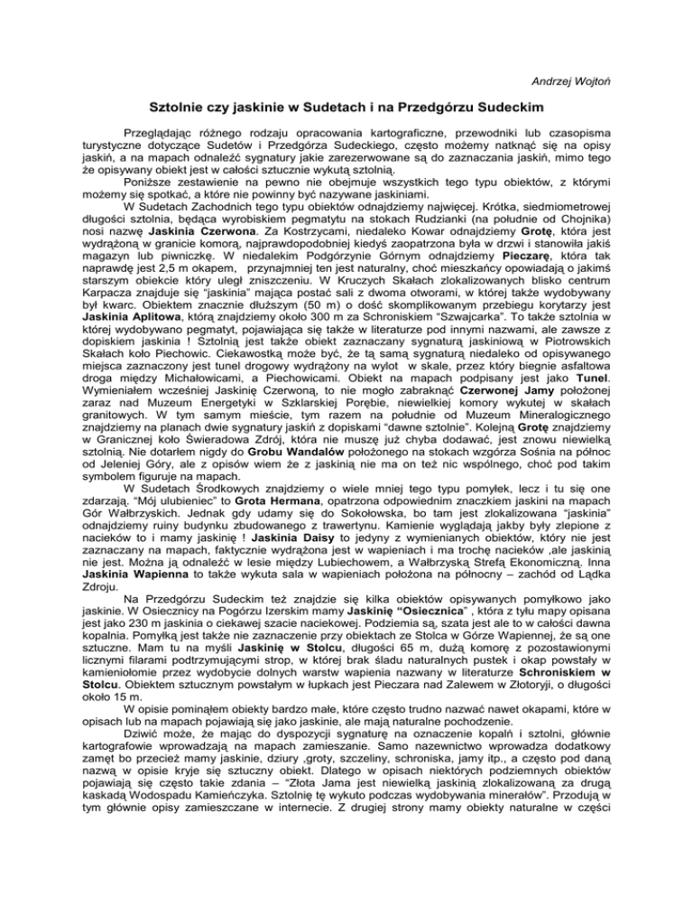 Andrzej Wojtoń Sztolnie czy jaskinie w Sudetach i na Przedgórzu Sudeckim Przeglądając róŜnego rodzaju opracowania kartograficzne, przewodniki lub czasopisma turystyczne dotyczące Sudetów i Przedgórza Sudeckiego, często moŜemy natknąć się na opisy jaskiń, a na mapach odnaleźć sygnatury jakie zarezerwowane są do zaznaczania jaskiń, mimo tego Ŝe opisywany obiekt jest w całości sztucznie wykutą sztolnią. PoniŜsze zestawienie na pewno nie obejmuje wszystkich tego typu obiektów, z którymi moŜemy się spotkać, a które nie powinny być nazywane jaskiniami. W Sudetach Zachodnich tego typu obiektów odnajdziemy najwięcej. Krótka, siedmiometrowej długości sztolnia, będąca wyrobiskiem pegmatytu na stokach Rudzianki (na południe od Chojnika) nosi nazwę Jaskinia Czerwona. Za Kostrzycami, niedaleko Kowar odnajdziemy Grotę, która jest wydrąŜoną w granicie komorą, najprawdopodobniej kiedyś zaopatrzona była w drzwi i stanowiła jakiś magazyn lub piwniczkę. W niedalekim Podgórzynie Górnym odnajdziemy Pieczarę, która tak naprawdę jest 2,5 m okapem, przynajmniej ten jest naturalny, choć mieszkańcy opowiadają o jakimś starszym obiekcie który uległ zniszczeniu. W Kruczych Skałach zlokalizowanych blisko centrum Karpacza znajduje się “jaskinia” mająca postać sali z dwoma otworami, w której takŜe wydobywany był kwarc. Obiektem znacznie dłuŜszym (50 m) o dość skomplikowanym przebiegu korytarzy jest Jaskinia Aplitowa, którą znajdziemy około 300 m za Schroniskiem “Szwajcarka”. To takŜe sztolnia w której wydobywano pegmatyt, pojawiająca się takŜe w literaturze pod innymi nazwami, ale zawsze z dopiskiem jaskinia ! Sztolnią jest takŜe obiekt zaznaczany sygnaturą jaskiniową w Piotrowskich Skałach koło Piechowic. Ciekawostką moŜe być, Ŝe tą samą sygnaturą niedaleko od opisywanego miejsca zaznaczony jest tunel drogowy wydrąŜony na wylot w skale, przez który biegnie asfaltowa droga między Michałowicami, a Piechowicami. Obiekt na mapach podpisany jest jako Tunel. Wymieniałem wcześniej Jaskinię Czerwoną, to nie mogło zabraknąć Czerwonej Jamy połoŜonej zaraz nad Muzeum Energetyki w Szklarskiej Porębie, niewielkiej komory wykutej w skałach granitowych. W tym samym mieście, tym razem na południe od Muzeum Mineralogicznego znajdziemy na planach dwie sygnatury jaskiń z dopiskami “dawne sztolnie”. Kolejną Grotę znajdziemy w Granicznej koło Świeradowa Zdrój, która nie muszę juŜ chyba dodawać, jest znowu niewielką sztolnią. Nie dotarłem nigdy do Grobu Wandalów połoŜonego na stokach wzgórza Sośnia na północ od Jeleniej Góry, ale z opisów wiem Ŝe z jaskinią nie ma on teŜ nic wspólnego, choć pod takim symbolem figuruje na mapach. W Sudetach Środkowych znajdziemy o wiele mniej tego typu pomyłek, lecz i tu się one zdarzają. “Mój ulubieniec” to Grota Hermana, opatrzona odpowiednim znaczkiem jaskini na mapach Gór Wałbrzyskich. Jednak gdy udamy się do Sokołowska, bo tam jest zlokalizowana “jaskinia” odnajdziemy ruiny budynku zbudowanego z trawertynu. Kamienie wyglądają jakby były zlepione z nacieków to i mamy jaskinię ! Jaskinia Daisy to jedyny z wymienianych obiektów, który nie jest zaznaczany na mapach, faktycznie wydrąŜona jest w wapieniach i ma trochę nacieków ,ale jaskinią nie jest. MoŜna ją odnaleźć w lesie między Lubiechowem, a Wałbrzyską Strefą Ekonomiczną. Inna Jaskinia Wapienna to takŜe wykuta sala w wapieniach połoŜona na północny – zachód od Lądka Zdroju. Na Przedgórzu Sudeckim teŜ znajdzie się kilka obiektów opisywanych pomyłkowo jako jaskinie. W Osiecznicy na Pogórzu Izerskim mamy Jaskinię “Osiecznica” , która z tyłu mapy opisana jest jako 230 m jaskinia o ciekawej szacie naciekowej. Podziemia są, szata jest ale to w całości dawna kopalnia. Pomyłką jest takŜe nie zaznaczenie przy obiektach ze Stolca w Górze Wapiennej, Ŝe są one sztuczne. Mam tu na myśli Jaskinię w Stolcu, długości 65 m, duŜą komorę z pozostawionymi licznymi filarami podtrzymującymi strop, w której brak śladu naturalnych pustek i okap powstały w kamieniołomie przez wydobycie dolnych warstw wapienia nazwany w literaturze Schroniskiem w Stolcu. Obiektem sztucznym powstałym w łupkach jest Pieczara nad Zalewem w Złotoryji, o długości około 15 m. W opisie pominąłem obiekty bardzo małe, które często trudno nazwać nawet okapami, które w opisach lub na mapach pojawiają się jako jaskinie, ale mają naturalne pochodzenie. Dziwić moŜe, Ŝe mając do dyspozycji sygnaturę na oznaczenie kopalń i sztolni, głównie kartografowie wprowadzają na mapach zamieszanie. Samo nazewnictwo wprowadza dodatkowy zamęt bo przecieŜ mamy jaskinie, dziury ,groty, szczeliny, schroniska, jamy itp., a często pod daną nazwą w opisie kryje się sztuczny obiekt. Dlatego w opisach niektórych podziemnych obiektów pojawiają się często takie zdania – “Złota Jama jest niewielką jaskinią zlokalizowaną za drugą kaskadą Wodospadu Kamieńczyka. Sztolnię tę wykuto podczas wydobywania minerałów”. Przodują w tym głównie opisy zamieszczane w internecie. Z drugiej strony mamy obiekty naturalne w części zmienione przez człowieka jak choćby Jaskinię Złota Sztolnia, Jaskinię z Filarami czy Schronisko Skalna Kapliczka, w których widać ślady prac górniczych. Andrzej Wojtoń .