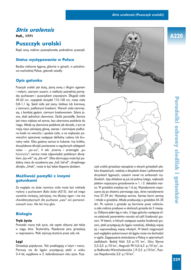Strix uralensis (Puszczyk uralski) Strix uralensis A220 Pall., 1771 Puszczyk uralski Rzàd: sowy, rodzina: puszczykowate, podrodzina: puszczyki Status wyst´powania w Polsce Bardzo nielicznie l´gowy, g∏ównie w górach, w po∏udniowo-wschodniej Polsce, gatunek osiad∏y. Opis gatunku Mo˝liwoÊç pomy∏ki z innymi gatunkami Ze wzgl´du na du˝e rozmiary cia∏a mo˝e byç niekiedy mylony z puchaczem Bubo bubo (A215). Jest od niego wyraênie mniejszy, jaÊniejszy, ma d∏u˝szy ogon i nie ma charakterystycznych dla puchacza „uszu” ani pomaraƒczowych oczu. Ma te˝ inny g∏os. Biologia Tryb ˝ycia Prowadzi nocny tryb ˝ycia, ale cz´sto aktywny jest tak˝e w ciàgu dnia. Terytorialny. Pojedyncze pary gniazdujà w rozproszeniu. Ptaki zajmujà terytoria przez ca∏y rok. L´gi Gniazduje pojedynczo. Toki przebiegajà w lutym i marcu. Pierwszy raz do l´gów przyst´pujà ptaki w wieku 3–4 lat, wyjàtkowo w 2. kalendarzowym roku ˝ycia. Pusz- puszczyk uralski czyk uralski gniazduje najcz´Êciej w starych gniazdach ptaków drapie˝nych, rzadziej w dziuplach drzew i pó∏otwartych skrzynkach l´gowych, czasami nawet na ambonach myÊliwskich. Jaja sk∏adane sà ju˝ od po∏owy lutego, wi´kszoÊç ptaków rozpoczyna gniazdowanie w 1. i 2. dekadzie marca. W gnieêdzie znajduje si´ 1–6 jaj. Wysiadywanie rozpoczyna si´ po z∏o˝eniu pierwszego jaja, okres wysiadywania trwa 27–29 dni. Wysiaduje samica. Samiec karmi samic´ i m∏ode w gnieêdzie. M∏ode przebywajà w gnieêdzie 34–35 dni. Po wylocie z gniazda sà karmione przez rodziców, a ca∏a rodzina przebywa w okolicach gniazda do 2 miesi´cy. Odbywa jeden l´g w roku. U tego gatunku wyst´puje silna zale˝noÊç parametrów rozrodu od cykli liczebnoÊci gryzoni. W latach, w których wyst´puje wysoka liczebnoÊç gryzoni, ptaki przyst´pujà do l´gów wczeÊniej, sk∏adajà wi´cej jaj i wyprowadzajà wi´cej m∏odych. W latach najgorszych pod wzgl´dem pokarmowym do l´gów mo˝e nie dochodziç w ogóle. Zag´szczenie stwierdzone w Polsce w optymalnych 2 siedliskach: Beskid Niski 3,0 p./10 km , Góry S∏onne 2 2 2,5–3,0 p./10 km , Magurski PN 5,0–6,3 p./10 km , La2 sy Rad∏owsko-Wierzchos∏awickie 1,9–2,5 p./10 km , Pusz2 cza Niepo∏omicka 3,0 p./10 km . Poradniki ochrony siedlisk i gatunków Puszczyk uralski jest du˝à, jasnà sowà z d∏ugim ogonem i ma∏ymi, czarnymi oczami, o wielkoÊci poÊredniej pomi´dzy puchaczem i puszczykiem zwyczajnym. D∏ugoÊç cia∏a 49–62 cm, rozpi´toÊç skrzyde∏ 115–140 cm, masa cia∏a 0,8–1,1 kg. Spód cia∏a jest jasny, bia∏awy lub kremowy, z ciemnymi, pod∏u˝nymi kreskami. Wierzch cia∏a ciemniejszy, z bardziej g´stym, ciemnym kreskowaniem. Szlara jasna, doÊç jednolicie ubarwiona. Dziób jasno˝ó∏ty. Samica jest nieco wi´ksza od samca, lecz ubarwiona podobnie do niego. M∏ode sà ubarwione podobnie jak doros∏e, z tym ˝e majà nieco jaÊniejszà g∏ow´, szersze i ciemniejsze pod∏u˝ne kreski na wierzchu i spodzie cia∏a, a na wi´kszoÊci powierzchni opierzonej wyst´puje delikatny rudawy lub brunatny nalot. G∏os godowy samca to hukanie: trzy krótkie, dwusylabowe dêwi´ki powtarzane w regularnych odst´pach czasu – „pu–uu”, 4 sek. przerwy i przeciàg∏e „pu hu'u'u'u'u'u”; samica mo˝e odpowiadaç podobnym dêwi´kiem „kju-wik” czy „kle-wit”. G∏os alarmujàcy mo˝e byç podobny nieco do szczekania psa „haf, haf-af”, chrapliwego dêwi´ku „hhiek”, mo˝e to byç tak˝e k∏apanie dziobem. 229 Ptaki (cz´Êç II) A220 W´drówki Gatunek osiad∏y, ale pojedyncze ptaki by∏y obserwowane w odleg∏oÊci nawet do kilkuset kilometrów od miejsc sta∏ego wyst´powania. Zimowanie Zimuje na terenie area∏u l´gowego. Poradniki ochrony siedlisk i gatunków Pokarm G∏ównie drobne ssaki do wielkoÊci wiewiórki oraz ptaki do wielkoÊci go∏´bia. Poluje przewa˝nie nocà, w okresie l´gowym tak˝e w ciàgu dnia. Najcz´Êciej poluje z zasiadki, pokarm wyszukuje tak˝e podczas lotów patrolowych. Stwierdzono, ˝e w sezonie l´gowym cz´Êciej poluje w lesie, a zimà cz´Êciej na terenach otwartych. 230 Wyst´powanie Siedlisko Wysokopienne, przeÊwietlone drzewostany iglaste i mieszane, o s∏abo rozwini´tym podszycie. Ch´tnie w sàsiedztwie por´b, wiatro∏omów, polan i dróg leÊnych. W górach g∏ównie buczyny. Obecnie coraz cz´Êciej zasiedla mniejsze kompleksy leÊne. Stwierdzono przypadek gniazdowania w parku miejskim w PrzemyÊlu. Siedliska z za∏àcznika I Dyrektywy Siedliskowej, które mogà byç istotne dla gatunku 6510 Ni˝owe i górskie Êwie˝e ∏àki u˝ytkowane ekstensywnie (Arrhenatherion elatioris) 9110 KwaÊne buczyny (Luzulo-Fagenion) 9130 ˚yzne buczyny (Dentario glandulose-Fagenion, Galio odorati-Fagenion) 9150 Ciep∏olubne buczyny storczykowe (Cephalanthero-Fagenion) 9170 Gràd Êrodkowoeuropejski i subkontynentalny (Galio-Carpinetum, Tilio-Carpinetum) 9410 Górskie bory Êwierkowe (Piceion abietis cz´Êç – zbiorowiska górskie) 91P0 Jod∏owy bór Êwi´tokrzyski (Abietetum polonicum) Rozmieszczenie geograficzne Wyst´puje szerokim pasem w lasach Europy i Azji. Wyró˝niono szereg podgatunków. W Europie wyst´pujà: S. u. liturata od pó∏nocno-zachodniej cz´Êci Pó∏wyspu Skandynawskiego, przez pó∏nocno-wschodnià Europ´ do Êrodkowej Rosji (na wschodzie do ok. 50°E, na po∏udniu do pó∏nocnej Polski, Bia∏orusi i Êrodkowej Wo∏gi), S. u. macroura w Êrodkowej i Êrodkowo-wschodniej Europie (od Karpat, na po∏udnie do Bu∏garii i do Ba∏kanów na zachodzie) oraz S. u. uralensis od wschodnioeuropejskiej Rosji do wybrze˝y Morza Ochockiego na wschodzie. Inne podgatunki zamieszkujà rozleg∏e przestrzenie syberyjskiej tajgi, pó∏nocno-wschodnie Chiny, Kore´ i Japoni´. Rozmieszczenie w Polsce Puszczyk uralski zasiedla g∏ównie Karpaty, najliczniej gniazduje w Bieszczadach i Beskidzie Niskim oraz na Pogórzu Dynowskim i Przemyskim. Aktualnie najdal