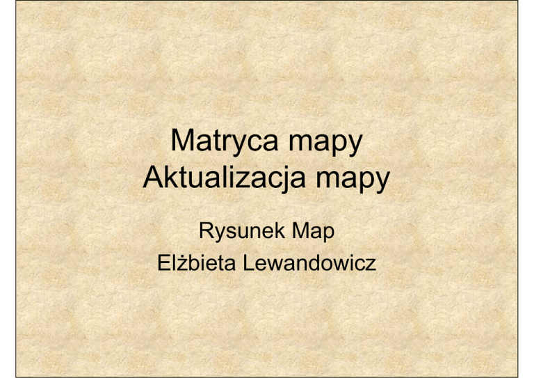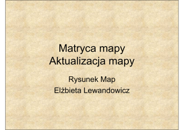 Matryca mapy Aktualizacja mapy Rysunek Map ElŜbieta Lewandowicz Matryca • Pojęcie drukarskie • SłuŜy do wielokrotnego powielania - kopiowania • Stosowana w geodezji choć juŜ pojęcie technologicznie nieaktualne • Matryca- Kopia mapy wykonana na materiale przezroczystym (kalce, folii) Matryca prawostronna i lewostronna • Matryca prawostronna kopia tradycyjna, • Matryca lewostronna kopia rysowana po lewej stronie, a uŜytkowana po prawej • Architekci, projektanci tworzą projekty na matrycy lewostronnej, wykonując projekt , nie niszczą obrazu mapy Matryca • Mapa zasadnicza – układ sekcyjny • Matryca mapy - układ rysunku dopasowany do arkusza – Zawiera skręconą siatkę krzyŜy, – Znak północy Aktualizacja i modernizacja mapy Wytyczne techniczne K-1.2 • Aktualizacja bieŜąca • Aktualizacja okresowa • Modernizacja mapy Modernizacja mapy zmiana rysunku mapy na wskutek wprowadzenia nowych przepisów, zarządzeń, instrukcji. K-1 1980 -------------- K-1 1998 Kartometryczność mapy • Kartometryczność mapy wiąŜe się z wiarygodnością co do miar na mapie. • Przyjmuje się, Ŝe mapa ma dokładność 0.3 mm w skali mapy. • Tą dokładność moŜna sprawdzić w oparciu o ramkę mapy i siatkę krzyŜy. Zadanie 1 • Kontrola aktualności mapy – Wyjście w teren i sprawdzenie aktualność na wydanej odbitce na zaznaczonym fragmencie mapy – Kolorem czerwonym wrysować nowe elementy i przekreślić juŜ nieistniejące Zadanie 2- wstępne do wykonania matryca mapy • Dopasować arkusz kalki tak aby rysunek był w środku ramki • Przenieść siatkę krzyŜy • Zaznaczyć kierunek północy • Ustalic kierunek opisu treści mapy Wykonanie matrycy (l,p) wraz z modernizacją rysunku mapy Zmiany w rysunku mapy: Budynki – zmiana sposobu wykreślenia linii budynku, - rozszerzenie opisu funkcji budynku , - brak rozróŜnienia :tarasów krytych i schodów z zadaszeniem Symbole obrócić do ramki (pomniki, drzewa,.) Opisy obrócić do ramki (rzędne wysokości, opisy budynków, osnów) Pytania • • • • • Co rozumiesz pod pojęciem matryca mapy? Czym róŜni się matryca prawostronna od lewostronnej? Wyjaśnij pojęcia bieŜąca i okresowa aktualizacja mapy? Co rozumiesz pod pojęciem modernizacja mapy? Przedstaw kilka przykładów zmiany symboli w instrukcjach technicznych K-1 z 1980 r. i 1998 r.? • Jakie zmiany wykonuje się w redakcji mapy przy wydruku mapy skręconej względem kierunku północy? • Podaj przykłady zmiany symboli i stylów linii przy ostatniej modernizacji mapy zasadniczej przy wprowadzeniu K-1 (1998 r.) Dziękuję za uwagę