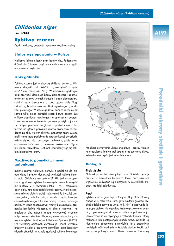 Chlidonias niger (Rybitwa czarna) Chlidonias niger A197 (L., 1758) Rybitwa czarna Rzàd: siewkowe, podrzàd: mewowce, rodzina: rybitwy Status wyst´powania w Polsce Nieliczny, lokalnie liczny, ptak l´gowy ni˝u. Podczas w´drówek doÊç licznie spotykany w ca∏ym kraju, szczególnie licznie na wybrze˝u. Opis gatunku Mo˝liwoÊç pomy∏ki z innymi gatunkami Rybitw´ czarnà naj∏atwiej pomyliç z podobnie do niej ubarwionà i prawie identycznej wielkoÊci rybitwà bia∏oskrzyd∏à Chlidonias leucopterus (A198), jednak w upierzeniu godowym rybitwy bia∏oskrzyd∏ej wierzch skrzyde∏ jest bia∏awy, 2–3 zewn´trzne lotki 1. rz. – czarniawe, ogon bia∏y, natomiast spód skrzyde∏ czarny. Ptaki m∏odociane rybitwy bia∏oskrzyd∏ej majà wyraênie bardziej bràzowy grzbiet, na boku cia∏a, u nasady skrzyd∏a, brak jest charakterystycznego tylko dla rybitwy czarnej ciemnego paska. W szacie spoczynkowej rybitwy bia∏oskrzyd∏ej czapeczka jest ledwie widoczna. W okresie l´gowym i na przelotach oba gatunki mogà wyst´powaç wspólnie w tym samym siedlisku. Podobnà szat´ m∏odocianà ma równie˝ rybitwa bia∏owàsa Chlidonias hybridus (A196). Od wczeÊniej opisanych wyró˝nia jà jednak wyraênie bràzowy grzbiet z be˝owym rysunkiem oraz jaÊniejszy wierzch skrzyde∏. W szacie godowej rybitwa bia∏owàsa rybitwa czarna ma charakterystycznie ubarwionà g∏ow´ – czarny wierzch kontrastujàcy z bia∏ymi policzkami oraz czerwony dziób. Wierzch cia∏a i spód jest jednolicie szary. Biologia Tryb ˝ycia Gatunek prowadzi dzienny tryb ˝ycia. Gnieêdzi si´ najcz´Êciej w niewielkich koloniach. Ptaki, poza okresem w´drówek, widywane sà najcz´Êciej w niewielkich stadach, rzadziej pojedynczo. Poradniki ochrony siedlisk i gatunków Rybitwa czarna jest wielkoÊcià zbli˝ona do kosa. Wymiary: d∏ugoÊç cia∏a 24–27 cm, rozpi´toÊç skrzyde∏ 61–67 cm, masa ok. 70 g. W upierzeniu godowym (maj–czerwiec) dominujà barwy ciemnoszare i czarne: tu∏ów jest czarny, wierzch skrzyde∏ i ogon ciemnoszary, spód skrzyde∏ jasnoszary, a spód ogona bia∏y. Nogi i dziób sà brudnoczerwone. Brak wyraênego dymorfizmu p∏ciowego. W szacie godowej samica ró˝ni si´ od samca tylko nieco bardziej szarà barwà spodu. Ju˝ w lipcu stopniowo rozwijajàce si´ upierzenie spoczynkowe zast´puje upierzenie godowe powi´kszajàcymi si´ bia∏ymi plamami na g∏owie i spodzie cia∏a; ostatecznie na g∏owie pozostaje czarna czapeczka zachodzàca za oko, wierzch skrzyde∏ pozostaje szary. M∏ode ptaki majà szat´ podobnà do spoczynkowej doros∏ych, ró˝nià si´ od nich bràzowym grzbietem, gdzie jasne obrze˝enia piór tworzà delikatne ∏uskowanie. Ogon jest s∏abo rozwidlony. Gatunek charakteryzuje si´ lekkim jaskó∏czym lotem. L´gi Rybitwa czarna gniazduje kolonijnie. Dojrza∏oÊç p∏ciowà osiàga w 2. roku ˝ycia. Tam, gdzie zak∏ada gniazda, s∏ychaç z daleka ostry g∏os „krije, kriik, kirr”, a nad wodà lata grupa ptaków. Na l´gowiska krajowe przylatuje w kwietniu, a pierwsze gniazda mo˝na znaleêç w po∏owie maja. Umieszczane sà na p∏ywajàcych roÊlinach, ko˝uchu starej roÊlinnoÊci lub podtopionych k´pach turzyc. Gniazda sà nieos∏oni´te, zbudowane z niewielkiej iloÊci przegni∏ych i Êwie˝ych roÊlin wodnych, w kszta∏cie p∏askiej kopki. L´gi trwajà do po∏owy czerwca. Pe∏ne zniesienie sk∏ada si´ 203 Ptaki (cz´Êç II) Poradniki ochrony siedlisk i gatunków A197 przewa˝nie z 3 jaj, rzadziej 1–2, wyjàtkowo 4. Odleg∏oÊç mi´dzy sàsiednimi gniazdami w kolonii wynosi 1–7 m. Wysiadywanie jaj od z∏o˝enia pierwszego trwa 18–22 dni. Rybitwa czarna odbywa jeden l´g w roku, po stracie jaj l´g jest powtarzany. Przez pierwsze dni po wykluciu rodzice na gnieêdzie ogrzewajà m∏ode, które opuszczajà gniazdo po 2–3 dobach od wyklucia pierwszego piskl´cia, pozostajàc w ukryciu przez ok. 14 dni. Przebywajà wtedy w pobli˝u gniazda lub mogà przemieszczaç si´ w inny rejon kolonii. W niebezpieczeƒstwie ju˝ od pierwszego dnia ˝ycia piskl´ta uciekajà z gniazda. Karmione sà przez oboje rodziców. W wieku 18–21 dni m∏ode zaczynajà lataç i przez oko∏o tydzieƒ przebywajà jeszcze na terytorium kolonii. Usamodzielniajà si´ po oko∏o 25 dniach, lecz rodzice dokarmiajà je jeszcze w okresie koczowaƒ pol´gowych. W Polsce przewa˝ajà niewielkie kolonie, liczàce do kilkudziesi´ciu par, kolonie liczàce 100–200 p. sà nieliczne. Wyjàtkowo zdarzajà si´ pojedyncze gniazda. W´drówki Szlak w´drówkowy rybitw czarnych obràczkowanych w Polsce podczas jesiennej w´drówki biegnie wzd∏u˝ po∏udniowego wybrze˝a Ba∏tyku i dalej wzd∏u˝ wybrze˝a Morza Pó∏nocnego do atlantyckiego wybrze˝a zachodniej Europy. Cz´Êç ptaków przecina kontynent i pojawia si´ w basenie Morza Âródziemnego. Dalej cz´Êç ptaków przelatuje na atlantyckie wybrze˝e Afryki, a inne w kierunku zimowisk w dolinie Nilu. Miejsca zimowania ptaki osiàgajà w listopadzie. Wiosenna w´drówka na l´gowiska rozpoczyna si´ w koƒcu marca i przebiega prawdopodobnie tà samà drogà. Przez pó∏nocno-zachodnie W∏ochy przelatujà przypuszczalnie przede wszystkim osobniki m∏ode. W Polsce pierwsze ptaki mo˝na spotkaç ju˝ w 1. dekadzie kwietnia, zasadniczy przelot trwa od 2. dekady kwietnia do 1. dekady czerwca. Przelot wiosenny odbywa si´ w niewielkich stadach po kilka–kilkanaÊcie ptaków, czasami w parach, rzadziej po 100–200 ptaków, wyjàtkowo do 1000 os. Znacznie obfitszy przelot jesienny w kraju rozpoczyna si´ w lipcu i trwa do 1. dekady paêdziernika, sporadycznie nawet do po∏owy listopada. W czasie w´drówek rybitwa czarna obserwowana jest w ca∏ej Polsce. Niedojrza∏e p∏ciowo jednoroczne lub czasem drugoroczne osobniki koczujà mi´dzy miejscami zimowania a l´gowiskami. Zimowanie Rybitwa czarna miejsca zimowania osiàga w listopadzie. Zimowiska znajdujà si´ na wybrze˝ach zac