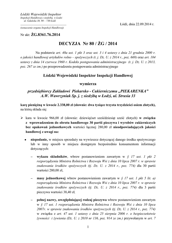 Łódzki Wojewódzki Inspektor Inspekcji Handlowej z siedzibą w Łodzi ul. Gdańska 38, 90 – 730 Łódź Łódź, dnia 22.09.2014 r. ..................................................... (oznaczenie organu Inspekcji Handlowej) Nr akt: ŻG.8361.76.2014 DECYZJA Nr 80 / ŻG / 2014 Na podstawie art. 40a ust. 1 pkt 3 oraz ust. 3 i 4 ustawy z dnia 21 grudnia 2000 r. o jakości handlowej artykułów rolno – spożywczych (t. j. Dz. U. z 2014 r., poz. 669) oraz art. 104 ustawy z dnia 14 czerwca 1960 r. Kodeks postępowania administracyjnego (t. j. Dz. U. z 2013, poz. 267 ze zm.) po przeprowadzeniu postępowania administracyjnego Łódzki Wojewódzki Inspektor Inspekcji Handlowej wymierza przedsiębiorcy Zakładowi Piekarsko - Cukierniczemu „PIEKARENKA” A.W. Wawrzyniak Sp. j. z siedzibą w Łodzi, ul. Strusia 33 karę pieniężną w kwocie 2.338,00 zł (słownie: dwa tysiące trzysta trzydzieści osiem złotych), na którą składa się: kara w kwocie 966,00 zł (słownie: dziewięćset sześćdziesiąt sześć złotych) w związku z wprowadzeniem do obrotu handlowego 30 partii pieczywa i wyrobów cukierniczych bez opakowań jednostkowych wartości łącznej 280,00 zł nieodpowiadających jakości handlowej z uwagi na: niepodanie, w miejscu sprzedaży na wywieszce dotyczącej danego środka spożywczego lub w inny sposób w miejscu dostępnym bezpośrednio konsumentom informacji dotyczących: wykazu składników, wbrew postanowieniom zawartym w § 17 ust. 1 pkt 2 rozporządzenia Ministra Rolnictwa i Rozwoju Wsi z dnia 10 lipca 2007 r. w sprawie znakowania środków spożywczych (tj. Dz. U. z 2014 r., poz. 774) dla 30 partii wartości 280,00 zł, masy jednostkowej wbrew postanowieniom zawartym w § 17 ust. 1 pkt 5 lit. a) rozporządzenia Ministra Rolnictwa i Rozwoju Wsi z dnia 10 lipca 2007 r. w sprawie znakowania środków spożywczych (tj. Dz. U. z 2014 r., poz. 774) dla 3 partii pieczywa wartości 38,40 zł, pełnej nazwy, uwzględniającej rodzaj pieczywa wbrew postanowieniom zawartym w § 17 ust. 1 rozporządzenia Ministra Rolnictwa i Rozwoju Wsi z dnia 10 lipca 2007r. w sprawie znakowania środków spożywczych (tj. Dz. U. z 2014 r., poz. 774) w związku z art. 47 ust. 1 ustawy z dnia 25 sierpnia 2006 r. o bezpieczeństwie żywności i żywienia (Dz. U. z 2010 nr 136, poz. 914 ze zm.) przywołanym w art. 7 1 ust. 2 pkt 1 ustawy z dnia 21 grudnia 2000 r. o jakości handlowej artykułów rolno – spożywczych (tj. Dz. U. z 2014 r., poz. 669) dla 2 partii pieczywa wartości 28,40 zł, podanie w miejscu sprzedaży nazw nieadekwatnych do składu wbrew postanowieniom art. 46 ust. 1 pkt 1 lit. a ustawy z dnia 25 sierpnia 2006 r. bezpieczeństwie żywności i żywienia ( Dz. U. z 2010 r. Nr 136, poz. 914 ze zm.) przywołanego w art. 6 ust. 2 ustawy z dnia 21 grudnia 2000 r. o jakości handlowej artykułów rolno – spożywczych (tj. D. U. z 2014 r., poz. 669) dla 2 partii wartości 18,40 zł, kara w kwocie 1.372,00 zł (słownie: jeden tysiąc trzysta siedemdziesiąt dwa złote) stanowiąca wysokość kar nałożonych w okresie 24 miesięcy przed dniem kontroli, o którą podwyższa się wymierzoną karę, w związku z ponownym wprowadzeniem do obrotu produktów tego samego rodzaju nieodpowiadających jakości handlowej ze względu na te same wady (art. 40a ust. 3 ustawy z dnia 21 grudnia 2000 r. o jakości handlowej artykułów rolno – spożywczych – t. j. Dz. U. z 2014 r., poz. 669). Uzasadnienie W dniach od 27 marca 2014 r. do 01 kwietnia 2014 r. na podstawie upoważnienia Łódzkiego Wojewódzkiego Inspektora Inspekcji Handlowej numer ŻG.8361.76.2014 z dnia 27.03.2014 r. inspektorzy Wojewódzkiego Inspektoratu Inspekcji Handlowej w Łodzi przeprowadzili kontrolę w sklepie firmowym zlokalizowanym w Zgierzu przy ul. Długiej 3, należącym do Zakładu Piekarsko – Cukierniczego „Piekarenka” A. W. Wawrzyniak Sp. j. z siedzibą w Łodzi, ul. Strusia 33. Kontrolę przeprowadzono na podstawie przepisów art. 3 ust. 1 - 3 rozporządzenia Parlamentu Europejskiego i Rady (WE) Nr 882/2004 z dnia 29 kwietnia 2004r. w sprawie kontroli urzędowych przeprowadzanych w celu sprawdzenia zgodności z prawem paszowym i żywnościowym oraz regułami dotyczącymi zdrowia zwierząt i dobrostanu zwierząt (Dz. U. L 165 z 30.4.2004 ze zm.), art. 17 ust. 3 ustawy z dnia 21 grudnia 2000 r. o jakości handlowej artykułów rolno-spożywczych (Dz. U. z 2005 r. nr 187, poz. 1577, ze zm.), art. 24 ust. 1 rozporządzenia Parlamentu Europejskiego i Rady (WE) nr 1935/2004 z dnia 27 października 2004 r. w sprawie materiałów i wyrobów przeznaczonych do kontaktu z żywnością oraz uchylającego dyrektywy 80/590/EWG (Dz. U. z 27.10.2004 s. 4 ze zm.) w związku z art. 3 ust. 1 pkt 6 oraz art. 3 ust. 1 pkt 1 i 2 ustawy z dnia 15 grudnia 2000 r. o Inspekcji Handlowej (tj. Dz. U. z 2014 r., poz. 148) w obecności osoby upoważnionej (…). W toku kontroli stwierdzono, że w sprzedaży znajdowało się 16 partii pieczywa bez opakowań jednostkowych wartości 162,80 zł oraz 14 partii wyrobów cukierniczych bez opakowań jednostkowych wartości 117,20 zł, wyprodukowanych przez Zakład Piekarsko – Cukierniczy „Piekarenka” A. W. Wawrzyniak Sp. j., ul. Strusia 33, 91 – 503 Łódź, które w miejscu sprzedaży zostały oznakowane jako: maślany (wywieszka cenowa, zwana dalej „wywieszką”), chleb na maślance 0,80 kg (cennik) w cenie 3,80 zł za sztukę (4 sztuki), 2 cukrzyk (wywieszka), chleb IG dla cukrzyków 0,30 kg (cennik) w cenie 3,60 zł za sztukę (3 sztuki), pokrzywa (wywieszka), chleb pokrzywowy 0,50 kg (cennik) w cenie 3,60 zł za sztukę (1 sztuka), ruski (wywieszka), chleb ruski (cennik) w cenie 6,00 zł za 1 kilogram (0,60 kg), dworski (wywieszka), chleb dworski 0,50 kg (cennik) w cenie 3,20 zł za sztukę (4 sztuki), fitness (wywieszka), chleb fitness 0,45 kg (cennik) w cenie 3,20 zł za sztukę (4 sztuki), królewski (wywieszka), chleb królewski 0,45kg (cennik) w cenie 3,20 zł za sztuk