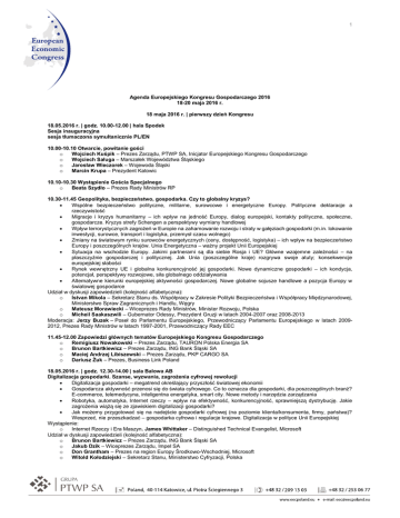 1 Agenda Europejskiego Kongresu Gospodarczego 2016 18-20 maja 2016 r. 18 maja 2016 r. | pierwszy dzień Kongresu 18.05.2016 r. | godz. 10.00-12.00 | hala Spodek Sesja inauguracyjna sesja tłumaczona symultanicznie PL/EN 10.00-10.10 Otwarcie, powitanie gości o Wojciech Kuśpik – Prezes Zarządu, PTWP SA, Inicjator Europejskiego Kongresu Gospodarczego o Wojciech Saługa – Marszałek Województwa Śląskiego o Jarosław Wieczorek – Wojewoda Śląski o Marcin Krupa – Prezydent Katowic 10.10-10.30 Wystąpienie Gościa Specjalnego o Beata Szydło – Prezes Rady Ministrów RP 10.30-11.45 Geopolityka, bezpieczeństwo, gospodarka. Czy to globalny kryzys? Wspólne bezpieczeństwo polityczne, militarne, surowcowe i energetyczne Europy. Polityczne deklaracje a rzeczywistość Migracje i kryzys humanitarny – ich wpływ na jedność Europy, dialog europejski, kontakty polityczne, społeczne, gospodarcze. Kryzys strefy Schengen a perspektywy wymiany handlowej Wpływ terrorystycznych zagrożeń w Europie na zahamowanie rozwoju i straty w gałęziach gospodarki (m.in. lokowanie inwestycji, surowce, transport i logistyka, przemysł czasu wolnego) Zmiany na światowym rynku surowców energetycznych (ceny, dostępność, logistyka) – ich wpływ na bezpieczeństwo Europy i poszczególnych krajów. Unia Energetyczna – ważny projekt Unii Europejskiej Sytuacja na wschodzie Europy. Jakimi partnerami są dla siebie Rosja i UE? Główne wzajemne zależności – na płaszczyźnie gospodarczej i politycznej. Jak Unia (poszczególne kraje) rozgrywa swoje atuty; konsekwencje europejskiej słabości Rynek wewnętrzny UE i globalna konkurencyjność jej gospodarki. Nowe dynamiczne gospodarki – ich kondycja, potencjał, perspektywy rozwojowe, siła globalnego oddziaływania Alternatywne kierunki europejskiej aktywności gospodarczej. Nowe globalne sojusze handlowe a pozycja Europy w światowej gospodarce Udział w dyskusji zapowiedzieli (kolejność alfabetyczna): o Istvan Mikola – Sekretarz Stanu ds. Współpracy w Zakresie Polityki Bezpieczeństwa i Współpracy Międzynarodowej, Ministerstwo Spraw Zagranicznych i Handlu, Węgry o Mateusz Morawiecki – Wiceprezes Rady Ministrów, Minister Rozwoju, Polska o Micheil Saakaszwili – Gubernator Odessy, Prezydent Gruzji w latach 2004-2007 oraz 2008-2013 Moderacja: Jerzy Buzek – Poseł do Parlamentu Europejskiego, Przewodniczący Parlamentu Europejskiego w latach 20092012, Prezes Rady Ministrów w latach 1997-2001, Przewodniczący Rady EEC 11.45-12.00 Zapowiedzi głównych tematów Europejskiego Kongresu Gospodarczego o Remigiusz Nowakowski – Prezes Zarządu, TAURON Polska Energia SA o Brunon Bartkiewicz – Prezes Zarządu, ING Bank Śląski SA o Maciej Andrzej Libiszewski – Prezes Zarządu, PKP CARGO SA o Dariusz Żuk – Prezes, Business Link Poland 18.05.2016 r. | godz. 12.30-14.00 | sala Balowa AB Digitalizacja gospodarki. Szanse, wyzwania, zagrożenia cyfrowej rewolucji Digitalizacja gospodarki – megatrend określający przyszłość światowej ekonomii Gospodarcza aktywność przenosi się do świata cyfrowego. Co to oznacza dla gospodarki, dla poszczególnych branż? E-commerce, telemedycyna, inteligentna energetyka, smart city. Nowe metody i narzędzia zarządzania Robotyka, automatyka, Internet rzeczy – wpływ na efektywność, konkurencyjność, sprawniejszą dystrybucję. Jakie zagrożenia wiążą się ze zjawiskiem digitalizacji gospodarki? Jak możemy przygotować się na nadejście gospodarki cyfrowej (na poziomie klienta/konsumenta, firmy, państwa)? Wesprzeć, nie przeszkadzać – gospodarka cyfrowa i regulacje krajowe. Digitalizacja w polityce Unii Europejskiej Wystąpienie: o Internet Rzeczy i Era Maszyn. James Whittaker – Distinguished Technical Evangelist, Microsoft Udział w dyskusji zapowiedzieli (kolejność alfabetyczna): o Brunon Bartkiewicz – Prezes Zarządu, ING Bank Śląski SA o Jakub Dzik – Wiceprezes Zarządu, Impel SA o Don Grantham – Prezes na region Europy Środkowo-Wschodniej, Microsoft o Witold Kołodziejski – Sekretarz Stanu, Ministerstwo Cyfryzacji, Polska 2 o Marina Wes – Przedstawiciel, Bank Światowy w Polsce o Alf-Henryk Wulf – CEO, GE Power AG Germany, Prezes GE Power w Niemczech Moderacja: Wawrzyniec Smoczyński – Dyrektor Zarządzający, Polityka Insight Sesja tłumaczona symultanicznie PL/EN 18.05.2016 r. | godz. 14.45-16.30 | sala Balowa AB Młodzi przedsiębiorcy. Nowy biznes nośnikiem innowacji Młode pokolenie w gospodarce i na rynku pracy. Start-upy w Europie i w Polsce – ich rola w gospodarce, sposoby wspierania. Kreatywne i nieszablonowe spojrzenie na biznes i produkt jako wartość rynkowa Y, a wkrótce Z – cechy nowych generacji a przemiany współczesnej gospodarki. Nawyki komunikacyjne, zdolności interpersonalne, relacje z technologiami i inne kompetencje młodzieży. Co motywuje młodych przedsiębiorców i pracowników? Współczesny pracodawca i lider a współpraca międzypokoleniowa w firmie. Efektywne inwestowanie w kompetencje. Zagospodarować potencjał: młodzi przedsiębiorcy, menedżerowie i pracownicy – kreatorzy innowacji Udział w dyskusji zapowiedzieli (kolejność alfabetyczna): o Piotr Buszman – Wicedyrektor ds. Badań Przedklinicznych, Centrum Badawczo-Rozwojowe, American Heart of Poland SA o Artur Kupczunas – Wiceprezes, Saule Technologies, Prezes, Bridge One Sp. z o.o. o Wojciech Wolny – Prezes Zarządu, EUVIC Sp. z o.o. Podczas sesji odbędą się prezentacje trzech najlepszych start-upów wyłonionych w konkursie Start-up Challenge Moderacja: Dariusz Żuk – Prezes, Business Link Poland Sesja tłumaczona symultanicznie PL/EN 18.05.2016 r. | godz. 12.30-14.00 | sala Balowa C Zarządzanie państwowymi zasobami w gospodarce Majątek nadzorowany przez Skarb Państwa w polskiej gospodarce. Zasoby i potencjał Polityka rozwojowa państwa a jego formy zaangażowania w spółkach prawa handlowego. Rola agencji i funduszy państwowych w gos