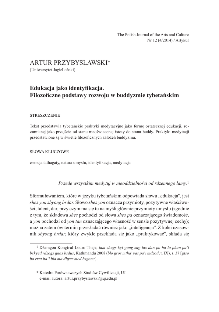 The Polish Journal of the Arts and Culture Nr 12 (4/2014) / Artykuł Artur Przybysławski* (Uniwersytet Jagielloński) Edukacja jako identyfikacja. Filozoficzne podstawy rozwoju w buddyzmie tybetańskim STRESZCZENIE Tekst przedstawia tybetańskie praktyki medytacyjne jako formę ostatecznej edukacji, rozumianej jako przejście od stanu nieoświeconej istoty do stanu buddy. Praktyki medytacji przedstawione są w świetle filozoficznych założeń buddyzmu. SŁOWA KLUCZOWE esencja tathagaty, natura umysłu, identyfikacja, medytacja Przede wszystkim medytuj w nieoddzielności od rdzennego lamy.1 Sformułowaniem, które w języku tybetańskim odpowiada słowu „edukacja”, jest shes yon sbyong brdar. Słowo shes yon oznacza przymioty, pozytywne właściwości, talent, dar, przy czym ma się tu na myśli głównie przymioty umysłu (zgodnie z tym, że składowa shes pochodzi od słowa shes pa oznaczającego świadomość, a yon pochodzi od yon tan oznaczającego własność w sensie pozytywnej cechy); można zatem ów termin przekładać również jako „inteligencja”. Z kolei czasownik sbyong brdar, który zwykle przekłada się jako „praktykować”, składa się 1 Dźamgon Kongtrul Lodro Thaje, lam zhugs kyi gang zag las dan po ba la phan pa’i bskyed rdzogs gnas bsdus, Kathmandu 2008 (blo gros mtha’ yas pa’i mdzod, t. IX), s. 37 [gtso bo rtsa ba’i bla ma dbyer med bsgom/]. * Katedra Porównawczych Studiów Cywilizacji, UJ e‑mail autora: [email protected] 72 Artur Przybysławski z dwóch rdzeni czasownikowych. I tak sbyong to „uczyć się, wprawiać się w jakiejś dyscyplinie”, brdar oznacza zaś „polerować, ostrzyć”. Tak oto edukacja jest wypracowywaniem właściwości umysłu, który ma być ostry jak grot strzały, do którego porównuje się inteligencję niezbędną na drodze do oświecenia. Dodatkowo wymieniony czasownik sbyong oznacza również „oczyszczanie, usuwanie błędów” i często ma się tu na myśli błędy i zasłony umysłu, których można pozbyć się na przykład w praktyce blo sbyong – treningu oczyszczającego umysł. Edukacja jest zatem rozwijaniem umysłu, który uwalnia się od splamień, poprzez ćwiczenie się w swoich integralnych właściwościach. W ten sposób można też określić sedno buddyjskiej praktyki, która jest edukowaniem umysłu dotyczącym jego natury ukrytej pod owymi splamieniami. Jest w dużej mierze autoedukacją, ponieważ nikt poza samym adeptem buddyjskich nauk nie może dokonać oczyszczenia jego umysłu, dzięki któremu ujawnią się i rozwiną jego właściwości. Niemniej jednak owa edukacja zaczyna się od spotkania z nauczycielem, który ostatecznie okazuje się właśnie nauczycielem autoedukacji będącej drogą do oświecenia. Aby owa edukacja‑autoedukacja mogła się wydarzyć, potrzebne jest sześć czynników, do których sprowadzić można cały buddyzm. Gampopa2 określa je następująco: przyczyna owego nieprzewyższonego oświecenia, osoba będąca oparciem dla jego osiągnięcia, warunek sprzyjający jego osiągnięciu, sposób jego osiągnięcia, skutek jego osiągnięcia, aktywność wynikająca z jego osiągnięcia, oto co jest wymagane.3 Gampopa (sgam po pa bsod nams rin chen, 1079–1153) – jeden z pierwszych mistrzów szkoły Karma Kagyu, którego podejście zadecydowało w znacznej mierze o sposobie praktykowania w tej linii buddyzmu tybetańskiego. Był, obok Reczungpy, głównym uczniem Milarepy. Jego uczniami z kolei byli między innymi I Karmapa oraz Pagmo Drugpa. Jego najbardziej znanym dziełem jest Klejnotowa ozdoba wyzwolenia [dam chos yid bzhin nor bu thar pa rin che’i rgyan], która do dziś pełni rolę standardowego podręcznika wykładającego stopnie buddyjskiej ścieżki. 3 Gampopa, chos rje sgam po pa bsod nams rin chen gyis mdzad pa’i dam chos yid bzhin nor bu thar pa rin che’i rgyan zhes bya ba bzhugs so, Sarnath‑Varanasi 1999, s. 2 [bla med kyi byang chub de’i rgyu dang/ de sgrub pa’i rten gyi gang zag dang/ de sgrub pa la bskul ba’i rkyen dang/ de sgrub pa’i thads dang/ de grub pa’i ‘bras bu dang/ de grub nas sangs rgyas kyi ‘phrin las rnams shes gdos pa’o//]. 2 Edukacja jako identyfikacja.Filozoficzne podstawy rozwoju w buddyzmie tybetańskim 73 Mamy tu zatem sześć czynników, który dalej Gampopa dookreśla następująco: Przyczyna to esencja tathagaty; Oparcie to najlepsze, cenne ludzkie ciało; Warunek – nauczyciel; Sposób – jego nauki; Skutek – stan doskonałego buddy; Aktywność – wolne od koncepcji działanie dla pożytku istot.4 Ów system edukacyjny – bo tak można spojrzeć na buddyzm – zakłada zatem obecność pewnego potencjału, jakim jest tzw. esencja tathagaty, który w określonej sytuacji, nazywanej cennym ludzkim ciałem czy odrodzeniem, może zostać rozwinięty dzięki naukom udzielonym przez nauczyciela, i przez to osiągnięte zostaje oświecenie przekładające się natychmiast na aktywność przynoszącą pożytek innym istotom, które również posiadają esencję tathagaty możliwą do rozpoznania i rozwinięcia. A zatem, jak pisze VIII Karmapa, „jeśli dokonać również bardzo dokładnej analizy podstawy ścieżki, to jest nią esencja tathagaty ze splamieniami”5. Przez owe splamienia rozumie się dwie tzw. zasłony umysłu6, których obecność powoduje niemożność wyrażenia się wszystkich właściwości umysłu obecnych już w esencji tathagaty. Stąd potrzeba oczyszczenia z nich umysłu: Oczyszczenie ze splamień esencji tathagaty i jej natury, jej własnej charakterystyki nazywane jest esencją tathagaty wolną od przygodnych splamień; [ta ostatnia zaś] jest równa przestworowi zjawisk i temu, co głębokie oraz rozległe; tąże ogólną naturę i charakterystykę określa się jako istotową esencję tathagaty.7 Ostatecznym celem buddyjskiej edukacji jest zatem doświadczenie natury umysłu tożsamej z tzw. przestworem zjawisk, będącym ostateczną podstawą, z której wy