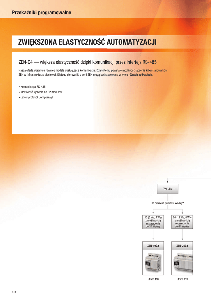 Przekaźniki programowalne ZWIĘKSZONA ELASTYCZNOŚĆ AUTOMATYZACJI ZEN-C4 — większa elastyczność dzięki komunikacji przez interfejs RS-485 Nasza oferta obejmuje również modele obsługujące komunikację. Dzięki temu powstaje możliwość łączenia kilku sterowników ZEN w infrastrukturze sieciowej. Dlatego sterowniki z serii ZEN mogą być stosowane w wielu różnych aplikacjach. • Komunikacja RS-485 • Możliwość łączenia do 32 modułów • Łatwy protokół CompoWayF Typ LED Ile potrzeba punktów We/Wy? 414 10 (6 We, 4 Wy) z możliwością rozszerzenia do 34 We/Wy 20 (12 We, 8 Wy) z możliwością rozszerzenia do 44 We/Wy ZEN-10C2 ZEN-20C2 Strona 418 Strona 419 Przekaźniki programowalne Jaka funkcjonalność jest wymagana? Wyświetlacz z przyciskami, kalendarzem i zegarem Moduł rozszerzenia 10 (6 We, 4 Wy) z możliwością rozszerzenia do 34 We/Wy 20 (12 We, 8 Wy) z możliwością rozszerzenia do 44 We/Wy 10 (6 We, 4 Wy) stałe We/Wy 20 (12 We, 8 Wy) stałe We/Wy ZEN-10C1 ZEN-20C1 ZEN-10C3 ZEN-20C3 ZEN-10C4 ZEN-8E Strona 418 Strona 419 Strona 418 Strona 419 Strona 418 Strona 420 10 (6 We, 4 Wy) rozszerzenie do 33 We/Wy przez moduł komunikacyjny 22 Ile potrzeba dodatkowych punktów We/Wy? Ile potrzeba punktów We/Wy? 8 We/Wy (4 We, 4 Wy) 415 416 Przekaźniki programowalne Tabela wyboru ZEN-10C ZEN-20C Moduł CPU Wersja C1 Wyświetlacz LCD, przyciski programowalne i sterujące, kalendarz i zegar czasu Wyświetlacz LCD, przyciski programowalne i sterujące, kalendarz i zegar czasu Wersja C2 Wskazania LED Sterowanie logiczne Programowanie za pomocą narzędzi Wskazania LED Sterowanie logiczne Programowanie za pomocą narzędzi Wersja C3 Takie same jak w wersji C1, lecz bez możliwości rozszerzenia. Takie same jak w wersji C1, lecz bez możliwości rozszerzenia. Wersja C4 Takie same jak w wersji C1, lecz zamiast jednego wyjścia przekaźnikowego łącze – Liczba punktów We/Wy 10 z możliwością rozszerzenia do 34 We/Wy (C4 do 33 We/Wy) Wejścia 6 Wejścia/zasilanie 100–240 VAC lub 12–24 VDC Wyjścia 4 przekaźnikowe (w C4 3 przekaźnikowe) lub 4 tranzystorowe Strona 418 – 20 z możliwością rozszerzenia do 44 We/Wy 12 100–240 VAC lub 12–24 VDC 8 przekaźnikowych lub 8 tranzystorowych 419 Przekaźniki programowalne Zestawy początkowe Pełny zestaw z jednym modułem CPU wersji C1 oraz oprogramowanie, kabel i instrukcja obsługi 22 Model Specyfikacja Moduł CPU – Nie/brak w ofercie 417 ZEN-10C Przekaźniki programowalne Elastyczna automatyzacja Model ZEN-10C oferuje proste sterowanie logiczne i wybór jednej z czterech jednostek CPU. Trzy z tych jednostek CPU można rozszerzyć do 34 We/Wy, natomiast czwarta (jednostki C3) ma stałą ich liczbę 10 We/Wy. Wszystkie modele stałoprądowe są wyposażone w wejście analogowe i szybkie wejście zliczające (do 150 Hz). • Moduły o wejściach prądu stałego i zasilane prądem stałym są wyposażone w wejście analogowe i szybkie wejście zliczające • Moduł ZEN-10 C4 z portem komunikacyjnym RS-485 • Dostępne są rozszerzenia z wyjściem przekaźnikowym lub tranzystorowym • ZEN-Kits — najlepszy wybór na początek! Informacje dotyczące zamawiania Nazwa Liczba punktów We/Wy Wejścia (I)/ zasilanie Moduły 10 z możli- 6 CPU wością rozszerzenia do 34 We/Wy 100–240 VAC 4 100–240 VAC 10 z możliwością rozszerzenia do 33 We/Wy 100–240 VAC Specy- LCD, fikacja przyciski (B), kalendarz i zegar Przekaźniki LCD Wejście analogowe/ komparatory (A) 8-cyfrowy Liczba bitów 16 licznik (F)/ komparatory (G) Liczba bitów 8 Wymiary w mm Oznaczenie (wys. × szer. × głęb.) Przekaźniki 90 × 70 × 56 czasowe z podtrzymaniem (#) Wejście przyciskowe (B) Tak – – LED – – – LCD Tak tak/4 tak/4 LED – tak/4 tak/4 Tranzysto- LCD rowe LED Tak tak/4 tak/4 – tak/4 tak/4 Przekaźniki LCD Tak – tak/4 LCD Tak tak/4 tak/4 LCD/ Kom. Tak – tak/4 Tak tak/4 tak/4 12–24 VDC Stałe We/Wy Zawartość zestawu ZEN Wyjścia (Q) 12–24 VDC 3 12–24 VDC Bity robocze (M) Bity przechowywania (H) Przekaźniki czasowe (T) Liczniki (C) Tygodniowe przekaźniki czasowe (@) Wyświetlacz LCD (D) Przekaźnik czasowy/licznik komparator (P) ZEN-10C1AR-A-V2 ZEN-10C2AR-A-V2 ZEN-10C1DR-D-V2 ZEN-10C2DR-D-V2 ZEN-10C1DT-D-V2 ZEN-10C2DT-D-V2 ZEN-10C3AR-A-V2 ZEN-10C3DR-D-V2 ZEN-10C4AR-A-V2 ZEN-10C4DR-D-V2 Zestaw zawierający moduł CPU (10C1AR-A-V2), kabel łączący, oprogramowanie wspomagające urządzenia ZEN oraz instrukcję obsługi. ZEN-KIT01-EV4 Zestaw zawierający moduł CPU (10C1DR-D-V2), kabel łączący, oprogramowanie wspomagające urządzenia ZEN oraz instrukcję obsługi. ZEN-KIT02-EV4 Pozostałe dane Element Pozostałe dane ZEN-10C_AR-A-V2 ZEN-10C_D_-D-V2 Napięcie zasilania 100–240 VAC, (50/60 Hz) 12–24 VDC (pulsacja prądu DC: 5%) Znamionowe napięcie zasilające 85–264 VAC 10,8–28,8 VDC Pobór mocy maks. 9 VA maks. 4 W Prąd rozruchowy maks. 3 A maks. 30 A Temperatura otoczenia 0–55°C (od –25°C do 55°C dla modeli ZEN-10C2 [LED]) Warunki składowania Od -20 do +55°C (od -40°C do 75°C dla modeli ZEN-10C2 [LED]) Metoda sterowania Sterowanie za pomocą zapisanego programu Metoda sterowania We/Wy Skanowanie cykliczne Język programowania Diagram drabinkowy Pojemność programu 96 linii (3 warunki wejściowe i 1 wyjście na linię) Wyświetlacz LCD 12 znaków × 4 wiersze, z podświetleniem (tylko moduł CPU typu LCD) Przyciski operacyjne 8 (4 przyciski kursora i 4 przyciski operacyjne) (tylko moduł CPU typu LCD) Czas przechowywania w superkondensatorze Min. 2 dni (25°C) Okres eksploatacji baterii (ZEN-BAT01) Min. 10 lat (25°C) Funkcja zegara i kalendarza Dokładność ±15 s/miesiąc (w temp. 25°C) Akcesoria Nazwa Opis Oznaczenie Kaseta pamięci EEPROM (zabezpieczanie i kopiowanie danych) ZEN-ME01 Moduł baterii Bateria (umożliwia przechowywanie wartości czasu, danych i bitów przez 10 lat w temperaturze 25°C) ZEN-BAT01 Kabel łączący z PC Do korzystania z oprogramowania: kabel RS-