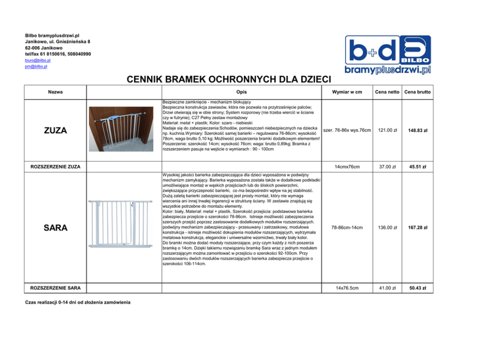 Bilbo bramyplusdrzwi.pl Janikowo, ul. Gnieźnieńska 8 62-006 Janikowo tel/fax 61 8150616, 508040990 [email protected] [email protected] CENNIK BRAMEK OCHRONNYCH DLA DZIECI Nazwa ZUZA Opis ROZSZERZENIE SARA Czas realizacji 0-14 dni od złożenia zamówienia Cena netto Cena brutto 121.00 zł 148.83 zł 14cmx76cm 37.00 zł 45.51 zł 78-86cm-14cm 136.00 zł 167.28 zł 14x76.5cm 41.00 zł 50.43 zł Bezpieczne zamknięcie - mechanizm blokujący Bezpieczna konstrukcja zawiasów, która nie pozwala na przytrzaśnięcie palców; Drzwi otwierają się w obie strony; System rozporowy (nie trzeba wiercić w ścianie czy w futrynie); C27 Pełny zestaw montażowy Materiał: metal + plastik; Kolor: szaro - niebieski Nadaje się do zabezpieczenia:Schodów, pomieszczeń niebezpiecznych na dziecka szer. 76-86x wys.76cm np. kuchnia.Wymiary: Szerokość samej barierki – regulowana 76-86cm; wysokość 78cm, waga brutto 5,10 kg; Możliwość poszerzenia bramki dodatkowym elementem! Poszerzenie: szerokość 14cm; wysokość 76cm; waga: brutto 0,89kg; Bramka z rozszerzeniem pasuje na wejście o wymiarach : 90 - 100cm ROZSZERZENIE ZUZA SARA Wymiar w cm Wysokiej jakości barierka zabezpieczająca dla dzieci wyposażona w podwójny mechanizm zamykający. Barierka wyposażona została także w dodatkowe podkładki umożliwiające montaż w wąskich przejściach lub do śliskich powierzchni, zwiększające przyczepność barierki, co ma bezpośredni wpływ na jej stabilność. Dużą zaletą barierki zabezpieczającej jest prosty montaż, który nie wymaga wiercenia ani innej trwałej ingerencji w strukturę ściany. W zestawie znajdują się wszystkie potrzebne do montażu elementy. Kolor: biały, Materiał: metal + plastik, Szerokość przejścia: podstawowa barierka zabezpiecza przejście o szerokości 78-86cm. Istnieje możliwość zabezpieczenia szerszych przejść poprzez zastosowanie dodatkowych modułów rozszerzających. podwójny mechanizm zabezpieczający - przesuwany i zatrzaskowy, modułowa konstrukcja - istnieje możliwość dokupienia modułów rozszerzających, wytrzymała metalowa konstrukcja, eleganckie i uniwersalne wzornictwo, trwały biały kolor. Do bramki można dodać moduły rozszerzające, przy czym każdy z nich poszerza bramkę o 14cm. Dzięki takiemu rozwiązaniu bramkę Sara wraz z jednym modułem rozszerzającym można zamontować w przejściu o szerokości 92-100cm. Przy zastosowaniu dwóch modułów rozszerzających barierka zabezpiecza przejście o szerokości 106-114cm.