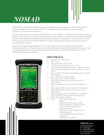 NOMAD Nomad TDS to terminal przenośny do zastosowań zewnętrznych z klasą odporności IP67. Spełnia równieŜ wymogi standardów militarnych MIL-STD-810F w odniesieniu do oddziaływań na wstrząsy, upadek, wilgotność, oraz ekstremalne temperatury. Nomad został wyposaŜony w procesor PXA320 XScale o mocy 806MHz. Wymienialne baterie litowe utrzymują terminal w gotowości przez cały dzień. Wysokiej jakości ekran dotykowy umoŜliwia pracę w warunkach duŜego nasłonecznienia natomiast podświetlana klawiatura ułatwia pracę w ciemnościach. Nomad wyposaŜony został równieŜ w oprogramowanie Windows Mobile 6, co ułatwia jego integrację i dopasowanie do uŜywanych w przedsiębiorstwie aplikacji. Dzięki szerokiej gamie funkcjonalności Nomad w łatwy sposób zbiera, przechowuje i przesyła dane. Zintegrowana funkcja GPS wykorzystywana jest przy aplikacjach nawigacyjnych. Urządzenie dostępne w opcji ze skanerem kodów kreskowych, 2-megapikslową kamerą kodową, głowicą RFID. MoŜliwe jest równieŜ podłączanie dodatkowych urządzeń. SPECYFIKACJA Wymiary: 176 x 100 x 50mm Masa: 596 g Temperatura pracy: -30° C +60° C Temperatura przechowywania: -40° C +70° C Klasa odporności: IP67, MIL-STD-810F – odporność na kurz, puł, wodę, upadek, wilgotność, wibracje, upadek (z wysokości 1,22m) Procesor: Marvell PXA320 Xscale 806MHz, pamięć: 128MB DDR SDRAM Dysk: NAND Flash 512MB do 1GB System operacyjny: Windows Mobile 6 Ekran: 480 x 640 pikseli (VGA), wyświetlacz TFT z podświetleniem Klawiatura numeryczna: podświetlanie ułatwiające pracę nocą Wymienialne baterie litowe gwarantujące całodzienną pracę Złącza: USB, zasilanie, audio, jedno wejście CF, jedno wejście SDIO Komunikacja: Bluetooth 2.0 + EDR WLAN: sieć radiowa 802.11b/g WPA2, system nawigacji satelitarnej GPS Wbudowany mikrofon i głośnik Opcje: Laser 1Dkodu kreskowego Kamera Pakietowa transmisja danych GPRS Zapasowe połączenie szeregowe RS-232 Uchwyt biurkowy (samochodowy) Ładowarka do baterii RFID Kit 13.56MHz, RFID Kit 125kHz Czytnik Smartcard Wspornik trójramienny, kabel interfejsu szeregowego Torba podróŜna z paskiem VEMCO Sp. z o.o. ul. Broniewskiego 3 81 – 837 Sopot T +48 58 550 75 65 F +48 58 550 75 66 www.vemco.pl
