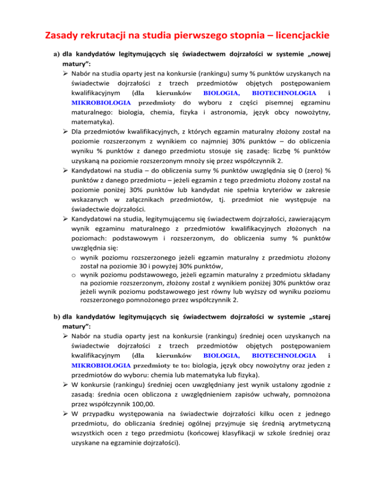 Zasady rekrutacji na studia pierwszego stopnia – licencjackie a) dla kandydatów legitymujących się świadectwem dojrzałości w systemie „nowej matury”: Nabór na studia oparty jest na konkursie (rankingu) sumy % punktów uzyskanych na świadectwie dojrzałości z trzech przedmiotów objętych postępowaniem kwalifikacyjnym (dla kierunków BIOLOGIA, BIOTECHNOLOGIA i MIKROBIOLOGIA przedmioty do wyboru z części pisemnej egzaminu maturalnego: biologia, chemia, fizyka i astronomia, język obcy nowożytny, matematyka). Dla przedmiotów kwalifikacyjnych, z których egzamin maturalny złożony został na poziomie rozszerzonym z wynikiem co najmniej 30% punktów – do obliczenia wyniku % punktów z danego przedmiotu stosuje się zasadę: liczbę % punktów uzyskaną na poziomie rozszerzonym mnoży się przez współczynnik 2. Kandydatowi na studia – do obliczenia sumy % punktów uwzględnia się 0 (zero) % punktów z danego przedmiotu – jeżeli egzamin z tego przedmiotu złożony został na poziomie poniżej 30% punktów lub kandydat nie spełnia kryteriów w zakresie wskazanych w załącznikach przedmiotów, tj. przedmiot nie występuje na świadectwie dojrzałości. Kandydatowi na studia, legitymującemu się świadectwem dojrzałości, zawierającym wynik egzaminu maturalnego z przedmiotów kwalifikacyjnych złożonych na poziomach: podstawowym i rozszerzonym, do obliczenia sumy % punktów uwzględnia się: o wynik poziomu rozszerzonego jeżeli egzamin maturalny z przedmiotu złożony został na poziomie 30 i powyżej 30% punktów, o wynik poziomu podstawowego, jeżeli egzamin maturalny z przedmiotu składany na poziomie rozszerzonym, złożony został z wynikiem poniżej 30% punktów oraz jeżeli wynik poziomu podstawowego jest równy lub wyższy od wyniku poziomu rozszerzonego pomnożonego przez współczynnik 2. b) dla kandydatów legitymujących się świadectwem dojrzałości w systemie „starej matury”: Nabór na studia oparty jest na konkursie (rankingu) średniej ocen uzyskanych na świadectwie dojrzałości z trzech przedmiotów objętych postępowaniem kwalifikacyjnym (dla kierunków BIOLOGIA, BIOTECHNOLOGIA i MIKROBIOLOGIA przedmioty te to: biologia, język obcy nowożytny oraz jeden z przedmiotów do wyboru: chemia lub matematyka lub fizyka). W konkursie (rankingu) średniej ocen uwzględniany jest wynik ustalony zgodnie z zasadą: średnia ocen obliczona z uwzględnieniem zapisów uchwały, pomnożona przez współczynnik 100,00. W przypadku występowania na świadectwie dojrzałości kilku ocen z jednego przedmiotu, do obliczania średniej ogólnej przyjmuje się średnią arytmetyczną wszystkich ocen z tego przedmiotu (końcowej klasyfikacji w szkole średniej oraz uzyskane na egzaminie dojrzałości). Do obliczania średniej ocen na świadectwie dojrzałości i świadectwie ukończenia szkoły średniej (zarówno w tzw. nowej, jak i starej skali ocen) przyjmuje się następujące wartości liczbowe: celujący (6,0), bardzo dobry (5,0), dobry (4,0), dostateczny (3,0), dopuszczający (2,0). W przypadku nie występowania na świadectwie dojrzałości lub ukończenia szkoły średniej oceny z przedmiotu objętego postępowaniem kwalifikacyjnym, do obliczania średniej ocen uwzględnia się 0 (zero) punktów z tego przedmiotu. c) dla kandydatów legitymujących się dyplomem IB Matury Międzynarodowej: Nabór na studia odbywa się na podstawie liczby punktów uzyskanych z egzaminu maturalnego, którego wynik określony na dyplomie IB pomnożony przez współczynnik 13.33, kwalifikuje kandydata w konkursie (rankingu) świadectw dojrzałości. d) dla kandydatów będących laureatami i finalistami olimpiad oraz konkursów stopnia centralnego: Na kierunek BIOLOGIA przyjmowani są laureaci i finaliści olimpiad stopnia centralnego (Olimpiada Biologiczna, Olimpiada Chemiczna, Olimpiada Fizyczna Olimpiada Informatyczna Olimpiada Matematyczna Olimpiada Ochrony Środowiska (ZMW) Olimpiada Wiedzy Ekologicznej) – zgodnie z Uchwałą Nr 628 Senatu UWM z dnia 28 listopada 2014 r. Na kierunek BIOTECHNOLOGIA przyjmowani są laureaci i finaliści olimpiad stopnia centralnego (Olimpiada Biologiczna, Olimpiada Chemiczna, Olimpiada Fizyczna Olimpiada Informatyczna Olimpiada Matematyczna Olimpiada Ochrony Środowiska (ZMW) Olimpiada Wiedzy Ekologicznej, Olimpiada Innowacji Technicznych i Wynalazczości) – zgodnie z Uchwałą Nr 628 Senatu UWM z dnia 28 listopada 2014 r. Na kierunek MIKROBIOLOGIA przyjmowani są laureaci i finaliści olimpiad stopnia centralnego (Olimpiada Biologiczna, Olimpiada Chemiczna, Olimpiada Fizyczna Olimpiada Matematyczna Olimpiada Ochrony Środowiska (ZMW), Olimpiada Wiedzy Ekologicznej, Olimpiada Wiedzy o Żywieniu i Żywności) – zgodnie z Uchwałą Nr 628 Senatu UWM z dnia 28 listopada 2014 r. e) dla kandydatów legitymujących się świadectwem dojrzałości uzyskanym za granicą: Świadectwa maturalne uzyskane za granicą uznaje się za równoważne świadectwom dojrzałości szkół średnich w Polsce, jeżeli zawierają klauzulę stwierdzającą prawo ubiegania się o przyjęcie na studia wyższe w kraju miejsca wydania świadectwa. Punktacji przedmiotowej w skali innej niż 1-6 lub 2-5, nie przelicza się. Oznacza to, że kandydat nie może być bezpośrednio kwalifikowany w konkursie świadectw dojrzałości, lecz w ramach rekrutacji jednoczęściowej obejmującej konkurs świadectw dojrzałości – zobowiązany jest przystąpić do egzaminu wstępnego ustnego z dwóch przedmiotów: biologia i chemia lub matematyka. Egzaminy oceniane są w skali 1-6. Egzamin zostaje uznany za pozytywny w przypadku, gdy kandydat uzyska z obu przedmiotów oceny co najmniej dopuszczające. Jako trzeci przedmiot uznaje się język obcy z oceną 6,0 (celujący) – język kraju, w którym kandydat uzyskał świadectwo dojrzałości. Uzyskana średnia ocen pomnożona przez współczynnik 100,00 kwalifikuje kandydata w konkursie (rankingu) świadectw dojrzałośc