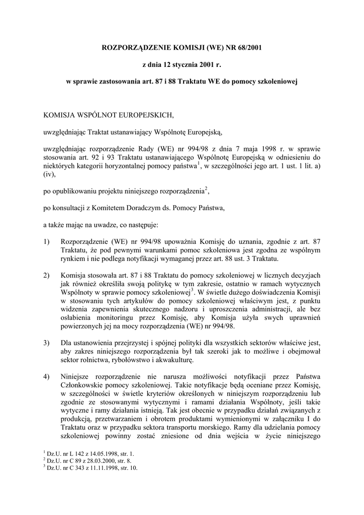 ROZPORZĄDZENIE KOMISJI (WE) NR 68/2001 z dnia 12 stycznia 2001 r. w sprawie zastosowania art. 87 i 88 Traktatu WE do pomocy szkoleniowej KOMISJA WSPÓLNOT EUROPEJSKICH, uwzględniając Traktat ustanawiający Wspólnotę Europejską, uwzględniając rozporządzenie Rady (WE) nr 994/98 z dnia 7 maja 1998 r. w sprawie stosowania art. 92 i 93 Traktatu ustanawiającego Wspólnotę Europejską w odniesieniu do niektórych kategorii horyzontalnej pomocy państwa 1 , w szczególności jego art. 1 ust. 1 lit. a) (iv), po opublikowaniu projektu niniejszego rozporządzenia 2 , po konsultacji z Komitetem Doradczym ds. Pomocy Państwa, a także mając na uwadze, co następuje: 1) Rozporządzenie (WE) nr 994/98 upoważnia Komisję do uznania, zgodnie z art. 87 Traktatu, że pod pewnymi warunkami pomoc szkoleniowa jest zgodna ze wspólnym rynkiem i nie podlega notyfikacji wymaganej przez art. 88 ust. 3 Traktatu. 2) Komisja stosowała art. 87 i 88 Traktatu do pomocy szkoleniowej w licznych decyzjach jak również określiła swoją politykę w tym zakresie, ostatnio w ramach wytycznych Wspólnoty w sprawie pomocy szkoleniowej 3 . W świetle dużego doświadczenia Komisji w stosowaniu tych artykułów do pomocy szkoleniowej właściwym jest, z punktu widzenia zapewnienia skutecznego nadzoru i uproszczenia administracji, ale bez osłabienia monitoringu przez Komisję, aby Komisja użyła swych uprawnień powierzonych jej na mocy rozporządzenia (WE) nr 994/98. 3) Dla ustanowienia przejrzystej i spójnej polityki dla wszystkich sektorów właściwe jest, aby zakres niniejszego rozporządzenia był tak szeroki jak to możliwe i obejmował sektor rolnictwa, rybołówstwo i akwakulturę. 4) Niniejsze rozporządzenie nie narusza możliwości notyfikacji przez Państwa Członkowskie pomocy szkoleniowej. Takie notyfikacje będą oceniane przez Komisję, w szczególności w świetle kryteriów określonych w niniejszym rozporządzeniu lub zgodnie ze stosowanymi wytycznymi i ramami działania Wspólnoty, jeśli takie wytyczne i ramy działania istnieją. Tak jest obecnie w przypadku działań związanych z produkcją, przetwarzaniem i obrotem produktami wymienionymi w załączniku I do Traktatu oraz w przypadku sektora transportu morskiego. Ramy dla udzielania pomocy szkoleniowej powinny zostać zniesione od dnia wejścia w życie niniejszego 1 Dz.U. nr L 142 z 14.05.1998, str. 1. Dz.U. nr C 89 z 28.03.2000, str. 8. 3 Dz.U. nr C 343 z 11.11.1998, str. 10. 2 rozporządzenia, jako że zostaną one zastąpione przez warunki niniejszego rozporządzenia. 5) Dla przejrzystości należy przywołać, że zgodnie z art. 51 ust. 1 akapit drugi rozporządzenia Rady (WE) nr 1257/1999 z dnia 17 maja 1999 r., w sprawie wsparcia rozwoju obszarów wiejskich z Europejskiego Fundusz Orientacji i Gwarancji Rolnej (EFOGR), zmieniającego i uchylającego niektóre rozporządzenia 4 , art. 87 i 89 Traktatu nie stosuje się do wkładów finansowych przekazywanych przez Państwa Członkowskie na środki przeznaczone na wsparcie przez Wspólnotę szkoleń zgodnie z art. 9 wspomnianego rozporządzenia. 6) Dla zachowania przejrzystości należy podkreślić, że niniejsze rozporządzenie powinno stosować się wyłącznie do środków szkoleniowych, które stanowią pomoc państwa w rozumieniu art. 87 ust. 1 Traktatu. Wiele środków szkoleniowych nie jest objętych tym artykułem, stanowią jednak środki ogólne, ponieważ są one otwarte dla wszystkich przedsiębiorstw we wszystkich sektorach bez dyskryminowania któregokolwiek z nich oraz bez uprawnień uznaniowych dla władz podejmujących środki, np. preferencyjne systemy podatkowe takie, jak automatyczne ulgi podatkowe dostępne dla firm dokonujących inwestycji w szkolenie pracownika. Inne środki szkoleniowe nie wchodzą w zakres art. 87 ust. 1 Traktatu, ponieważ przynoszą one bezpośrednią korzyść ludziom wszędzie a nie faworyzują tylko niektórych przedsiębiorstw albo sektorów. Przykładami na to są: kształcenie i szkolenie początkowe (takie, jak odbywanie praktyk czy systemy zwalniania dziennego); szkolenia przysposabiające lub przekwalifikowujące dla bezrobotnych, w tym odbywanie szkoleń w przedsiębiorstwach; środki skierowane bezpośrednio do pracowników czy nawet niektórych kategorii pracowników, dające im szansę uczestniczenia w szkoleniu niezwiązanym z firmą, czy nawet branżą, w której pracują (np. „rachunek szkoleniowy”). Z drugiej strony należy przywołać, że wkłady z funduszy branżowych, jeżeli tylko państwo czyni je obowiązkowymi, nie są traktowane jako środki prywatne, ale tworzą zasoby państwowe w rozumieniu art. 87 ust. 1 Traktatu. 7) Niniejsze rozporządzenie powinno zwalniać każdą pomoc spełniającą wszelkie odpowiednie warunki niniejszego rozporządzenia oraz każdy system pomocowy pod warunkiem, że każda pomoc jaka mogłaby zostać przyznana w ramach tego systemu spełnia wszelkie odpowiednie warunki niniejszego rozporządzenia. Mając na uwadze zapewnienie skutecznego nadzoru i uproszczenia administracji, bez osłabienia monitoringu przez Komisję, systemy pomocowe i indywidualne dotacje przyznawane poza jakimikolwiek systemami pomocowymi powinny zawierać wyraźne odwołanie do niniejszego rozporządzenia. 8) W celu wyeliminowania różnic, które mogłyby spowodować zakłócenie konkurencji, w celu ułatwienia koordynacji między różnymi inicjatywami Wspólnoty i inicjatywami poszczególnych państw, dotyczącymi małych i średnich przedsiębiorstw oraz ze względu na przejrzystość administracyjną i pewność prawną, definicja „małych i średnich przedsiębiorstw” stosowana w niniejszym rozporządzeniu jest zgodna z określoną w zaleceniu Komisji 96/280/WE z dnia 3 kwietnia 1996 r., dotyczącym definicji małych i średnich przedsiębiorstw 5 . 4 5 Dz.U. nr L 160 z 26.06.1999, str. 80. Dz.U. nr L 107 z 30.04.1996, str. 4. 9) W celu ustalenia, czy pomoc jest zgodna ze wspólnym rynkiem stosownie