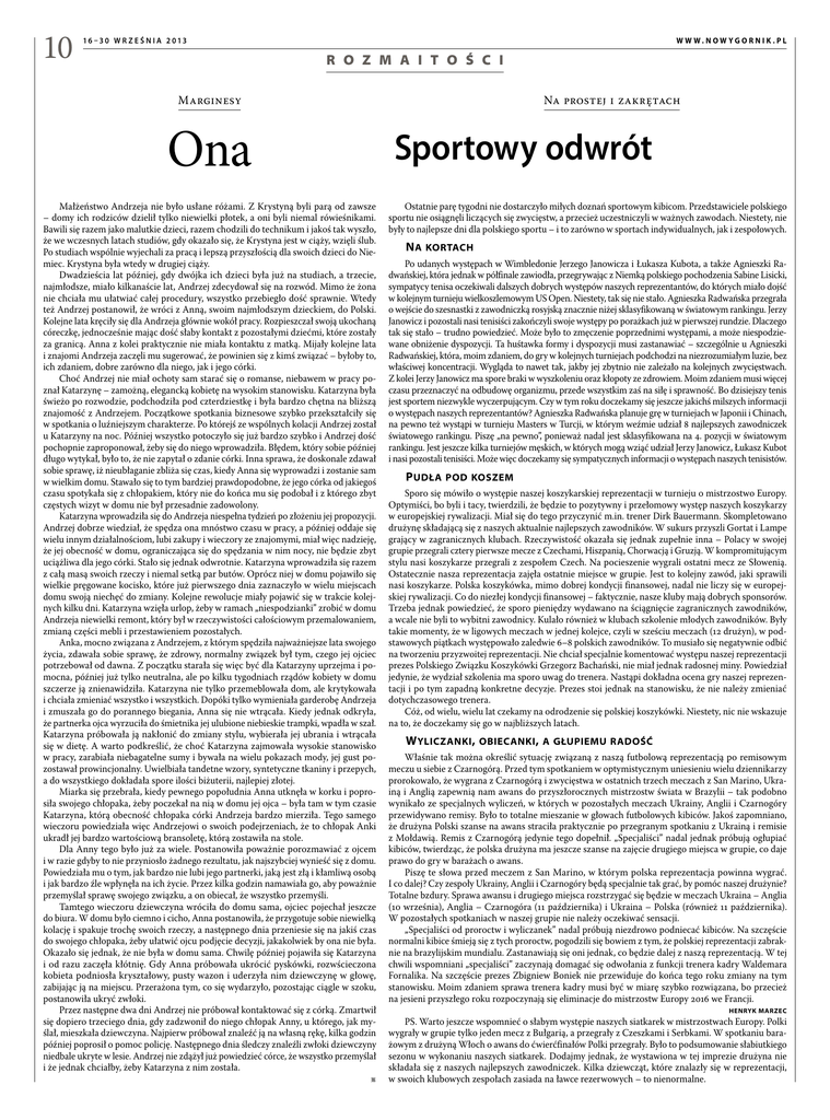 10 w w w.now ygornik.pl 16 –3 0 w r z e ś n i a 2 013 r o z m a i t o ś c i Marginesy Ona Małżeństwo Andrzeja nie było usłane różami. Z Krystyną byli parą od zawsze – domy ich rodziców dzielił tylko niewielki płotek, a oni byli niemal rówieśnikami. Bawili się razem jako malutkie dzieci, razem chodzili do technikum i jakoś tak wyszło, że we wczesnych latach studiów, gdy okazało się, że Krystyna jest w ciąży, wzięli ślub. Po studiach wspólnie wyjechali za pracą i lepszą przyszłością dla swoich dzieci do Niemiec. Krystyna była wtedy w drugiej ciąży. Dwadzieścia lat później, gdy dwójka ich dzieci była już na studiach, a trzecie, najmłodsze, miało kilkanaście lat, Andrzej zdecydował się na rozwód. Mimo że żona nie chciała mu ułatwiać całej procedury, wszystko przebiegło dość sprawnie. Wtedy też Andrzej postanowił, że wróci z Anną, swoim najmłodszym dzieckiem, do Polski. Kolejne lata kręciły się dla Andrzeja głównie wokół pracy. Rozpieszczał swoją ukochaną córeczkę, jednocześnie mając dość słaby kontakt z pozostałymi dziećmi, które zostały za granicą. Anna z kolei praktycznie nie miała kontaktu z matką. Mijały kolejne lata i znajomi Andrzeja zaczęli mu sugerować, że powinien się z kimś związać – byłoby to, ich zdaniem, dobre zarówno dla niego, jak i jego córki. Choć Andrzej nie miał ochoty sam starać się o romanse, niebawem w pracy poznał Katarzynę – zamożną, elegancką kobietę na wysokim stanowisku. Katarzyna była świeżo po rozwodzie, podchodziła pod czterdziestkę i była bardzo chętna na bliższą znajomość z Andrzejem. Początkowe spotkania biznesowe szybko przekształciły się w spotkania o luźniejszym charakterze. Po którejś ze wspólnych kolacji Andrzej został u Katarzyny na noc. Później wszystko potoczyło się już bardzo szybko i Andrzej dość pochopnie zaproponował, żeby się do niego wprowadziła. Błędem, który sobie później długo wytykał, było to, że nie zapytał o zdanie córki. Inna sprawa, że doskonale zdawał sobie sprawę, iż nieubłaganie zbliża się czas, kiedy Anna się wyprowadzi i zostanie sam w wielkim domu. Stawało się to tym bardziej prawdopodobne, że jego córka od jakiegoś czasu spotykała się z chłopakiem, który nie do końca mu się podobał i z którego zbyt częstych wizyt w domu nie był przesadnie zadowolony. Katarzyna wprowadziła się do Andrzeja niespełna tydzień po złożeniu jej propozycji. Andrzej dobrze wiedział, że spędza ona mnóstwo czasu w pracy, a później oddaje się wielu innym działalnościom, lubi zakupy i wieczory ze znajomymi, miał więc nadzieję, że jej obecność w domu, ograniczająca się do spędzania w nim nocy, nie będzie zbyt uciążliwa dla jego córki. Stało się jednak odwrotnie. Katarzyna wprowadziła się razem z całą masą swoich rzeczy i niemal setką par butów. Oprócz niej w domu pojawiło się wielkie pręgowane kocisko, które już pierwszego dnia zaznaczyło w wielu miejscach domu swoją niechęć do zmiany. Kolejne rewolucje miały pojawić się w trakcie kolejnych kilku dni. Katarzyna wzięła urlop, żeby w ramach „niespodzianki” zrobić w domu Andrzeja niewielki remont, który był w rzeczywistości całościowym przemalowaniem, zmianą części mebli i przestawieniem pozostałych. Anka, mocno związana z Andrzejem, z którym spędziła najważniejsze lata swojego życia, zdawała sobie sprawę, że zdrowy, normalny związek był tym, czego jej ojciec potrzebował od dawna. Z początku starała się więc być dla Katarzyny uprzejma i pomocna, później już tylko neutralna, ale po kilku tygodniach rządów kobiety w domu szczerze ją znienawidziła. Katarzyna nie tylko przemeblowała dom, ale krytykowała i chciała zmieniać wszystko i wszystkich. Dopóki tylko wymieniała garderobę Andrzeja i zmuszała go do porannego biegania, Anna się nie wtrącała. Kiedy jednak odkryła, że partnerka ojca wyrzuciła do śmietnika jej ulubione niebieskie trampki, wpadła w szał. Katarzyna próbowała ją nakłonić do zmiany stylu, wybierała jej ubrania i wtrącała się w dietę. A warto podkreślić, że choć Katarzyna zajmowała wysokie stanowisko w pracy, zarabiała niebagatelne sumy i bywała na wielu pokazach mody, jej gust pozostawał prowincjonalny. Uwielbiała tandetne wzory, syntetyczne tkaniny i przepych, a do wszystkiego dokładała spore ilości biżuterii, najlepiej złotej. Miarka się przebrała, kiedy pewnego popołudnia Anna utknęła w korku i poprosiła swojego chłopaka, żeby poczekał na nią w domu jej ojca – była tam w tym czasie Katarzyna, którą obecność chłopaka córki Andrzeja bardzo mierziła. Tego samego wieczoru powiedziała więc Andrzejowi o swoich podejrzeniach, że to chłopak Anki ukradł jej bardzo wartościową bransoletę, którą zostawiła na stole. Dla Anny tego było już za wiele. Postanowiła poważnie porozmawiać z ojcem i w razie gdyby to nie przyniosło żadnego rezultatu, jak najszybciej wynieść się z domu. Powiedziała mu o tym, jak bardzo nie lubi jego partnerki, jaką jest złą i kłamliwą osobą i jak bardzo źle wpłynęła na ich życie. Przez kilka godzin namawiała go, aby poważnie przemyślał sprawę swojego związku, a on obiecał, że wszystko przemyśli. Tamtego wieczoru dziewczyna wróciła do domu sama, ojciec pojechał jeszcze do biura. W domu było ciemno i cicho, Anna postanowiła, że przygotuje sobie niewielką kolację i spakuje trochę swoich rzeczy, a następnego dnia przeniesie się na jakiś czas do swojego chłopaka, żeby ułatwić ojcu podjęcie decyzji, jakakolwiek by ona nie była. Okazało się jednak, że nie była w domu sama. Chwilę później pojawiła się Katarzyna i od razu zaczęła kłótnię. Gdy Anna próbowała ukrócić pyskówki, rozwścieczona kobieta podniosła kryształowy, pusty wazon i uderzyła nim dziewczynę w głowę, zabijając ją na miej
