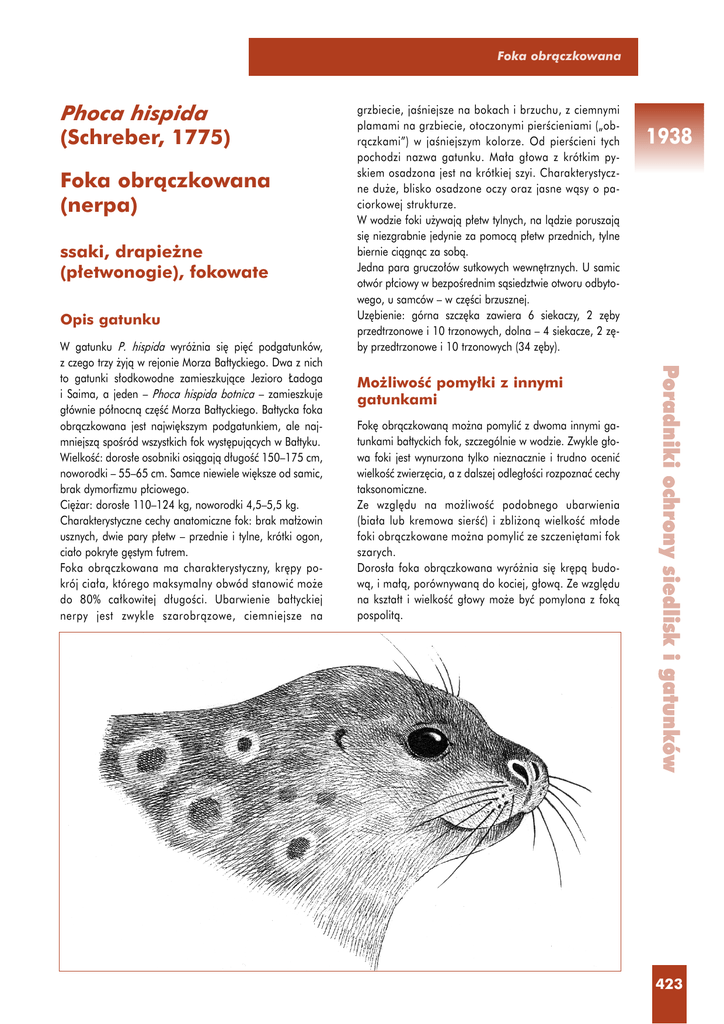 Foka obràczkowana Nazwa ssaka Phoca hispida (Schreber, 1775) Foka obràczkowana (nerpa) ssaki, drapie˝ne (p∏etwonogie), fokowate Opis gatunku Mo˝liwoÊç pomy∏ki z innymi gatunkami Fok´ obràczkowanà mo˝na pomyliç z dwoma innymi gatunkami ba∏tyckich fok, szczególnie w wodzie. Zwykle g∏owa foki jest wynurzona tylko nieznacznie i trudno oceniç wielkoÊç zwierz´cia, a z dalszej odleg∏oÊci rozpoznaç cechy taksonomiczne. Ze wzgl´du na mo˝liwoÊç podobnego ubarwienia (bia∏a lub kremowa sierÊç) i zbli˝onà wielkoÊç m∏ode foki obràczkowane mo˝na pomyliç ze szczeni´tami fok szarych. Doros∏a foka obràczkowana wyró˝nia si´ kr´pà budowà, i ma∏à, porównywanà do kociej, g∏owà. Ze wzgl´du na kszta∏t i wielkoÊç g∏owy mo˝e byç pomylona z fokà pospolità. 1938 Poradniki ochrony siedlisk i gatunków W gatunku P. hispida wyró˝nia si´ pi´ç podgatunków, z czego trzy ˝yjà w rejonie Morza Ba∏tyckiego. Dwa z nich to gatunki s∏odkowodne zamieszkujàce Jezioro ¸adoga i Saima, a jeden – Phoca hispida botnica – zamieszkuje g∏ównie pó∏nocnà cz´Êç Morza Ba∏tyckiego. Ba∏tycka foka obràczkowana jest najwi´kszym podgatunkiem, ale najmniejszà spoÊród wszystkich fok wyst´pujàcych w Ba∏tyku. WielkoÊç: doros∏e osobniki osiàgajà d∏ugoÊç 150–175 cm, noworodki – 55–65 cm. Samce niewiele wi´ksze od samic, brak dymorfizmu p∏ciowego. Ci´˝ar: doros∏e 110–124 kg, noworodki 4,5–5,5 kg. Charakterystyczne cechy anatomiczne fok: brak ma∏˝owin usznych, dwie pary p∏etw – przednie i tylne, krótki ogon, cia∏o pokryte g´stym futrem. Foka obràczkowana ma charakterystyczny, kr´py pokrój cia∏a, którego maksymalny obwód stanowiç mo˝e do 80% ca∏kowitej d∏ugoÊci. Ubarwienie ba∏tyckiej nerpy jest zwykle szarobràzowe, ciemniejsze na grzbiecie, jaÊniejsze na bokach i brzuchu, z ciemnymi plamami na grzbiecie, otoczonymi pierÊcieniami („obràczkami”) w jaÊniejszym kolorze. Od pierÊcieni tych pochodzi nazwa gatunku. Ma∏a g∏owa z krótkim pyskiem osadzona jest na krótkiej szyi. Charakterystyczne du˝e, blisko osadzone oczy oraz jasne wàsy o paciorkowej strukturze. W wodzie foki u˝ywajà p∏etw tylnych, na làdzie poruszajà si´ niezgrabnie jedynie za pomocà p∏etw przednich, tylne biernie ciàgnàc za sobà. Jedna para gruczo∏ów sutkowych wewn´trznych. U samic otwór p∏ciowy w bezpoÊrednim sàsiedztwie otworu odbytowego, u samców – w cz´Êci brzusznej. Uz´bienie: górna szcz´ka zawiera 6 siekaczy, 2 z´by przedtrzonowe i 10 trzonowych, dolna – 4 siekacze, 2 z´by przedtrzonowe i 10 trzonowych (34 z´by). 423 Gatunki zwierzàt (z wyjàtkiem ptaków) – Ssaki Poradniki ochrony siedlisk i gatunków 1938 424 Cechy biologiczne Cechy ekologiczne Rozmna˝anie Gatunek poligamiczny. Samce prawdopodobnie bronià podwodnych terytoriów. Samice osiàgajà dojrza∏oÊç p∏ciowà w wieku 3–6 lat, samce nieco póêniej. Ruja odbywa si´ pod koniec marca, kopulacja – w wodzie, rzadziej na làdzie. Cià˝a trwa ok. 330–340 dni (do implantacji zarodka dochodzi po 3–3,5 miesiàca). Rozród odbywa si´ pod koniec lutego i na poczàtku marca, zawsze na lodzie. Na Êwiat przychodzi jedno szczeni´, pokryte kremowym futrem, które traci po okresie 4–6 tygodni. Laktacja trwa 5–7 tygodni, dzienny przyrost wagi – ok. 350–400 g. Ze wzgl´du na du˝à presj´ drapie˝ników matka bardzo wczeÊnie rozpoczyna nauczanie potomstwa nurkowania i polowania, a m∏ode wi´kszoÊç czasu sp´dza w wodzie. W przesz∏oÊci jako najliczniejsza foka ba∏tycka zapewne odgrywa∏a istotnà rol´ w kszta∏towaniu relacji troficznych w miejscach ˝erowania. Obecnie jej znaczenie ekologiczne jako drapie˝nika ograniczone jest prawie wy∏àcznie do Zatoki Botnickiej, grupujàcej najwi´kszà iloÊç siedlisk, których w∏aÊciwoÊci najbardziej sprzyjajà rozmna˝aniu i ˝erowaniu fok obràczkowanych. Klimat w tej cz´Êci Ba∏tyku najpe∏niej odpowiada temu arktycznemu reliktowi. Jego przetrwanie warunkujà g∏ównie zjawiska lodowe i Êniegowe regionu. W Polsce, z uwagi na ograniczone zlodzenie morza, siedlisk odpowiednich dla fok obràczkowanych nie ma. Jedynym miejscem, gdzie niemal co roku odnotowuje si´ pokryw´ lodowà, jest wewn´trzna cz´Êç Zatoki Puckiej. Na jej skraju, w oparciu o mielizny Ryfu Mew, tworzà si´ zwa∏y kry, które utrzymujàc si´ przez par´ tygodni, mogà teoretycznie stanowiç dogodne miejsce dla rozrodu tego gatunku. Jak dotàd obserwacji takiej nie odnotowano, jednak przypadek z∏owienia w tej okolicy bardzo m∏odej foki obràczkowanej w dn. 4 kwietnia 1996 r. nie wyklucza mo˝liwoÊci takiego zdarzenia. AktywnoÊç Samica rodzi m∏ode na zamarzni´tych akwenach, w specjalnie wykopanej jamie Ênie˝nolodowej i ukrywa je tam przed drapie˝nikami (lisy, or∏y bieliki) przez ca∏y okres karmienia. Foki obràczkowane zwykle ˝yjà samotnie. Rozproszone na powierzchni zamarzni´tego akwenu, sà agresywne wobec innych osobników. W miejscach pobytu utrzymujà w lodzie otwory oddechowe. Wi´ksze skupienia tworzà w okresach linienia lub ˝erowania letniego. Linienie ma miejsce w kwietniu i maju. Le˝àc wówczas na topniejàcym ju˝ lodzie, sà czujne i agresywne. Od maja do listopada widywane sà cz´Êciej u brzegów lub na przybrze˝nych ska∏kach Zatok Ryskiej i Fiƒskiej. W Zatoce Botnickiej nawet w okresach, kiedy nie ma lodu, ˝yjà samotnie. Tak˝e u wybrze˝y polskich widuje si´ wy∏àcznie pojedyncze sztuki. Zdarza si´ to póênà wiosnà i latem. Sposób od˝ywiania W rejonach sta∏ej egzystencji gatunku sk∏ad pokarmu jest bardzo urozmaicony. W Zalewie Fiƒskim 60% udzia∏u majà w równych cz´Êciach Êledzie i cierniki. Reszt´ diety tworzà stynki, w´gorzyce, szproty, babki, minogi i skorupiaki. Natomiast w Zatoce Botnickiej, gdzie fok obràczkowanych jest najwi´cej, ponad 25% po˝ywienia stanowià skorupiaki (podwój –