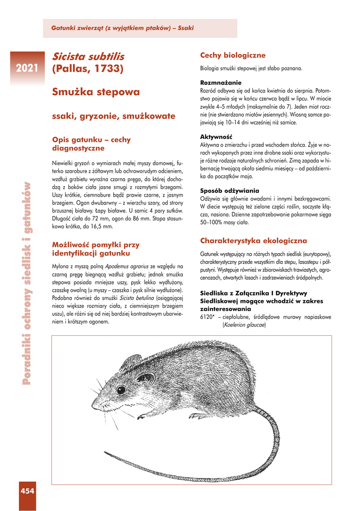Gatunki zwierzàt (z wyjàtkiem ptaków) – Ssaki 2021 Sicista subtilis (Pallas, 1733) Smu˝ka stepowa ssaki, gryzonie, smu˝kowate Poradniki ochrony siedlisk i gatunków Opis gatunku – cechy diagnostyczne 454 Niewielki gryzoƒ o wymiarach ma∏ej myszy domowej, futerko szarobure z ˝ó∏tawym lub ochroworudym odcieniem, wzd∏u˝ grzbietu wyraêna czarna pr´ga, do której dochodzà z boków cia∏a jasne smugi z rozmytymi brzegami. Uszy krótkie, ciemnobure bàdê prawie czarne, z jasnym brzegiem. Ogon dwubarwny – z wierzchu szary, od strony brzusznej bia∏awy. ¸apy bia∏awe. U samic 4 pary sutków. D∏ugoÊç cia∏a do 72 mm, ogon do 86 mm. Stopa stosunkowo krótka, do 16,5 mm. Mo˝liwoÊç pomy∏ki przy identyfikacji gatunku Mylona z myszà polnà Apodemus agrarius ze wzgl´du na czarnà pr´g´ biegnàcà wzd∏u˝ grzbietu; jednak smu˝ka stepowa posiada mniejsze uszy, pysk lekko wyd∏u˝ony, czaszk´ owalnà (u myszy – czaszka i pysk silnie wyd∏u˝one). Podobna równie˝ do smu˝ki Sicista betulina (osiàgajàcej nieco wi´ksze rozmiary cia∏a, z ciemniejszym brzegiem uszu), ale ró˝ni si´ od niej bardziej kontrastowym ubarwieniem i krótszym ogonem. Cechy biologiczne Biologia smu˝ki stepowej jest s∏abo poznana. Rozmna˝anie Rozród odbywa si´ od koƒca kwietnia do sierpnia. Potomstwo pojawia si´ w koƒcu czerwca bàdê w lipcu. W miocie zwykle 4–5 m∏odych (maksymalnie do 7). Jeden miot rocznie (nie stwierdzono miotów jesiennych). Wiosnà samce pojawiajà si´ 10–14 dni wczeÊniej ni˝ samice. AktywnoÊç Aktywna o zmierzchu i przed wschodem s∏oƒca. ˚yje w norach wykopanych przez inne drobne ssaki oraz wykorzystuje ró˝ne rodzaje naturalnych schronieƒ. Zimà zapada w hibernacj´ trwajàcà oko∏o siedmiu miesi´cy – od paêdziernika do poczàtków maja. Sposób od˝ywiania Od˝ywia si´ g∏ównie owadami i innymi bezkr´gowcami. W diecie wyst´pujà te˝ zielone cz´Êci roÊlin, soczyste k∏àcza, nasiona. Dzienne zapotrzebowanie pokarmowe si´ga 50–100% masy cia∏a. Charakterystyka ekologiczna Gatunek wyst´pujàcy na ró˝nych typach siedlisk (eurytopowy), charakterystyczny przede wszystkim dla stepu, lasostepu i pó∏pustyni. Wyst´puje równie˝ w zbiorowiskach trawiastych, agrocenozach, otwartych lasach i zadrzewieniach Êródpolnych. Siedliska z Za∏àcznika I Dyrektywy Siedliskowej mogàce wchodziç w zakres zainteresowania 6120* – ciep∏olubne, Êródlàdowe murawy napiaskowe (Koelerion glaucae) Smu˝ka Nazwa stepowa ssaka 6210 – murawy kserotermiczne (* ze storczykami) 6510 – ni˝owe i górskie Êwie˝e ∏àki u˝ytkowane ekstensywnie (Arrhenatherion elatioris) Rozmieszczenie geograficzne Ca∏kowity zasi´g gatunku Area∏ smu˝ki stepowej obejmuje Êrodkowà Europ´, Ukrain´, Rosj´, a˝ do Irkucka. Na po∏udniu si´ga do W´gier i Rumunii, przez Bu∏gari´, pó∏nocny Kazachstan, a˝ do po∏udniowo-zachodnich Chin. Smu˝ka stepowa wymar∏a w Austrii. Szczàtki kopalne pochodzà ze Êrodkowego plejstocenu z terenów obecnej Ukrainy. Przemiany i stan populacji Brak danych dotyczàcych liczebnoÊci smu˝ki stepowej w Polsce. Mo˝na spodziewaç si´ ujawnienia innych stanowisk w naszym kraju. Brak prognoz dotyczàcych rozwoju populacji i potencjalnych dla niego zagro˝eƒ. Potencjalne zagro˝enia Podstawowe zagro˝enia zwiàzane sà z degradacjà siedlisk kserotermicznych, ale trudno oszacowaç ich potencjalny wp∏yw na populacj´ smu˝ki stepowej w Polsce. Propozycje dzia∏aƒ ochronnych Propozycje dotyczàce siedliska gatunku Nale˝y utrzymywaç stepowy charakter siedliska w miejscu wyst´powania smu˝ki stepowej. Na znanym obecnie stanowisku nale˝y wykonywaç okresowe koszenia oraz wycinanie drzew i krzewów w nawrotach pi´cioletnich – za ka˝dym razem na po∏owie powierzchni. Podobnie nale˝y post´powaç na innych stanowiskach, w przypadku ich wykrycia. Propozycje dotyczàce gatunku Utrzymanie dotychczasowych zasad ochrony gatunku – smu˝ka stepowa powinna pozostaç na liÊcie gatunków obj´tych ochronà Êcis∏à. 0 50 100 km Kierunki i zakres badaƒ naukowych stanowisko Wspó∏czesne wyst´powanie smu˝ki stepowej w Polsce Wyst´powanie gatunku na obszarach chronionych Stwierdzone stanowisko wyst´puje na obszarze rozleg∏ego u˝ytku ekologicznego Machnowska Góra. Status gatunku Prawo mi´dzynarodowe Konwencja Berneƒska Dyrektywa Siedliskowa Prawo krajowe ochrona gatunkowa w Polsce Kategorie IUCN Czerwona lista IUCN (1996) Polska czerwona lista Polska czerwona ksi´ga – Za∏àcznik II – Za∏àcznik II i IV – ochrona Êcis∏a – LR/nt – EN – EN 2021 Na terenie Polski nie prowadzono gruntownych badaƒ nad tym gatunkiem. Nale˝y rozpoznaç szczegó∏y jego biologii oraz cechy ekologiczne krajowej populacji. Monitoring Proponuje si´ d∏ugoterminowy monitoring w celu prognozowania zmian liczebnoÊci populacji. Monitoring powinien byç prowadzony dwiema metodami badawczymi: • metodà CMR (wielokrotnego od∏awiania, znakowania i wypuszczania smu˝ek z pu∏apek ˝ywo∏ownych zawierajàcych przyn´t´ pokarmowà) w trakcie sezonu wegetacyjnego, w comiesi´cznych seriach od∏owów obejmujàcych po kilka nocy; • przy u˝yciu nadajników radiotelemetrycznych, które umo˝liwiajà Êledzenie u˝ytkowania przestrzeni przez zwierz´ta oraz okreÊlenie socjalno-przestrzennej organizacji populacji. Poradniki ochrony siedlisk i gatunków Zasi´g wyst´powania w Polsce W Polsce znana tylko z jednego stanowiska mi´dzy miejscowoÊciami Korynie i Machnów, gdzie z∏owiono jeden okaz i znaleziono kilka innych w wypluwkach ptaków. Przemiany i stan populacji w skali kraju, potencjalne zagro˝enia 455 Gatunki zwierzàt (z wyjàtkiem ptaków) – Ssaki Bibliografia Poradniki ochrony siedlisk i gatunków 2021 456 BARANIAK E., KUBASIK W., PA¸KA K. 1998. Smu˝ka stepowa Sisicta subtilis (Pallas, 1773) (Rodentia: Zapodidae) – nowy gatunek ssaka w faunie Polski. Przegl. zool., 242: 241–24