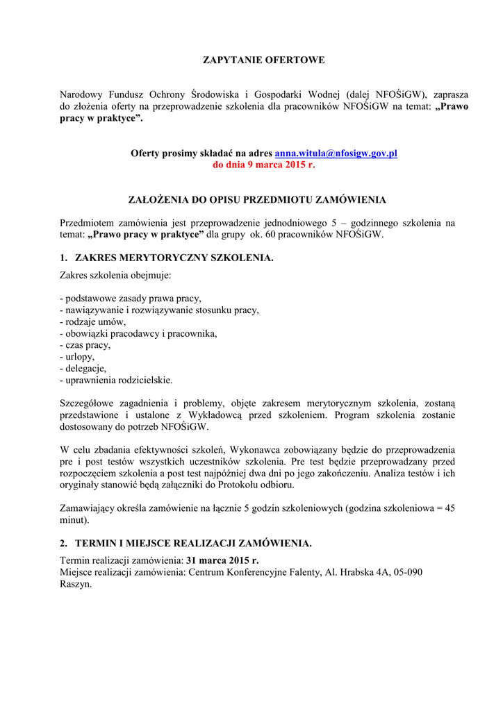 ZAPYTANIE OFERTOWE Narodowy Fundusz Ochrony Środowiska i Gospodarki Wodnej (dalej NFOŚiGW), zaprasza do złoŜenia oferty na przeprowadzenie szkolenia dla pracowników NFOŚiGW na temat: „Prawo pracy w praktyce”. Oferty prosimy składać na adres [email protected] do dnia 9 marca 2015 r. ZAŁOśENIA DO OPISU PRZEDMIOTU ZAMÓWIENIA Przedmiotem zamówienia jest przeprowadzenie jednodniowego 5 – godzinnego szkolenia na temat: „Prawo pracy w praktyce” dla grupy ok. 60 pracowników NFOŚiGW. 1. ZAKRES MERYTORYCZNY SZKOLENIA. Zakres szkolenia obejmuje: - podstawowe zasady prawa pracy, - nawiązywanie i rozwiązywanie stosunku pracy, - rodzaje umów, - obowiązki pracodawcy i pracownika, - czas pracy, - urlopy, - delegacje, - uprawnienia rodzicielskie. Szczegółowe zagadnienia i problemy, objęte zakresem merytorycznym szkolenia, zostaną przedstawione i ustalone z Wykładowcą przed szkoleniem. Program szkolenia zostanie dostosowany do potrzeb NFOŚiGW. W celu zbadania efektywności szkoleń, Wykonawca zobowiązany będzie do przeprowadzenia pre i post testów wszystkich uczestników szkolenia. Pre test będzie przeprowadzany przed rozpoczęciem szkolenia a post test najpóźniej dwa dni po jego zakończeniu. Analiza testów i ich oryginały stanowić będą załączniki do Protokołu odbioru. Zamawiający określa zamówienie na łącznie 5 godzin szkoleniowych (godzina szkoleniowa = 45 minut). 2. TERMIN I MIEJSCE REALIZACJI ZAMÓWIENIA. Termin realizacji zamówienia: 31 marca 2015 r. Miejsce realizacji zamówienia: Centrum Konferencyjne Falenty, Al. Hrabska 4A, 05-090 Raszyn. 3. UCZESTNICY. W szkoleniu będą uczestniczyć pracownicy NFOŚiGW - członkowie grupy Lider oraz pracownicy zajmujący m. in. stanowiska kierownicze i koordynujące w NFOŚiGW. Liczba uczestników szkolenia wynosi łącznie ok. 60 osób. 4. TRENER/WYKŁADOWCA. 4.1. Warunkiem przystąpienia do postępowania o udzielenie zamówienia na przeprowadzenie szkolenia nt. „Prawo pracy w praktyce” dla pracowników NFOŚiGW jest wskazanie przez Wykonawcę Wykładowcy posiadającego doświadczenie w prowadzeniu szkoleń w zakresie prawa pracy, tj. przeprowadzenie przez niego co najmniej 5 szkoleń z zakresu prawa pracy w ciągu ostatnich 12 miesięcy od dnia otrzymania/publikacji zapytania ofertowego. 4.2. W przypadku uzasadnionej konieczności zmiany Wykładowcy, Wykonawca zapewnia zastępstwo osoby o kwalifikacjach i doświadczeniu zawodowym nie gorszych, niŜ Wykładowcy zastępowanego, przedstawiając Zamawiającemu potwierdzenie jego kwalifikacji i doświadczenia. 4.3. Zamawiający dopuszcza moŜliwość prowadzenia szkolenia przez więcej niŜ jednego Wykładowcę pod warunkiem, Ŝe osoby te zostały zgłoszone do prowadzenia szkolenia w ofercie i spełniają warunki udziału w postępowaniu (bez dodatkowych kosztów – cena za 1 h szkolenia bez względu na liczbę Wykładowców). 5. PROGRAM SZKOLENIA. Zamawiający oczekuje od Wykonawcy, przed rozpoczęciem szkolenia, przedstawienia propozycji programu szkolenia opartego o wymienione w pkt. 1 zagadnienia wraz z propozycją czasu na poszczególne zagadnienia. Wykonawca powinien kierować się swoim doświadczeniem w doborze metod szkolenia. 6. MATERIAŁY SZKOLENIOWE. 6.1. Wykonawca przygotuje i przekaŜe Zamawiającemu najpóźniej na 2 dni robocze przed rozpoczęciem szkolenia jeden egzemplarz materiałów merytorycznych i reminderów (przypominaczy – specjalnie przygotowanych arkuszy zawierających najwaŜniejsze elementy szkolenia w formie skondensowanej, w celu łatwiejszego wykorzystania ich w codziennej pracy) w formie elektronicznej do zatwierdzenia przez Zamawiającego. 6.2. Wykonawca zapewni kaŜdemu uczestnikowi szkolenia papierową wersję merytorycznych materiałów szkoleniowych i reminderów. 6.3. Wykonawca przekaŜe jeden egzemplarz materiałów szkoleniowych, reminderów oraz pre i post testów w formie papierowej i elektronicznej (płyta CD) dla Zamawiającego, jako załącznik do protokołu odbioru szkolenia, które zostaną załączone do dokumentacji szkolenia. 6.4. Wykonawca poniesie pełny koszt przygotowania dokumentów określonych w ppkt. 1, 2 i 3 bez dodatkowych roszczeń w stosunku do Zamawiającego związanych ze zwrotem kosztów zakupu, czy ich przygotowania. 7. ORGANIZACJA SZKOLENIA. 7.1. Zamawiający dostarczy Wykonawcy imienną listę uczestników szkolenia na co najmniej 2 dni robocze przed rozpoczęciem szkolenia, z zastrzeŜeniem moŜliwości jej zmiany/modyfikacji w celu zapewnienia pełnego wykorzystania miejsc na szkoleniu. Wykonawca jest zobowiązany do ścisłej współpracy z Zamawiającym w zakresie maksymalnego wykorzystania miejsc zaplanowanych na szkoleniu. 2 7.2. Zamawiający zapewnia salę szkoleniową z wyposaŜeniem i wyŜywieniem dla uczestników szkolenia i Wykładowcy. 7.3. Wykonawca opracuje i przedłoŜy Zamawiającemu protokół odbioru po zakończeniu szkolenia. Płatność faktury za realizację szkolenia nastąpi po podpisaniu przez Zamawiającego protokołu odbioru potwierdzającego prawidłowe wykonanie przedmiotu umowy. Protokół odbioru szkolenia winien zawierać w szczególności: a) imiona i nazwiska pracowników, którzy ukończyli szkolenie, b) imię i nazwisko Wykładowcy, który prowadził szkolenie, c) temat i termin szkolenia, d) informację o przebiegu szkolenia (opis nabytych przez uczestników kwalifikacji, liczba godzin zajęć wraz z opisem realizowanej na zajęciach tematyki), e) komplet merytorycznych materiałów szkoleniowych i reminderów (wersja elektroniczna – płyta CD i papierowa – papier ekologiczny), f) analizę testów badających efektywność szkolenia oraz ich oryginały. 7.4. Zaświadczenia o ukończeniu szkolenia przygotuje Zamawiający. 8. PŁATNOŚĆ ZA SZKOLENIE. Płatność za szkolenie nastąpi po podpisaniu przez Zamawiającego protokołu odbioru szkolenia potwierdzającego prawidłowe wykonanie przedmiotu umowy, na podstawie prawidłowo wystawionej prze