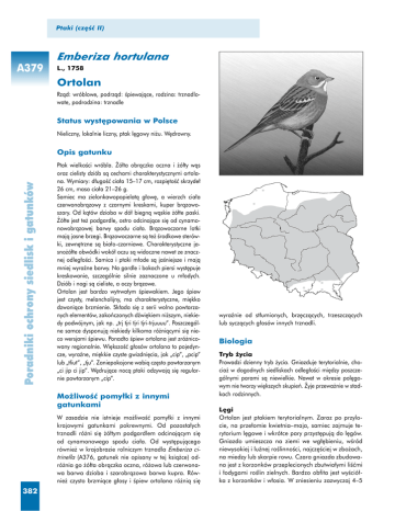 Ptaki (cz´Êç II) Emberiza hortulana A379 L., 1758 Ortolan Rzàd: wróblowe, podrzàd: Êpiewajàce, rodzina: trznadlowate, podrodzina: trznadle Status wyst´powania w Polsce Nieliczny, lokalnie liczny, ptak l´gowy ni˝u. W´drowny. Poradniki ochrony siedlisk i gatunków Opis gatunku Ptak wielkoÊci wróbla. ˚ó∏ta obràczka oczna i ˝ó∏ty wàs oraz cielisty dziób sà cechami charakterystycznymi ortolana. Wymiary: d∏ugoÊç cia∏a 15–17 cm, rozpi´toÊç skrzyde∏ 26 cm, masa cia∏a 21–26 g. Samiec ma zielonkawopopielatà g∏ow´, a wierzch cia∏a czerwonobràzowy z czarnymi kreskami, kuper bràzowoszary. Od kàtów dzioba w dó∏ biegnà wàskie ˝ó∏te paski. ˚ó∏te jest te˝ podgardle, ostro odcinajàce si´ od cynamonowobràzowej barwy spodu cia∏a. Bràzowoczarne lotki majà jasne brzegi. Bràzowoczarne sà te˝ Êrodkowe sterówki, zewn´trzne sà bia∏o-czarniawe. Charakterystyczne jasno˝ó∏te obwódki wokó∏ oczu sà widoczne nawet ze znacznej odleg∏oÊci. Samica i ptaki m∏ode sà jaÊniejsze i majà mniej wyraêne barwy. Na gardle i bokach piersi wyst´puje kreskowanie, szczególnie silnie zaznaczone u m∏odych. Dziób i nogi sà cieliste, a oczy bràzowe. Ortolan jest bardzo wytrwa∏ym Êpiewakiem. Jego Êpiew jest czysty, melancholijny, ma charakterystyczne, mi´kko dzwoniàce brzmienie. Sk∏ada si´ z serii wolno powtarzanych elementów, zakoƒczonych dêwi´kiem ni˝szym, niekiedy podwójnym, jak np. „trj tjri tjri tjri-trjuuuu”. Poszczególne samce dysponujà niekiedy kilkoma ró˝niàcymi si´ nieco wersjami Êpiewu. Ponadto Êpiew ortolana jest zró˝nicowany regionalnie. Wi´kszoÊç g∏osów ortolana to pojedyncze, wyraêne, mi´kkie czyste gwizdni´cia, jak „cip”, „pcip” lub „t∏iut”, „tju”. Zaniepokojone wabià cz´sto powtarzanym „ci jip ci jip”. W´drujàce nocà ptaki odzywajà si´ regularnie powtarzanym „cip”. Mo˝liwoÊç pomy∏ki z innymi gatunkami W zasadzie nie istnieje mo˝liwoÊç pomy∏ki z innymi krajowymi gatunkami pokrewnymi. Od pozosta∏ych trznadli ró˝ni si´ ˝ó∏tym podgardlem odcinajàcym si´ od cynamonowego spodu cia∏a. Od wyst´pujàcego równie˝ w krajobrazie rolniczym trznadla Emberiza citrinella (A376, gatunek nie opisany w tej ksià˝ce) odró˝nia go ˝ó∏ta obràczka oczna, ró˝owa lub czerwonawa barwa dzioba i szarobràzowa barwa kupra. Równie˝ czysto brzmiàce g∏osy i Êpiew ortolana ró˝nià si´ 382 ortolan wyraênie od st∏umionych, brz´czàcych, trzeszczàcych lub syczàcych g∏osów innych trznadli. Biologia Tryb ˝ycia Prowadzi dzienny tryb ˝ycia. Gniazduje terytorialnie, chocia˝ w dogodnych siedliskach odleg∏oÊci mi´dzy poszczególnymi parami sà niewielkie. Nawet w okresie pol´gowym nie tworzy wi´kszych skupieƒ. ˚yje przewa˝nie w stadkach rodzinnych. L´gi Ortolan jest ptakiem terytorialnym. Zaraz po przylocie, na prze∏omie kwietnia–maja, samiec zajmuje terytorium l´gowe i wkrótce pary przyst´pujà do l´gów. Gniazdo umieszcza na ziemi we wg∏´bieniu, wÊród niewysokiej i luênej roÊlinnoÊci, najcz´Êciej w zbo˝ach, na miedzy lub skarpie rowu. Czara gniazda zbudowana jest z korzonków przeplecionych zbutwia∏ymi liÊçmi i ∏odygami roÊlin zielnych. Bardzo obfita jest wyÊció∏ka z korzonków i w∏osia. W zniesieniu zazwyczaj 4–5 Emberiza hortulana (Ortolan) (6) jaj. Z regu∏y wyprowadza 2 l´gi w roku, pierwszy od po∏owy maja, drugi – od drugiej po∏owy czerwca. Wysiaduje tylko samica przez 11–14 dni. M∏ode przebywajà w gnieêdzie 10–15 dni i sà karmione przez oboje rodziców. Doros∏e ptaki przy gnieêdzie zachowujà si´ bardzo ostro˝nie. W krajobrazie rolniczym Wielkopolski stwierdzony w zag´szczeniu 0,6–2,4 p./km2, podobnie na Âlàsku – 0,7–3,3 p./km2, na Mazowszu i Podlasiu – 0,5–3,0 p./km2. Zimowiska Zimowiska ortolana le˝à w Afryce, na po∏udnie od Sahary oraz na Pó∏wyspie Arabskim. Ptaki z po∏udniowej cz´Êci zasi´gu sà cz´Êciowo osiad∏e. Pokarm Od˝ywia si´ przede wszystkim pokarmem zwierz´cym, owadami i innymi drobnymi bezkr´gowcami. M∏odsze piskl´ta karmi g∏ównie gàsienicami, a starsze larwami chrzàszczy. Poza okresem l´gowym znacznà cz´Êç diety stanowià nasiona traw i innych roÊlin oraz wyjàtkowo zbó˝. Pokarm zbiera na ziemi, w miejscach pozbawionych g´stej roÊlinnoÊci. Wyst´powanie Siedlisko W Polsce ortolan zamieszkuje otwarty krajobraz rolniczy, g∏ównie z ∏anami zbó˝, gdzie zasiedla aleje przydro˝ne, zadrzewienia nad drobnymi ciekami i oczkami Êródpolnymi, sady, Êródpolne zadrzewienia i niewielkie laski. Licznie zasiedla te˝ brzegi lasów sosnowych i mieszanych, graniczàce z uprawami rolnymi i przesuszonymi ∏àkami. Unika du˝ych, zwartych kompleksów leÊnych, jednak sporadycznie gniazduje na wi´kszych polanach ÊródleÊnych i zr´bach oraz w pobli˝u leÊnych szkó∏ek. Gatunek ten wyraênie preferuje siedliska suche i silnie nas∏onecznione, wyst´puje g∏ównie na glebach suchych i lekkich (piaskowych i ˝wirowych), ale tak˝e na gliniastych i ilastych. Unika natomiast gleb mu∏owo-torfowych. Siedliska z za∏àcznika I Dyrektywy Siedliskowej, które mogà byç istotne dla gatunku Brak takich siedlisk. Rozmieszczenie w Polsce W Polsce wyst´puje we wszystkich regionach kraju, z wyjàtkiem gór, gdzie przenika tylko do strefy pogórza, dochodzàc wyjàtkowo do wysokoÊci 500–650 m n.p.m. w Sudetach i Karpatach Zachodnich. Nie wyst´puje w Bieszczadach. W lesistym pasie pojezierzy oraz w wy˝ynnej cz´Êci po∏udniowej cz´Êci Polski jego rozmieszczenie ma charakter plamowy. Bardziej regularnie i licznie zasiedla Êrodkowy pas Ni˝u Polskiego, choç i tu znane sà obszary, na których ortolan wyst´puje nielicznie lub bardzo nielicznie na pojedynczych stanowiskach, np. na Zamojszczyênie i Ziemi Przemyskiej. Z uwagi na wymagania siedliskowe i klimatyczne bardzo nielicznie wyst´puje na Pobrze˝u 