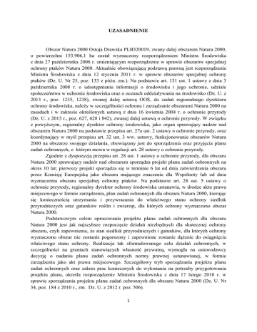 UZASADNIENIE Obszar Natura 2000 Ostoja Drawska PLB320019, zwany dalej obszarem Natura 2000, o powierzchni 153.906,1 ha został wyznaczony rozporządzeniem Ministra Środowiska z dnia 27 października 2008 r. zmieniającym rozporządzenie w sprawie obszarów specjalnej ochrony ptaków Natura 2000. Aktualnie obowiązującą podstawą prawną jest rozporządzenie Ministra Środowiska z dnia 12 stycznia 2011 r. w sprawie obszarów specjalnej ochrony ptaków (Dz. U. Nr 25, poz. 133 z późn. zm.). Na podstawie art. 131 ust. 1 ustawy z dnia 3 października 2008 r. o udostępnianiu informacji o środowisku i jego ochronie, udziale społeczeństwa w ochronie środowiska oraz o ocenach oddziaływania na środowisko (Dz. U. z 2013 r., poz. 1235, 1238), zwanej dalej ustawą OOŚ, do zadań regionalnego dyrektora ochrony środowiska, należy w szczególności ochrona i zarządzanie obszarami Natura 2000 na zasadach i w zakresie określonych ustawą z dnia 16 kwietnia 2004 r. o ochronie przyrody (Dz. U. z 2013 r., poz. 627, 628 i 842), zwanej dalej ustawą o ochronie przyrody. W związku z powyższym, regionalny dyrektor ochrony środowiska, jako organ sprawujący nadzór nad obszarem Natura 2000 na podstawie przepisu art. 27a ust. 2 ustawy o ochronie przyrody, oraz koordynujący w myśl przepisu art. 32 ust. 3 ww. ustawy, funkcjonowanie obszarów Natura 2000 na obszarze swojego działania, obowiązany jest do sporządzenia oraz przyjęcia planu zadań ochronnych, o którym mowa w regulacji art. 28 ustawy o ochronie przyrody. Zgodnie z dyspozycją przepisu art. 28 ust. 1 ustawy o ochronie przyrody, dla obszaru Natura 2000 sprawujący nadzór nad obszarem sporządza projekt planu zadań ochronnych na okres 10 lat; pierwszy projekt sporządza się w terminie 6 lat od dnia zatwierdzenia obszaru przez Komisję Europejską jako obszaru mającego znaczenie dla Wspólnoty lub od dnia wyznaczenia obszaru specjalnej ochrony ptaków. Na podstawie art. 28 ust. 5 ustawy o ochronie przyrody, regionalny dyrektor ochrony środowiska ustanawia, w drodze aktu prawa miejscowego w formie zarządzenia, plan zadań ochronnych dla obszaru Natura 2000, kierując się koniecznością utrzymania i przywracania do właściwego stanu ochrony siedlisk przyrodniczych oraz gatunków roślin i zwierząt, dla których ochrony wyznaczono obszar Natura 2000. Podstawowym celem opracowania projektu planu zadań ochronnych dla obszaru Natura 2000 jest jak najszybsze rozpoczęcie działań niezbędnych dla skutecznej ochrony obszaru, czyli zapewnienie, że stan siedlisk przyrodniczych i gatunków, dla których ochrony wyznaczono obszar nie zostanie pogorszony i zapewnione zostanie dążenie do osiągnięcia właściwego stanu ochrony. Realizacja tak sformułowanego celu działań ochronnych, w szczególności na gruntach stanowiących własność prywatną, wymogła na ustawodawcy decyzję o nadaniu planu zadań ochronnych normy prawnej ustanawianej, w formie zarządzenia jako akt prawa miejscowego. Szczegółowy tryb sporządzania projektu planu zadań ochronnych oraz zakres prac koniecznych do wykonania na potrzeby przygotowania projektu planu, określa rozporządzenie Ministra Środowiska z dnia 17 lutego 2010 r. w sprawie sporządzania projektu planu zadań ochronnych dla obszaru Natura 2000 (Dz. U. Nr 34, poz. 184 z 2010 r., zm. Dz. U. z 2012 r. poz. 506). 1 Zgodnie z art. 28 ust. 10 ustawy o ochronie przyrody, projekt planu zadań ochronnych dla obszaru Natura 2000 zawiera: 1) opis granic obszaru i mapę obszaru Natura 2000; 2) identyfikację istniejących i potencjalnych zagrożeń dla zachowania właściwego stanu ochrony siedlisk przyrodniczych oraz gatunków roślin i zwierząt i ich siedlisk będących przedmiotami ochrony; 3) cele działań ochronnych; 4) określenie działań ochronnych ze wskazaniem podmiotów odpowiedzialnych za ich wykonanie i obszarów ich wdrażania, w tym w szczególności działań dotyczących: a) ochrony czynnej siedlisk przyrodniczych, gatunków roślin i zwierząt oraz ich siedlisk, b) monitoringu stanu przedmiotów ochrony oraz monitoringu realizacji celów, o których mowa w pkt 3, c) uzupełnienia stanu wiedzy o przedmiotach ochrony i uwarunkowaniach ich ochrony; 5) wskazania do zmian w istniejących studiach uwarunkowań i kierunków zagospodarowania przestrzennego, miejscowych planach zagospodarowania przestrzennego, planach zagospodarowania przestrzennego województw oraz planach zagospodarowania przestrzennego morskich wód wewnętrznych, morza terytorialnego i wyłącznej strefy ekonomicznej dotyczące eliminacji lub ograniczenia zagrożeń wewnętrznych lub zewnętrznych, jeżeli są niezbędne dla utrzymania lub odtworzenia właściwego stanu ochrony siedlisk przyrodniczych oraz gatunków roślin i zwierząt i ich siedlisk, dla których ochrony wyznaczono obszar Natura 2000; 6) wskazanie terminu sporządzenia, w razie potrzeby, planu ochrony dla części lub całości obszaru. Przy opracowaniu projektu planu zadań ochronnych dla obszaru Natura 2000, kierowano się także oprócz wyżej przytoczonych aktów prawa, wytycznymi Generalnej Dyrekcji Ochrony Środowiska z dnia 12 grudnia 2012 r. w sprawie opracowania planu zadań ochronnych dla obszaru Natura 2000 oraz Instrukcją wypełniania Standardowego Formularza Danych obszaru Natura 2000 wersja 2012.1. Sporządzający projekt planu zadań ochronnych, zgodnie z przepisem art. 28 ust. 3 ustawy o ochronie przyrody, ma obowiązek zapewnienia możliwości zainteresowanym osobom i podmiotom prowadzącym działalność w obrębie siedlisk przyrodniczych i siedlisk gatunków, dla których ochrony wyznaczono obszar Natura 2000, udział w pracach związanych ze sporządzaniem tego projektu, a także w związku z regulacją art. 28 ust. 4 ustawy, zapewnia możliwość udziału społeczeństwa, na zasadach i trybie określonym w ustawie OOŚ, w postępowaniu, którego przedmiotem jest sporządzenie projektu dokumentu. W myśl przepisu art. 59 ust 2