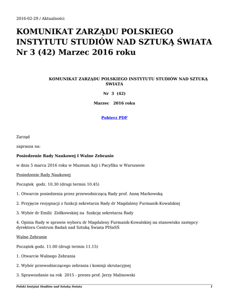 2016-02-29 / Aktualności KOMUNIKAT ZARZĄDU POLSKIEGO INSTYTUTU STUDIÓW NAD SZTUKĄ ŚWIATA Nr 3 (42) Marzec 2016 roku KOMUNIKAT ZARZĄDU POLSKIEGO INSTYTUTU STUDIÓW NAD SZTUKĄ ŚWIATA Nr 3 (42) Marzec 2016 roku Pobierz PDF Zarząd zaprasza na: Posiedzenie Rady Naukowej I Walne Zebranie w dniu 5 marca 2016 roku w Muzeum Azji i Pacyfiku w Warszawie Posiedzenie Rady Naukowej Początek godz. 10.30 (drugi termin 10.45) 1. Otwarcie posiedzenia przez przewodniczącą Rady prof. Annę Markowską 2. Przyjęcie rezygnacji z funkcji sekretarza Rady dr Magdaleny Furmanik-Kowalskiej 3. Wybór dr Emilii Ziółkowskiej na funkcję sekretarza Rady 4. Opinia Rady w sprawie wyboru dr Magdaleny Furmanik-Kowalskiej na stanowisko zastępcy dyrektora Centrum Badań nad Sztuką Świata PISnSŚ Walne Zebranie Początek godz. 11.00 (drugi termin 11.15) 1. Otwarcie Walnego Zebrania 2. Wybór przewodniczącego zebrania i komisji skrutacyjnej 3. Sprawozdanie na rok 2015 - prezes prof. Jerzy Malinowski Polski Instytut Studiów nad Sztuką Świata 1 4. Informacja o stanie finansów - skarbnik Magdalena Ginter-Frołow i sekretarz RN dr Magdalena Furmanik-Kowalska 5. Dyskusja i przyjęcie sprawozdania 6. Rezygnacja dr Joanny Wasilewskiej z funkcji wiceprezesa 7. Wybór dr Magdaleny Furmanik-Kowalskiej na stanowisko zastępcy dyrektora Centrum Badań nad Sztuką Świata PISnSŚ (po zasięgnięciu opinii Rady Naukowej) 8. Zatwierdzenie nowych członków Rady Naukowej 9. Sprawy członkowskie i składki – skarbnik OW dr Magdalena Tarnowska i członek Zarządu prof. Jan Wiktor Sienkiewicz 10. Program działalności na 2016 rok – prezes prof. Jerzy Malinowski 11. Dyskusja nad programem działalności i jego akceptacja 12. Wolne wnioski Zarząd Zaprasza na Ogólnopolskie Seminarium Sztuki Rosji i Europy Wschodniej w dniu 19 marca (sobota) 2016 roku o godz. 11 z wykładem prof. dr hab. Diany Oboleńskiej (Uniwersytet Gdański) Ezoteryzm w kulturze rosyjskiej na przełomie XIX i XX wieku Zarząd zaprasza na konferencję Sztuka polska na Ziemiach Zachodnich i Północnych od 1981 roku do współczesności Instytut Historii Sztuki Uniwersytetu Wrocławskiego i Polski Instytut Studiów nad Sztuką Świata w Warszawie zapraszają do Wrocławia do udziału w konferencji Sztuka polska na ziemiach zachodnich i północnych od 1981 roku do współczesności. Konferencja – stanowiąca drugą edycję spotkania poświęconą badaniom dotyczącym sztuki na tzw. Ziemiach Odzyskanych – odbędzie się w dniach 21-22 listopada 2016 roku. Podobnie jak na zeszłorocznej sesji, poświęconej okresowi 1945-1981, pragniemy zastanowić się nad specyfiką architektury, sztuki oraz kultury materialnej na Warmii i Mazurach, Dolnym Śląsku, Śląsku Opolskim, Pomorzu Zachodnim oraz w Gdańsku, który nie wchodząc w skład Ziem Odzyskanych, poddany został podobnym strategiom scalającym poprzez m.in. odbudowę, nacjonalizację i modernizację. Czy po 1981, a szczególnie po zniesieniu cenzury w 1991 roku, zmianie polityki historycznej, rozpadzie ZSRR (1991) i wycofaniu się wojsk radzieckich z Polski (1993) oraz wejściu w życie traktatu o dobrym sąsiedztwie (1992), mówić można jeszcze o swoistej odrębności tych ziem? W jakim stopniu upadek komunizmu w Polsce (1989) odcisnął swoje piętno na sztuce i architekturze? Jakie znaczenie miało wstąpienie do Unii Europejskiej (2004) i związana z nią kolejna – po okresie gierkowskim – fala modernizacyjna? Chcemy zastanowić się, czy ciągle istnieje swoista specyfika ziem zachodnich i północnych, a jeśli tak, to czy wynika dzisiaj raczej jedynie z zaszłości, tj. z okresu PRL-u czy może w pojawieniu się w Polski Instytut Studiów nad Sztuką Świata 2 sztuce nowych tematów, odmiennych koncepcji widzenia przeszłości, a także zdystansowanej już – szczególnie w młodym pokoleniu – refleksji nad wszystkim, co zdarzyło się w cieniu Jałty? Chcemy podyskutować o niechcianym oraz docenionym i niedocenionym dziedzictwie PRL-u, nowych wyzwaniach okresu transformacji, boomie budowlanym oraz architektonicznych sporach, sztuce krytycznej i „ładnej”, a także regionalnych ambicjach artystycznych. Chcemy również odnaleźć ich miejsce na tle dokonań współczesnej sztuki i architektury w Europie. KOMITET NAUKOWY prof. dr hab. Jerzy Malinowski (Prezes PISnSŚ; UMK), prof. dr hab. Piotr Marciniak (PP; PISnSŚ), prof. dr hab. Anna Markowska (UWr; PISnSŚ – przewodnicząca Komitetu), mgr Zofia Reznik (sekretarz naukowy). Obrady toczyć się będą w salach Muzeum Narodowego we Wrocławiu. Materiały pokonferencyjne zostaną opublikowane, tak jak po pierwszej edycji sesji, w „Pamiętniku Sztuk Pięknych”. Wysokość wpisowego to 150 zł, dla doktorantów 75 zł. Zgłoszenia prosimy przesyłać na adres [email protected] lub za pośrednictwem strony internetowej PISnSŚ www.world-art.pl do 30 sierpnia 2016 roku. Strona internetowa: http://www.world-art.pl Facebook Oddział Warszawski http://www.facebook.com/pages/Polski-Instytut-Studi%C3%B3w-nad-Sztuk%C4%85-%C5%9Awiata/5 04390379582972 Anna Sembiring - administrator profilu ([email protected].). Oddział Krakowski https://www.facebook.com/PolskiInstytutStudiowNadSztukaSwiataKrakow?ref=hl Aleksandra Görlich - administrator profilu ([email protected]) Składki Zarząd gorąco prosi i przypomina członkom o płaceniu składek za okres od rejestracji Instytutu, to znaczy od lipca 2011 roku (normalna składka – 10 zł; ulgowa dla doktorantów – 5 zł, dla emerytów i rencistów – również ulgowa 5 zł, wprowadzona uchwałą zarządu od października 2012 roku). Składki stanową podstawowy fundusz, z którego możemy pokrywać koszty utrzymania lokalu Instytutu; czynsz za wynajem oraz rachunki za energię elektryczną i wodę to łącznie około 1000 zł miesięcznie. Polski Instytut Studiów nad Sztuką Świata 3 Numer konta Instytutu w Credit Agricole Bank Polska: 24 1940 1076 3101 7420 0000 0000 SPRAWOZDANIE P