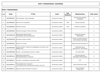 MAPY/ PRZEWODNIKI/ MAZOWSZE MAPY/ PRZEWODNIKI TYTUŁ Autor Rok Wydania L.p. Dział Wydawnictwo Ilość sztuk 1 GCI/MAPA/01 Unia Europejska i kraje kandydujące opracowanie wydziału Urząd Komitetu Integracji Europejskiej 3 2 GCI/MAPA/02 Panorama Unii Europejskiej opracowanie wydziału 2003 Komisja Europejska 1 3 GCI/MAPA/03 Podróże po Europie opracowanie wydziału 2004 Wspólnoty Europejskie 1 4 GCI/MAPA/04 Parlament Europejski. Krótka prezentacja opracowanie wydziału 5 GCI/MAPA/05 Mapa punktów informacyjnych Europejskiego Fudnuszu Społecznego opracowanie wydziału Ministerstwo Rozwoju Regionalnego 1 6 GCI/MAPA/06 Information Society in Poland opracowanie wydziału Ministry of Scientific Research and Information Technology 1 7 GCI/MAPA/07 Mazovia for investors opracowanie wydziału Agencja Rozwoju Mazowsza S.A. 1 8 GCI/MAPA/08 Kompas podróżny. Poradnik dla wyjeżdżających za granicę w celu podjęcia pracy opracowanie wydziału Ministerstwo Spraw Wewnętrznych i Administracji 1 9 GCI/MAPA/09 Na biało… czyli jak legalnie pracować w Europie opracowanie wydziału Euro Desk Polska 2 10 GCI/MAPA/10 Województwo Mazowieckie Mapa administracyjno- turystyczna opracowanie wydziału Urząd Marszałkowski Województwa Mazowieckiego 1 11 GCI/MAPA/11 Turystyka w województwie mazowieckim 2008 opracowanie wydziału PTTK 1 12 GCI/MAPA/12 Puszcza Bolimowska- przewodnik z serii Rodzinne trasy rowerowe przez puszcze, bory, lasy opracowanie wydziału Agencja Reklamowa Muflon 1 13 GCI/MAPA/13 Mazowsze Chopina Przewodnik turystyczny opracowanie wydziału Grupa Partnerska "Chopin 2010" 1 1 14 GCI/MAPA/14 25.770 Kilometrów nad afryką Stanisław Skarżyński 2001 Wydawnictwo Literatura 1 Ewa Bąk Urszula Biskup Hanna Friedel 2001 BRUK Anna Miałka- Kruszewska 1 red. Aleksandra Jewtuchowicz 2005 Mazowieckie Biuro Planowania Przestrzennego Rozwoju Regionalnego w Warszawie 1 MAZOWSZE 1 GCI/MAZ/01 Mazowsze Moja Mała Ojczyzna. Edukacja Regionalna- Dziedzictwo Kulturowe w regionie 2 GCI/MAZ/02 Mazowsze dziś i jutro. Materiały z I Forum Mazowieckiego 3 GCI/MAZ/03 Portret Województwa Mazowieckiego 2001-2004 opracowanie wydziału 2005 Urząd Statystyczny w Warszawie 1 4 GCI/MAZ/04 Najważniejsze osiągnięcia Mazowieckiego Samorządu w latach 2002-2006 opracowanie wydziału 2006 Urząd Marszałkowski Województwa Mazowieckiego w Warszawie 1 5 GCI/MAZ/05 Związek Międzygminny Mazowsze Zachodnie opracowanie wydziału 2007 Związek Międzygminny Mazowsze Zachodnie 1 6 GCI/MAZ/06 10 lat Samorządu Województwa Mazowieckiego 1999-2009 z czego jesteśmy dumni opracowanie wydziału 2009 Urząd Marszałkowski Województwa Mazowieckiego w Warszawie 1 7 GCI/MAZ/07 Poezja Słów Anna Barbara Biczyk 2006 Arkuszowa Drukarnia Offsetowa 1 8 GCI/MAZ/08 Podręcznik metodologiczny systemu monitoringu innowacyjności Województwa Mazowieckiego wraz ze Słownikiem pojęć Wojciech Dziemianowicz Geoprofit i Ecorys Polska Sp. z o.o. 2013 Urząd Marszałkowski Województwa Mazowieckiego w Warszawie 1 9 GCI/MAZ/09 Analiza raportu otwarcia INNOWACYJNE MAZOWSZE - stan innowacji po uchwaleniu RIS Mazovia 2007-2015 Europejskie Centrum Doradztwa Finansowego Badania i Szkolenia Ewa Joachimczak 2013 Urząd Marszałkowski Województwa Mazowieckiego w Warszawie 1 10 GCI/MAZ/10 Analiza sektora firm wysokich i średnio-wysokich technik działających w regionie Mazowsza PSDB Sp. z o.o. i EPRD - Biuro Polityki Gospodarczej i Rozwoju Regionalnego Sp. z o.o. 2013 Urząd Marszałkowski Województwa Mazowieckiego w Warszawie 1 11 GCI/MAZ/11 Analiza działalności B+R w regionie Mazowsza recenzent dr Adam Płoszaj - EUROREG 2013 Urząd Marszałkowski Województwa Mazowieckiego w Warszawie 1 12 GCI/MAZ/12 Analiza sektorów wiedzy w regionie Mazowsza w kontekście smart specialization PSDB Sp. z o.o. i EPRD - Biuro Polityki Gospodarczej i Rozwoju Regionalnego Sp. z o.o. 2013 Urząd Marszałkowski Województwa Mazowieckiego w Warszawie 1 13 GCI/MAZ/13 Analiza sektorów innowacyjnych w regionie Mazowsza PSDB Sp. z o.o. i EPRD - Biuro Polityki Gospodarczej i Rozwoju Regionalnego Sp. z o.o. 2013 Urząd Marszałkowski Województwa Mazowieckiego w Warszawie 1 14 GCI/MAZ/14 Analiza wpływu inicjatyw klastrowych z województwa mazowieckiego na kształtowanie inteligentnej specjalizacji regioniu PSDB Sp. z o.o. i EPRD - Biuro Polityki Gospodarczej i Rozwoju Regionalnego Sp. z o.o. 2013 Urząd Marszałkowski Województwa Mazowieckiego w Warszawie 1 15 GCI/MAZ/15 Analiza potencjału innowacyjnego obszarów wiejskich regionu Mazowsze PSDB Sp. z o.o. i EPRD - Biuro Polityki Gospodarczej i Rozwoju Regionalnego Sp. z o.o. 2013 Urząd Marszałkowski Województwa Mazowieckiego w Warszawie 1 16 GCI/MAZ/16 Analiza potencjału innowacyjnego sektora MŚP w województwie mazowieckim PSDB Sp. z o.o. i EPRD - Biuro Polityki Gospodarczej i Rozwoju Regionalnego Sp. z o.o. 2013 Urząd Marszałkowski Województwa Mazowieckiego w Warszawie 1 17 GCI/MAZ/17 Analiza współpracy sektora MŚP z ośrodkami naukowo-badawczymi w regionie Mazowsza PSDB Sp. z o.o. i EPRD - Biuro Polityki Gospodarczej i Rozwoju Regionalnego Sp. z o.o. 2013 Urząd Marszałkowski Województwa Mazowieckiego w Warszawie 1 18 GCI/MAZ/18 Analiza rynku nowych technologii w regionie Mazowsze PSDB Sp. z o.o. i EPRD - Biuro Polityki Gospodarczej i Rozwoju Regionalnego Sp. z o.o. 2013 Urząd Marszałkowski Województwa Mazowieckiego w Warszawie 1
