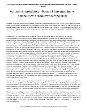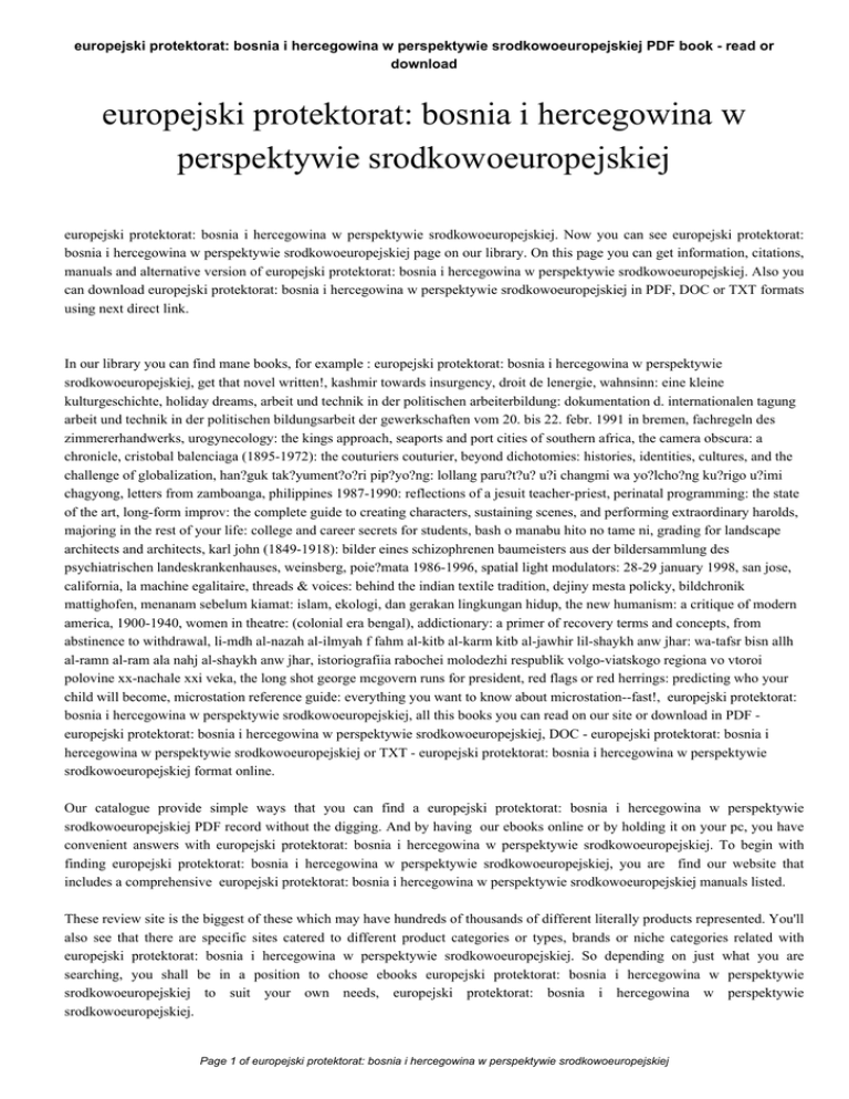 europejski protektorat: bosnia i hercegowina w perspektywie srodkowoeuropejskiej PDF book - read or download europejski protektorat: bosnia i hercegowina w perspektywie srodkowoeuropejskiej europejski protektorat: bosnia i hercegowina w perspektywie srodkowoeuropejskiej. Now you can see europejski protektorat: bosnia i hercegowina w perspektywie srodkowoeuropejskiej page on our library. On this page you can get information, citations, manuals and alternative version of europejski protektorat: bosnia i hercegowina w perspektywie srodkowoeuropejskiej. Also you can download europejski protektorat: bosnia i hercegowina w perspektywie srodkowoeuropejskiej in PDF, DOC or TXT formats using next direct link. In our library you can find mane books, for example : europejski protektorat: bosnia i hercegowina w perspektywie srodkowoeuropejskiej, get that novel written!, kashmir towards insurgency, droit de lenergie, wahnsinn: eine kleine kulturgeschichte, holiday dreams, arbeit und technik in der politischen arbeiterbildung: dokumentation d. internationalen tagung arbeit und technik in der politischen bildungsarbeit der gewerkschaften vom 20. bis 22. febr. 1991 in bremen, fachregeln des zimmererhandwerks, urogynecology: the kings approach, seaports and port cities of southern africa, the camera obscura: a chronicle, cristobal balenciaga (1895-1972): the couturiers couturier, beyond dichotomies: histories, identities, cultures, and the challenge of globalization, han?guk tak?yument?o?ri pip?yo?ng: lollang paru?t?u? u?i changmi wa yo?lcho?ng ku?rigo u?imi chagyong, letters from zamboanga, philippines 1987-1990: reflections of a jesuit teacher-priest, perinatal programming: the state of the art, long-form improv: the complete guide to creating characters, sustaining scenes, and performing extraordinary harolds, majoring in the rest of your life: college and career secrets for students, bash o manabu hito no tame ni, grading for landscape architects and architects, karl john (1849-1918): bilder eines schizophrenen baumeisters aus der bildersammlung des psychiatrischen landeskrankenhauses, weinsberg, poie?mata 1986-1996, spatial light modulators: 28-29 january 1998, san jose, california, la machine egalitaire, threads & voices: behind the indian textile tradition, dejiny mesta policky, bildchronik mattighofen, menanam sebelum kiamat: islam, ekologi, dan gerakan lingkungan hidup, the new humanism: a critique of modern america, 1900-1940, women in theatre: (colonial era bengal), addictionary: a primer of recovery terms and concepts, from abstinence to withdrawal, li-mdh al-nazah al-ilmyah f fahm al-kitb al-karm kitb al-jawhir lil-shaykh anw jhar: wa-tafsr bisn allh al-ramn al-ram ala nahj al-shaykh anw jhar, istoriografiia rabochei molodezhi respublik volgo-viatskogo regiona vo vtoroi polovine xx-nachale xxi veka, the long shot george mcgovern runs for president, red flags or red herrings: predicting who your child will become, microstation reference guide: everything you want to know about microstation--fast!, europejski protektorat: bosnia i hercegowina w perspektywie srodkowoeuropejskiej, all this books you can read on our site or download in PDF europejski protektorat: bosnia i hercegowina w perspektywie srodkowoeuropejskiej, DOC - europejski protektorat: bosnia i hercegowina w perspektywie srodkowoeuropejskiej or TXT - europejski protektorat: bosnia i hercegowina w perspektywie srodkowoeuropejskiej format online. Our catalogue provide simple ways that you can find a europejski protektorat: bosnia i hercegowina w perspektywie srodkowoeuropejskiej PDF record without the digging. And by having our ebooks online or by holding it on your pc, you have convenient answers with europejski protektorat: bosnia i hercegowina w perspektywie srodkowoeuropejskiej. To begin with finding europejski protektorat: bosnia i hercegowina w perspektywie srodkowoeuropejskiej, you are find our website that includes a comprehensive europejski protektorat: bosnia i hercegowina w perspektywie srodkowoeuropejskiej manuals listed. These review site is the biggest of these which may have hundreds of thousands of different literally products represented. You'll also see that there are specific sites catered to different product categories or types, brands or niche categories related with europejski protektorat: bosnia i hercegowina w perspektywie srodkowoeuropejskiej. So depending on just what you are searching, you shall be in a position to choose ebooks europejski protektorat: bosnia i hercegowina w perspektywie srodkowoeuropejskiej to suit your own needs, europejski protektorat: bosnia i hercegowina w perspektywie srodkowoeuropejskiej. Page 1 of europejski protektorat: bosnia i hercegowina w perspektywie srodkowoeuropejskiej
