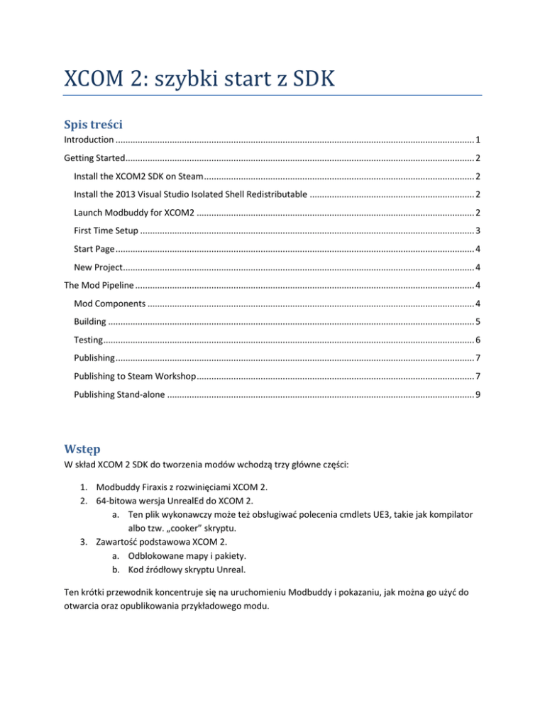 XCOM 2: szybki start z SDK Spis treści Introduction .................................................................................................................................................. 1 Getting Started.............................................................................................................................................. 2 Install the XCOM2 SDK on Steam .............................................................................................................. 2 Install the 2013 Visual Studio Isolated Shell Redistributable ................................................................... 2 Launch Modbuddy for XCOM2 ................................................................................................................. 2 First Time Setup ........................................................................................................................................ 3 Start Page .................................................................................................................................................. 4 New Project............................................................................................................................................... 4 The Mod Pipeline .......................................................................................................................................... 4 Mod Components ..................................................................................................................................... 4 Building ..................................................................................................................................................... 5 Testing ....................................................................................................................................................... 6 Publishing .................................................................................................................................................. 7 Publishing to Steam Workshop ................................................................................................................. 7 Publishing Stand-alone ............................................................................................................................. 9 Wstęp W skład XCOM 2 SDK do tworzenia modów wchodzą trzy główne części: 1. Modbuddy Firaxis z rozwinięciami XCOM 2. 2. 64-bitowa wersja UnrealEd do XCOM 2. a. Ten plik wykonawczy może też obsługiwać polecenia cmdlets UE3, takie jak kompilator albo tzw. „cooker” skryptu. 3. Zawartość podstawowa XCOM 2. a. Odblokowane mapy i pakiety. b. Kod źródłowy skryptu Unreal. Ten krótki przewodnik koncentruje się na uruchomieniu Modbuddy i pokazaniu, jak można go użyć do otwarcia oraz opublikowania przykładowego modu. Pierwsze kroki Pierwszy krok do stworzenia modu XCOM 2 to uruchomienie Modbuddy. Instalacja XCOM 2 SDK na Steam XCOM 2 SDK jest dostępne w Steam w zakładce Biblioteka->Narzędzia. Przejdź do Narzędzi: Znajdź XCOM 2 SDK pod nazwą „XCOM 2 SDK” i wybierz „zainstaluj” z menu otwieranego prawym przyciskiem myszy. Instalacja 2013 Visual Studio Isolated Shell Redistributable Modbuddy do XCOM 2, przypominający poprzednie wersje Modbuddy do Civilization, wykorzystuje Visual Studio Isolated Shell, by dostarczyć IDE do modowania. Zainstalowany program znajduje się w folderze instalacyjnym gry, w „Binaries\Redist”. Przykładowo: „\SteamLibrary\steamapps\common\XCOM 2 SDK\Binaries\Redist”. Uruchamianie Modbuddy do XCOM 2 Wybierz „graj” w XCOM 2 SDK na Steam, żeby uruchomić Modbuddy do XCOM 2. Pierwsze wczytanie IDE może potrwać dłuższą chwilę. Konfiguracja przy pierwszym uruchomieniu Po pierwszym uruchomieniu Modbuddy użytkownicy powinni dostosować ustawienia ogólne IDE związane z miejscem instalacji XCOM 2. Wybierz Tools->Options, a następnie przejdź na dół menu opcji, jak pokazano poniżej. Upewnij się, że podane ścieżki są prawidłowe. Ścieżka instalacji XCOM 2 – Ta ścieżka powinna prowadzić do plików GRY, z końcówką XComGame. Ścieżka użytkownika XCOM 2 – Ta ścieżka powinna prowadzić do plików SDK, z końcówką XComGame. Domyślnie informacje o budowaniu w Visual Studio Isolated Shell są ustawione na minimum. Aby otrzymywać więcej informacji z budowania i kompilacji skryptu, musisz zmienić to ustawienie. Wybierz Tools -> Options -> Projects and Solutions -> Build and Run. Zmień opcje verbosity na Normal, a następnie kliknij OK. Strona startowa Po pierwszym uruchomieniu IDE użytkownik trafi na stronę startową, na której znajdują się opcje tworzenia nowych projektów modów, otwierania istniejącego projektu modu i wyświetlenia listy niedawno otwieranych projektów modów. W tym poradniku szybkiego startu stworzymy nowy projekt modu, więc teraz wybierz „New Mod”. Nowy projekt Po wybraniu opcji „New Mod” wyświetli się okno widoczne po prawej stronie. Domyślnie są w nim widoczne zainstalowane szablony projektów XCOM 2, które można wykorzystać do stworzenia nowego projektu. W tym przewodniku wybierzemy szablon projektu ExampleWeapon. To projekt przykładowy, zawierający cały kod skryptu, pliki konfiguracyjne, pliki lokalizacyjne i pakiety zawartości potrzebne, by dodać do gry nową broń. Wybierz ExampleWeapon i kliknij OK. Modowanie Stworzyliśmy już projekt modu, możemy więc zapoznać się z elementami, które na niego się składają. Oprócz tego stworzymy, przetestujemy i opublikujemy nasz mod. Elementy modu Mody XCOM 2 składają się z wielu rodzajów danych, których połączenie wprowadza zmiany w podstawowej grze. Kod skryptu: Kod skryptu to najważniejszy rodzaj zawartości modu. W naszym przykładowym modzie broni kod skryptu określa szablon danych, czyli dane gry opisujące działanie broni. Jakie zadaje uszkodzenia? Z jakich może korzystać ulepszeń? Jakie