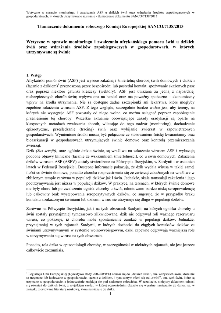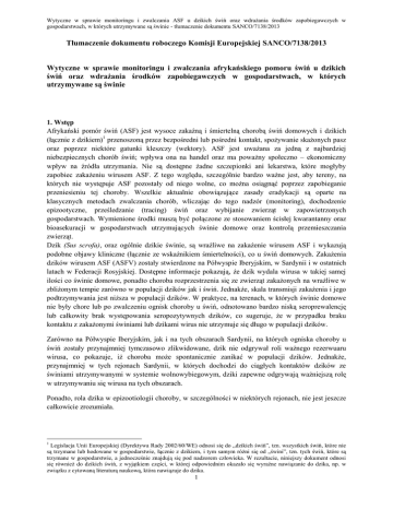 Wytyczne w sprawie monitoringu i zwalczania ASF u dzikich świń oraz wdrażania środków zapobiegawczych w gospodarstwach, w których utrzymywane są świnie - tłumaczenie dokumentu SANCO/7138/2013 Tłumaczenie dokumentu roboczego Komisji Europejskiej SANCO/7138/2013 Wytyczne w sprawie monitoringu i zwalczania afrykańskiego pomoru świń u dzikich świń oraz wdrażania środków zapobiegawczych w gospodarstwach, w których utrzymywane są świnie 1. Wstęp Afrykański pomór świń (ASF) jest wysoce zakaźną i śmiertelną chorobą świń domowych i dzikich (łącznie z dzikiem)1 przenoszoną przez bezpośredni lub pośredni kontakt, spożywanie skażonych pasz oraz poprzez niektóre gatunki kleszczy (wektory). ASF jest uważana za jedną z najbardziej niebezpiecznych chorób świń; wpływa ona na handel oraz ma poważny społeczno – ekonomiczny wpływ na źródła utrzymania. Nie są dostępne żadne szczepionki ani lekarstwa, które mogłyby zapobiec zakażeniu wirusem ASF. Z tego względu, szczególnie bardzo ważne jest, aby tereny, na których nie występuje ASF pozostały od niego wolne, co można osiągnąć poprzez zapobieganie przeniesieniu tej choroby. Wszelkie aktualnie obowiązujące zasady eradykacji są oparte na klasycznych metodach zwalczania chorób, wliczając do tego nadzór (monitoring), dochodzenie epizootyczne, prześledzanie (tracing) świń oraz wybijanie zwierząt w zapowietrzonych gospodarstwach. Wymienione środki muszą być połączone ze stosowaniem ścisłej kwarantanny oraz bioasekuracji w gospodarstwach utrzymujących świnie domowe oraz kontrolą przemieszczania zwierząt. Dzik (Sus scrofa), oraz ogólnie dzikie świnie, są wrażliwe na zakażenie wirusem ASF i wykazują podobne objawy kliniczne (łącznie ze wskaźnikiem śmiertelności), co u świń domowych. Zakażenia dzików wirusem ASF (ASFV) zostały stwierdzone na Półwyspie Iberyjskim, w Sardynii i w ostatnich latach w Federacji Rosyjskiej. Dostępne informacje pokazują, że dzik wydala wirusa w takiej samej ilości co świnie domowe, ponadto choroba rozprzestrzenia się ze zwierząt zakażonych na wrażliwe w zbliżonym tempie zarówno w populacji dzików jak i świń. Jednakże, skala transmisji zakażenia i jego podtrzymywania jest niższa w populacji dzików. W praktyce, na terenach, w których świnie domowe nie były chore lub po zwalczeniu ognisk choroby u świń, odnotowano bardzo niską seroprewalencję lub całkowity brak występowania seropozytywnych dzików, co sugeruje, że w przypadku braku kontaktu z zakażonymi świniami lub dzikami wirus nie utrzymuje się długo w populacji dzików. Zarówno na Półwyspie Iberyjskim, jak i na tych obszarach Sardynii, na których ogniska choroby u świń zostały przynajmniej tymczasowo zlikwidowane, dzik nie odgrywał roli ważnego rezerwuaru wirusa, co pokazuje, iż choroba może spontanicznie zanikać w populacji dzików. Jednakże, przynajmniej w tych rejonach Sardynii, w których dochodzi do ciągłych kontaktów dzików ze świniami utrzymywanymi w systemie wolnowybiegowym, dziki zapewne odgrywają ważniejszą rolę w utrzymywaniu się wirusa na tych obszarach. Ponadto, rola dzika w epizootiologii choroby, w szczególności w niektórych rejonach, nie jest jeszcze całkowicie zrozumiała. 1 Legislacja Unii Europejskiej (Dyrektywa Rady 2002/60/WE) odnosi się do „dzikich świń”, tzn. wszystkich świń, które nie są trzymane lub hodowane w gospodarstwie, łącznie z dzikiem, i tym samym różni się od „świni”, tzn. tych świń, które są trzymane w gospodarstwie, a jednocześnie znajdują się pod nadzorem człowieka. W rezultacie, niniejszy dokument odnosi się również do dzikich świń, z wyjątkiem części, w której odpowiednim okazało się wyraźne nawiązanie do dzika, np. w związku z cytowaną literaturą naukową, która nawiązuje do dzika. 1 Wytyczne w sprawie monitoringu i zwalczania ASF u dzikich świń oraz wdrażania środków zapobiegawczych w gospodarstwach, w których utrzymywane są świnie - tłumaczenie dokumentu SANCO/7138/2013 2. Cel niniejszego dokumentu Celem niniejszego dokumentu roboczego jest dostarczenie Państwom Członkowskim informacji w zakresie zwalczania ASF w przypadku, gdy podejrzewa się występowanie choroby lub gdy została ona potwierdzona u dzikich świń. Podczas wdrażania niniejszych wytycznych należy wziąć pod uwagę dostępne dane nt. populacji dzikich świń oraz sytuacji epizootycznej oraz uwzględnić działania, które należy wdrożyć na zakażonym obszarze, oraz w gospodarstwach na tym obszarze. Szybkie zwalczanie ASF u świń dzikich prowadzi się celem redukcji ryzyka przeniesienia choroby do populacji świń domowych oraz zapobieżeniu endemicznemu występowaniu choroby w populacji dzikich świń. Dyrektywa Rady 2002/60/WE z dnia 27 czerwca 2002 r. ustanawiająca przepisy szczególne w celu zwalczania afrykańskiego pomoru świń oraz zmieniająca dyrektywę 92/119/EWG w zakresie choroby cieszyńskiej i afrykańskiego pomoru świń ustanawia minimalne środki Unii Europejskiej służące zwalczaniu tej choroby. Stanowi ona, że jeśli podejrzewa się chorobę lub została ona potwierdzona u dzikich świń, Państwa Członkowskie, których sytuacja ta dotyczy muszą stworzyć plan zwalczania, który musi zostać przedstawiony Komisji. Decyzja Komisji 2003/422/WE z dnia 26 maja 2003 r. zatwierdzająca podręcznik diagnostyczny dotyczący afrykańskiego pomoru świń ustanawia procedury dotyczące badań serologicznych, monitoringu oraz pobierania próbek, które mają być zastosowane na terenach, na których podejrzewa się chorobę, lub na których choroba została potwierdzona u dzikich świń. Wytyczne ustanowione w niniejszym dokumencie są oparte na: - przepisach Dyrektywy Rady 2002/60/WE2, oraz w szczególności na przepisach artykułu 15 i 16: - Rozdziale IV(H) Załącznika do Decyzji Komisji 2003/422/WE3; - Opinii naukowej Panelu EFSA ds. zdrow