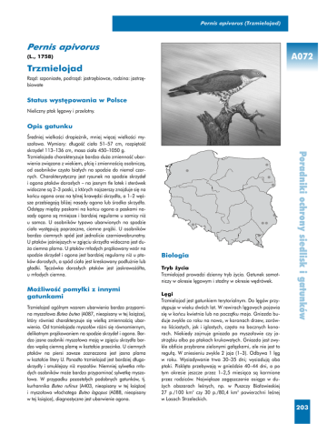 Pernis apivorus (Trzmielojad) Pernis apivorus A072 (L., 1758) Trzmielojad Rzàd: szponiaste, podrzàd: jastrz´biowce, rodzina: jastrz´biowate Status wyst´powania w Polsce Nieliczny ptak l´gowy i przelotny. Opis gatunku Mo˝liwoÊç pomy∏ki z innymi gatunkami Trzmielojad ogólnym wzorem ubarwienia bardzo przypomina myszo∏owa Buteo buteo (A087, nieopisany w tej ksià˝ce), który równie˝ charakteryzuje si´ wielkà zmiennoÊcià ubarwienia. Od trzmielojada myszo∏ów ró˝ni si´ równomiernym, delikatnym prà˝kowaniem na spodzie skrzyde∏ i ogona. Bardzo jasne osobniki myszo∏owa majà w zgi´ciu skrzyd∏a bardzo wàskà ciemnà plam´ w kszta∏cie przecinka. U ciemnych ptaków na piersi zawsze zaznaczona jest jasna plama w kszta∏cie litery U. Ponadto trzmielojad jest bardziej d∏ugoskrzyd∏y i smuklejszy ni˝ myszo∏ów. Niemniej sylwetka m∏odych osobników mo˝e bardzo przypominaç sylwetk´ myszo∏owa. W przypadku pozosta∏ych podobnych gatunków, tj. kurhannika Buteo rufinus (A403, nieopisany w tej ksià˝ce) i myszo∏owa w∏ochatego Buteo lagopus (A088, nieopisany w tej ksià˝ce), diagnostyczne jest ubarwienie ogona. trzmielojad Biologia Tryb ˝ycia Trzmielojad prowadzi dzienny tryb ˝ycia. Gatunek samotniczy w okresie l´gowym i stadny w okresie w´drówek. L´gi Trzmielojad jest gatunkiem terytorialnym. Do l´gów przyst´puje w wieku dwóch lat. W rewirach l´gowych pojawia si´ w koƒcu kwietnia lub na poczàtku maja. Gniazda buduje zwykle co roku na nowo, w koronach drzew, zarówno liÊciastych, jak i iglastych, cz´sto na bocznych konarach. Niekiedy zajmuje gniazda po myszo∏owie czy jastrz´biu albo po ptakach krukowatych. Gniazdo jest zwykle obficie przybrane zielonymi ga∏àzkami, ale nie jest to regu∏à. W zniesieniu zwykle 2 jaja (1–3). Odbywa 1 l´g w roku. Wysiadywanie trwa 30–35 dni; wysiadujà oba ptaki. Piskl´ta przebywajà w gnieêdzie 40–44 dni, a po tym okresie jeszcze przez 1–2,5 miesiàca sà karmione przez rodziców. Najwi´ksze zag´szczenie osiàga w du˝ych obszarach leÊnych, np. w Puszczy Bia∏owieskiej 27 p./100 km2 czy 30 p./80,4 km2 powierzchni leÊnej w Lasach Strzeleckich. Poradniki ochrony siedlisk i gatunków Âredniej wielkoÊci drapie˝nik, mniej wi´cej wielkoÊci myszo∏owa. Wymiary: d∏ugoÊç cia∏a 51–57 cm, rozpi´toÊç skrzyde∏ 113–136 cm, masa cia∏a 450–1050 g. Trzmielojada charakteryzuje bardzo du˝a zmiennoÊç ubarwienia zwiàzana z wiekiem, p∏cià i zmiennoÊcià osobniczà, od osobników czysto bia∏ych na spodzie do niemal czarnych. Charakterystyczny jest rysunek na spodzie skrzyde∏ i ogona ptaków doros∏ych – na jasnym tle lotek i sterówek widoczne sà 2–3 paski, z których najszerszy znajduje si´ na koƒcu ogona oraz na tylnej kraw´dzi skrzyd∏a, a 1–2 w´˝sze przebiegajà bli˝ej nasady ogona lub Êrodka skrzyd∏a. Odst´py mi´dzy paskami na koƒcu ogona a paskami nasady ogona sà mniejsze i bardziej regularne u samicy ni˝ u samca. U osobników typowo ubarwionych na spodzie cia∏a wyst´pujà poprzeczne, ciemne prà˝ki. U osobników bardzo ciemnych spód jest jednolicie czarniawobrunatny. U ptaków jaÊniejszych w zgi´ciu skrzyd∏a widoczna jest du˝a ciemna plama. U ptaków m∏odych prà˝kowany wzór na spodzie skrzyde∏ i ogona jest bardziej regularny ni˝ u ptaków doros∏ych, a spód cia∏a jest kreskowany pod∏u˝nie lub g∏adki. T´czówka doros∏ych ptaków jest jaskrawo˝ó∏ta, u m∏odych ciemna. 203 Ptaki (cz´Êç I) Poradniki ochrony siedlisk i gatunków A072 W´drówki Gatunek w´drowny. W kraju pojawia si´ w drugiej po∏owie kwietnia, a przelotne ptaki obserwuje si´ do koƒca maja, a nawet poczàtku czerwca. Przelot s∏abo zauwa˝alny, jedynie na wybrze˝u jest niekiedy bardziej intensywny; np. w maju na P∏w. Helskim w ciàgu jednego dnia mo˝na zaobserwowaç do 150 przelatujàcych ptaków. Trzmielojad opuszcza tereny l´gowe od po∏owy sierpnia. Wi´kszoÊç ptaków odlatuje do po∏owy wrzeÊnia, a tylko bardzo nieliczne mo˝na jeszcze obserwowaç w paêdzierniku. Jako pierwsze odlatujà ptaki doros∏e, po nich lecà ptaki m∏ode. Przelot jesienny jest równie ma∏o obfity, jak przelot wiosenny, zwykle widywane sà pojedyncze ptaki lub grupki 2–4 ptaków, a rzadko notowano stadka liczàce do kilkunastu osobników. Im dalej na po∏udnie, tym koncentracje trzmielojadów sà wi´ksze. Najwi´ksze notowane by∏y nad po∏udniowym Izraelem, gdzie w ciàgu jednego dnia naliczono maksymalnie do 220 000 ptaków, podczas gdy w czasie jednej wiosny notowano ich tam ponad 850 000. Zimowanie Trzmielojad nie pozostaje na zim´ w kraju. Zimowiska znajdujà si´ w równikowej Afryce, na po∏udnie od Sahary. Zimuje w lasach i na innych g´sto zadrzewionych terenach. Pokarm G∏ówny pokarm trzmielojada stanowià owady spo∏eczne, przede wszystkim osy i szerszenie. Trzmielojad zjada zarówno larwy, poczwarki, jak i owady doros∏e. Gniazda os znajduje, podà˝ajàc za owadami, które obserwuje, siedzàc na ga∏´ziach. Gniazda umieszczone w ziemi rozkopuje za pomocà szponów. Poza tym ˝ywi si´ równie˝ trzmielami, chrzàszczami oraz innymi owadami. Poluje te˝ na ma∏e kr´gowce, jak ˝aby, jaszczurki, gryzonie, oraz wybiera ch´tnie piskl´ta mniejszych gatunków ptaków z gniazd. Zjada równie˝ jagody i inne owoce. W czasie w´drówki nie ˝eruje. Pokarm na zimowiskach jest ma∏o poznany, prawdopodobnie ˝ywi si´ termitami i innymi owadami. Wyst´powanie Siedlisko Trzmielojad zasiedla ró˝nego rodzaju drzewostany, preferujàc stare drzewostany liÊciaste i mieszane, chocia˝ wyst´puje równie˝ w borach. Wydaje si´, i˝ wa˝nym dla trzmielojada czynnikiem siedliskowym jest rozleg∏oÊç obszaru leÊnego. Pewne dane wskazujà, ˝e trzmielojad preferuje lasy o powierzchni powy˝ej 250 ha, rzadko tylko zasiedlajàc zadrzewienia o powierzchni mniejszej ni˝ 50 ha. Istotna jest jednak obecnoÊç w sàsiedztwie lasów 