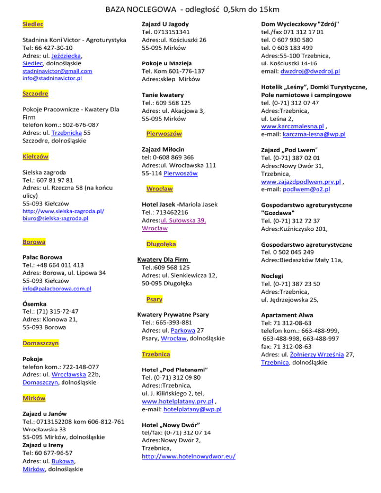 BAZA NOCLEGOWA - odległość 0,5km do 15km Siedlec Stadnina Koni Victor - Agroturystyka Tel: 66 427-30-10 Adres: ul. Jeździecka, Siedlec, dolnośląskie [email protected] [email protected] Szczodre Pokoje Pracownicze - Kwatery Dla Firm telefon kom.: 602-676-087 Adres: ul. Trzebnicka 55 Szczodre, dolnośląskie Kiełczów Sielska zagroda Tel.: 607 81 97 81 Adres: ul. Rzeczna 58 (na końcu ulicy) 55-093 Kiełczów http://www.sielska-zagroda.pl/ [email protected] Borowa Pałac Borowa Tel.: +48 664 011 413 Adres: Borowa, ul. Lipowa 34 55-093 Kiełczów [email protected] Ósemka Tel.: (71) 315-72-47 Adres: Klonowa 21, 55-093 Borowa Domaszczyn Pokoje telefon kom.: 722-148-077 Adres: ul. Wrocławska 22b, Domaszczyn, dolnośląskie Mirków Zajazd u Janów Tel.: 0713152208 kom 606-812-761 Wrocławska 33 55-095 Mirków, dolnośląskie Zajazd u Ireny Tel: 60 677-96-57 Adres: ul. Bukowa, Mirków, dolnośląskie Zajazd U Jagody Tel. 0713151341 Adres:ul. Kościuszki 26 55-095 Mirków Pokoje u Mazieja Tel. Kom 601-776-137 Adres:sklep Mirków Tanie kwatery Tel.: 609 568 125 Adres: ul. Akacjowa 3, 55-095 Mirków Pierwoszów Zajazd Miłocin tel: 0-608 869 366 Adres:ul. Wrocławska 111 55-114 Pierwoszów Wrocław Hotel Jasek -Mariola Jasek Tel.: 713462216 Adres:ul. Sułowska 39, Wrocław Długołęka Kwatery Dla Firm Tel.:609 568 125 Adres: ul. Sienkiewicza 12, 50-095 Długołęka Psary Kwatery Prywatne Psary Tel.: 665-393-881 Adres: ul. Parkowa 27 Psary, Wrocław, dolnośląskie Trzebnica Hotel „Pod Platanami” Tel. (0-71) 312 09 80 Adres::Trzebnica, ul. J. Kilińskiego 2, tel. www.hotelplatany.prv.pl , e-mail: [email protected] Hotel „Nowy Dwór” tel/fax: (0-71) 312 07 14 Adres:Nowy Dwór 2, Trzebnica, http://www.hotelnowydwor.eu/ Dom Wycieczkowy "Zdrój" tel./fax 071 312 17 01 tel. 0 607 930 580 tel. 0 603 183 499 Adres:55-100 Trzebnica, ul. Kościuszki 14-16 email: [email protected] Hotelik „Leśny”, Domki Turystyczne, Pole namiotowe i campingowe tel. (0-71) 312 07 47 Adres:Trzebnica, ul. Leśna 2, www.karczmalesna.pl , e-mail: [email protected] Zajazd „Pod Lwem” Tel. (0-71) 387 02 01 Adres:Nowy Dwór 31, Trzebnica, www.zajazdpodlwem.prv.pl , e-mail: [email protected] Gospodarstwo agroturystyczne "Gozdawa" Tel. (0-71) 312 72 37 Adres:Kuźniczysko 201, Gospodarstwo agroturystyczne Tel. 0 502 045 249 Adres:Biedaszków Mały 11a, Noclegi Tel. (0-71) 387 23 50 Adres:Trzebnica, ul. Jędrzejowska 25, Apartament Alwa Tel: 71 312-08-63 telefon kom.: 663-488-999, 663-488-998, 663-488-997 fax: 71 312-08-63 Adres: ul. Żołnierzy Września 27, Trzebnica, dolnośląskie