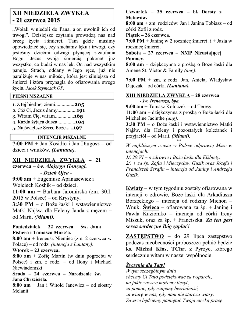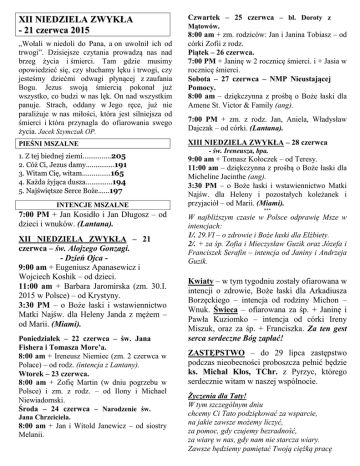 XII NIEDZIELA ZWYKŁA - 21 czerwca 2015 „Wołali w niedoli do Pana, a on uwolnił ich od trwogi”. Dzisiejsze czytania prowadzą nas nad brzeg życia i śmierci. Tam gdzie musimy opowiedzieć się, czy słuchamy lęku i trwogi, czy jesteśmy dziećmi odwagi płynącej z zaufania Bogu. Jezus swoją śmiercią pokonał już wszystko, co budzi w nas lęk. On nad wszystkim panuje. Strach, oddany w Jego ręce, już nie paraliżuje w nas miłości, która jest silniejsza od śmierci i która przynagla do ofiarowania swego życia. Jacek Szymczak OP. Czwartek – 25 czerwca – bł. Doroty z Mątowów. 8:00 am + zm. rodziców: Jan i Janina Tobiasz – od córki Zofii z rodz. Piątek – 26 czerwca. 7:00 PM + Janinę w 2 rocznicę śmierci. i + Jasia w rocznicę śmierci. Sobota – 27 czerwca – NMP Nieustającej Pomocy. 8:00 am – dziękczynna z prośbą o Boże łaski dla Amene St. Victor & Family (ang). 7:00 PM + zm. z rodz. Jan, Aniela, Władysław Dajczak – od córki. (Lantana). PIEŚNI MSZALNE XIII NIEDZIELA ZWYKŁA – 28 czerwca 1. Z tej biednej ziemi…............205 2. Cóż Ci, Jezus damy...............191 3. Witam Cię, witam..…..……..165 4. Każda żyjąca dusza…...........194 5. Najświętsze Serce Boże......197 9:00 am + Tomasz Kołoczek – od Teresy. 11:00 am – dziękczynna z prośbą o Boże łaski dla Micheline Jacinthe (ang). 3:30 PM – o Boże łaski i wstawiennictwo Matki Najśw. dla Heleny i pozostałych koleżanek i przyjaciół – od Marii. (Miami). INTENCJE MSZALNE 7:00 PM + Jan Kosidło i Jan Długosz – od dzieci i wnuków. (Lantana). XII NIEDZIELA ZWYKŁA – 21 czerwca – św. Alojzego Gonzagi. - Dzień Ojca 9:00 am + Eugeniusz Apanasewicz i Wojciech Koshik – od dzieci. 11:00 am + Barbara Jaromirska (zm. 30.I. 2015 w Polsce) – od Krystyny. 3:30 PM – o Boże łaski i wstawiennictwo Matki Najśw. dla Heleny Janda z mężem – od Marii. (Miami). Poniedziałek – 22 czerwca – św. Jana Fishera i Tomasza More’a. 8:00 am + Ireneusz Niemiec (zm. 2 czerwca w Polace) – od rodz. (intencja z Lantany). Wtorek – 23 czerwca. 8:00 am + Zofię Martin (w dniu pogrzebu w Polsce) i zm. z rodz. – od Ilony i Michael Niewiadomski. Środa – 24 czerwca – Narodzenie św. Jana Chrzciciela. 8:00 am + Jan i Witold Janewicz – od siostry Melanii. - św. Ireneusza, bpa. *** W najbliższym czasie w Polsce odprawię Msze w intencjach: 1/. 29.VI – o zdrowie i Boże łaski dla Elżbiety. 2/. + za śp. Zofia i Mieczysław Guzik oraz Józefa i Franciszek Serafin – intencja od Janiny i Andrzeja Guzik. Kwiaty – w tym tygodniu zostały ofiarowana w intencji o zdrowie, Boże łaski dla Arkadiusza Borzęckiego – intencja od rodziny Michon – Wnuk. Świeca – ofiarowana za śp. + Janinę i Pawła Kuziomko – intencja od córki Ireny Miszuk, oraz za śp. + Franciszka. Za ten gest serca serdeczne Bóg zapłać! ZASTĘPSTWO – do 29 lipca zastępstwo podczas nieobecności proboszcza pełnić będzie ks. Michał Kłos, TChr. z Pyrzyc, którego serdecznie witam w naszej wspólnocie. Życzenia dla Taty! W tym szczególnym dniu chcemy Ci Tato podziękować za wsparcie, na jakie zawsze możemy liczyć, za pomoc, gdy czujemy bezradność, za wiarę w nas, gdy nam nie starcza wiary. Zawsze będziemy pamiętać Twoją ciężką pracę i poświęcenie dla nas Tato. Życzymy Ci, aby nigdy nie opuściła Cię Twoja siła i dobry humor wiedząc, że Twoje dzieci sercem są zawsze z Tobą, sercem pełnym miłości i wdzięczności. *** Z okazji Dnia Taty, tato ukochany, niech każdy dzień będzie udany, niech samochód się nie psuje i uśmiech na twarzy maluje, niech Ci skowronek na rękę przyleci i żebyś zawsze miał powód do dumy ze swoich dzieci! *** Kawiarenka - w ostatnim tygodniu w kawiarence posługiwali: Ewa i Ireneusz Otfinowski. Dochód wyniósł $212. Bóg zapłać za zaangażowanie w życie naszej Wspólnoty! *** Na czas wakacyjny życzę Nauczycielkom, młodzieży i wszystkim dzieciom pogodnych i długich WAKACJI! *** Jeżeli za bardzo oddalamy się od Jezusa, nasze serce twardnieje. Niektórzy mówią: Jezus stoi z biczem w ręce i mnie uderzy. Powtarzam: On oczekuje na ciebie z miłością i prosi, byś na Niego spojrzał. To, co mnie najbardziej uderza w Chrystusie, to Jego miłosierdzie. Św. Franciszek . Cierp i składaj w ofierze te drobne przykrości, małe niedogodności, które spadają na ciebie każdego dnia. Ból zębów, ból głowy, przeziębienie, pogarda czy szyderstwo. Wszystkie te małe ofiary, przyjęte i zaakceptowane z miłością, są niezwykle miłe dla Bożej Dobroci, Jezusa, który za kubek chłodnej wody obiecał morze wiekuistego szczęścia. Św. Teresa z Avila. Modlić się to patrzeć na Boga, ale przede wszystkim czuć, że On patrzy na nas. Papież Franciszek. Nasze małe cierpienia związane są z wielką historią cierpienia Boga w Jezusie Chrystusie, a nasze małe życie z życiem Boga pośród nas. Jezus przyjmuje nasze cierpienie i łączy je z bólem całej ludzkości, bólem, który On sam przyjął i przemienił. Juan Carlos Barajas. OGŁOSZENIA POLONIJNE Oferta: sprzedam mieszkanie 2 sypialniowe i 2 łazienki, po kapitalnym remoncie, 55+, strzeżone 24/7. Tel (954) 610-0247 (2x). Oferta: wynajmę mieszkanie 2 sypialniowe i 2 łazienki położone w kom. Pow. 55 lat. Tel: (954) 610-0247 (2x). Oferta: wynajmę pokój w Boca Raton, również opcja na weekendy. Tel: (561) 633-7212 (2x). Oferta: Lake Worth - 1sypialnia, 1 łazienka, po remoncie na sprzedaż. $39 tys. 217 miesięcznie. Również inne nieruchomości. Renata Janus – Realtor Tel: (561) 542-2387 (5x) Oferta: potrzebna pomoc do starszej Pani od pon. do piątku od godz. 1:00 PM do 4:00 PM i sobota od 10:00am do niedziela 8:00PM. Tel (786) 2469996 Danuta (dzwonić po 5:00PM) (4x). Oferta: sprzedam kondominium 1 bedroom po remoncie z meblami, w Coconut Creek. Tel: 1 (646) 912-2522 (1x). Oferta: poszukuję opiekunki dla do dziecka w Ft. Lauderdale. Tel (7