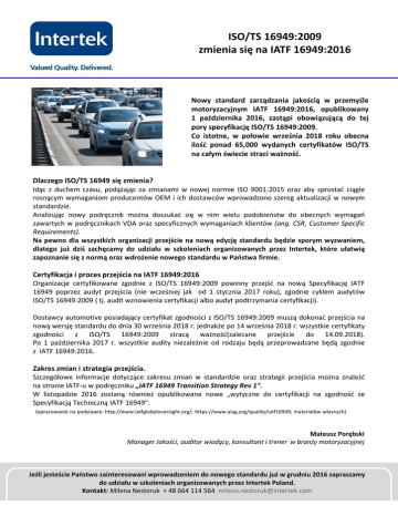 ISO/TS 16949:2009 zmienia się na IATF 16949:2016 Nowy standard zarządzania jakością w przemyśle motoryzacyjnym IATF 16949:2016, opublikowany 1 października 2016, zastąpi obowiązującą do tej pory specyfikację ISO/TS 16949:2009. Co istotne, w połowie września 2018 roku obecna ilość ponad 65,000 wydanych certyfikatów ISO/TS na całym świecie straci ważność. Dlaczego ISO/TS 16949 się zmienia? Idąc z duchem czasu, podążając za zmianami w nowej normie ISO 9001:2015 oraz aby sprostać ciągle rosnącym wymaganiom producentów OEM i ich dostawców wprowadzono szereg aktualizacji w nowym standardzie. Analizując nowy podręcznik można doszukać się w nim wielu podobieństw do obecnych wymagań zawartych w podręcznikach VDA oraz specyficznych wymaganiach klientów (ang. CSR, Customer Specific Requirements). Na pewno dla wszystkich organizacji przejście na nową edycję standardu będzie sporym wyzwaniem, dlatego już dziś zachęcamy do udziału w szkoleniach organizowanych przez Intertek, które ułatwią zapoznanie się z normą oraz wdrożenie nowego standardu w Państwa firmie. Certyfikacja i proces przejścia na IATF 16949:2016 Organizacje certyfikowane zgodnie z ISO/TS 16949:2009 powinny przejść na nową Specyfikację IATF 16949 poprzez audyt przejścia (nie wcześniej jak od 1 stycznia 2017 roku), zgodnie cyklem audytów ISO/TS 16949:2009 ( tj. audit wznowienia certyfikacji albo audyt podtrzymania certyfikacji). Dostawcy automotive posiadający certyfikat zgodności z ISO/TS 16949:2009 muszą dokonać przejścia na nową wersję standardu do dnia 30 września 2018 r. jednakże po 14 września 2018 r. wszystkie certyfikaty zgodności z ISO/TS 16949:2009 stracą ważność(zalecane przejście do 14.09.2018). Po 1 października 2017 r. wszystkie audity niezależnie od rodzaju będą przeprowadzane będą zgodnie z IATF 16949:2016. Zakres zmian i strategia przejścia. Szczegółowe informacje dotyczące zakresu zmian w standardzie oraz strategii przejścia można znaleźć na stronie IATF-u w podręczniku „IATF 16949 Transition Strategy Rev 1”. W listopadzie 2016 zostaną również opublikowane nowe „wytyczne do certyfikacji na zgodność ze Specyfikacją Techniczną IATF 16949”. (opracowanie na podstawie: http://www.iatfglobaloversight.org/; https://www.aiag.org/quality/iatf16949; materiałów własnych) Mateusz Porębski Manager Jakości, auditor wiodący, konsultant i trener w branży motoryzacyjnej Jeśli jesteście Państwo zainteresowani wprowadzeniem do nowego standardu już w grudniu 2016 zapraszamy do udziału w szkoleniach organizowanych przez Intertek Poland. Kontakt: Milena Nestoruk + 48 664 114 564 [email protected]