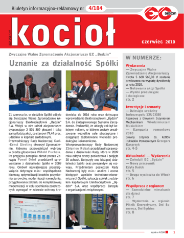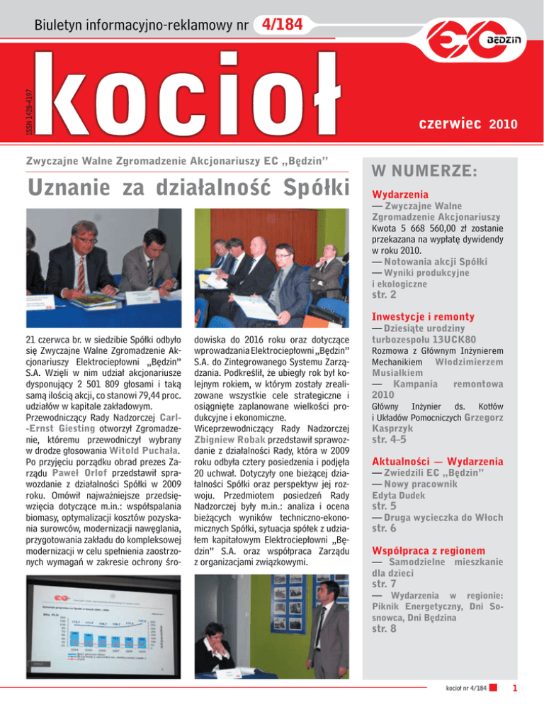 4/184 czerwiec 2010 Styczeń/Luty 2006 Zwyczajne Walne Zgromadzenie Akcjonariuszy EC „Będzin” Uznanie za działalność Spółki W NUMERZE: Wydarzenia — Zwyczajne Walne Zgromadzenie Akcjonariuszy Kwota 5 668 560,00 zł zostanie przekazana na wypłatę dywidendy w roku 2010. — Notowania akcji Spółki — Wyniki produkcyjne i ekologiczne str. 2 Inwestycje i remonty 21 czerwca br. w siedzibie Spółki odbyło się Zwyczajne Walne Zgromadzenie Akcjonariuszy Elektrociepłowni „Będzin” S.A. Wzięli w nim udział akcjonariusze dysponujący 2 501 809 głosami i taką samą ilością akcji, co stanowi 79,44 proc. udziałów w kapitale zakładowym. Przewodniczący Rady Nadzorczej Carl-Ernst Giesting otworzył Zgromadzenie, któremu przewodniczył wybrany w drodze głosowania Witold Puchała. Po przyjęciu porządku obrad prezes Zarządu Paweł Orlof przedstawił sprawozdanie z działalności Spółki w 2009 roku. Omówił najważniejsze przedsięwzięcia dotyczące m.in.: współspalania biomasy, optymalizacji kosztów pozyskania surowców, modernizacji nawęglania, przygotowania zakładu do kompleksowej modernizacji w celu spełnienia zaostrzonych wymagań w zakresie ochrony śro- dowiska do 2016 roku oraz dotyczące wprowadzania Elektrociepłowni „Będzin” S.A. do Zintegrowanego Systemu Zarządzania. Podkreślił, że ubiegły rok był kolejnym rokiem, w którym zostały zrealizowane wszystkie cele strategiczne i osiągnięte zaplanowane wielkości produkcyjne i ekonomiczne. Wiceprzewodniczący Rady Nadzorczej Zbigniew Robak przedstawił sprawozdanie z działalności Rady, która w 2009 roku odbyła cztery posiedzenia i podjęła 20 uchwał. Dotyczyły one bieżącej działalności Spółki oraz perspektyw jej rozwoju. Przedmiotem posiedzeń Rady Nadzorczej były m.in.: analiza i ocena bieżących wyników techniczno-ekonomicznych Spółki, sytuacja spółek z udziałem kapitałowym Elektrociepłowni „Będzin” S.A. oraz współpraca Zarządu z organizacjami związkowymi. — Dziesiąte urodziny turbozespołu 13UCK80 Rozmowa z Głównym Inżynierem Mechanikiem Włodzimierzem Musiałkiem — Kampania remontowa 2010 Główny Inżynier ds. Kotłów i Układów Pomocniczych Grzegorz Kasprzyk str. 4–5 Aktualności — Wydarzenia — Zwiedzili EC „Będzin” — Nowy pracownik Edyta Dudek str. 5 — Druga wycieczka do Włoch str. 6 Współpraca z regionem — Samodzielne mieszkanie dla dzieci str. 7 — Wydarzenia w regionie: Piknik Energetyczny, Dni Sosnowca, Dni Będzina str. 8 kocioł nr 4/184 1 Walne Zgromadzenie ZWZA podjęło uchwały zatwierdzające sprawozdanie Zarządu EC „Będzin” z działalności w 2009 roku oraz sprawozdanie finansowe za 2009 rok. Podział zysku netto Zysk netto Spółki za 2009 roku w kwocie 8 243 284,83 zł podzielony zostanie w sposób następujący: — kwota 5 668 560,00 zł zostanie przekazana na wypłatę dywidendy w roku 2010, — kwota 2 574 724,83 zł zostanie przekazana na kapitał rezerwowy z przeznaczeniem na wypłatę dywidendy w latach następnych. Dywidenda w roku 2010 zostanie wypłacona w wysokości 1,80 zł na jedną akcję. Notowania akcji Elektrocieplowni „Będzin” S.A. Dniem dywidendy będzie 12 lipca 2010 roku. Dniem wypłaty dywidendy będzie 27 lipca 2010 roku. Kapitał rezerwowy Zwyczajne Walne Zgromadzenie Akcjonariuszy zmieniło przeznaczenie „kapitału rezerwowego z przeznaczeniem na finansowanie inwestycji w roku 2005” (uchwała z dnia 30.06.2004 r.) na „kapitał zapasowy”. Absolutorium Prezesowi Zarządu Elektrociepłowni „Będzin” S.A. Pawłowi Orlofowi oraz członkowi Zarządu Sabinie Apel udzielono absolutorium z wykonania obowiązków w roku 2009. Absolutorium z wykonania obowiązków w roku ubiegłym otrzymali również wszyscy członkowie Rady Nadzorczej. Wyniki produkcyjne w maju Energia elEktryczna Produkcja energii elektrycznej wyniosła 21 408 MWh brutto, w tym: 16 332 MWh w skojarzeniu oraz 5 076 MWh w kondensacji. Miesięczny plan sprzedaży został wykonany w 132,3 proc. ciepło Produkcja ciepła wyniosła 155 531 GJ. Miesięczny plan sprzedaży ciepła został wykonany w 258,5 proc. Emisja zanieczyszczeń w maju 2 wykonanie plan NO2 40 685 kg 41 600 kg SO2 111 544 kg 142 000 kg Pył 3 569 kg 6 900 kg kocioł nr 4/184 Inwestycje i Remonty Dziesiąte urodziny turbozespołu 13UCK80 W tym roku turbozespół 13UCK80 obchodzi dziesiąte urodziny. 3 sierpnia 2000 roku odbył się uroczysty chrzest głównego urządzenia wytwórczego, jak kiedyś ktoś powiedział: „serca elektrociepłowni”. Natomiast 17 listopada tego samego roku turbozespół został oddany do eksploatacji. Każdy, kto pracował w tamtym okresie, wie, jak ważne było to wydarzenie nie tylko dla EC „Będzin” S.A., lecz także dla całego regionu Zagłębia Dąbrowskiego. Budowa turbozespołu wymagała pełnego zaangażowania wielu pracowników, tak EC „Będzin” S.A., jak i generalnego realizatora zadania i firm współpracujących, oraz wiązała się z ogromną odpowiedzialnością. Stał się najważniejszy dla Zarządu Spółki, kadry inżynieryjno-technicznej i pracowników bezpośredniej obsługi. Był „oczkiem w głowie” ludzi koordynujących jego budowę. Do nich zalicza się Główny Inżynier Mechanik Działu Rozwoju i Remontów Włodzimierz Musiałek. — Co można powiedzieć o turbozespole po 10 latach eksploatacji? — Nasz turbozespół w dalszym ciągu jest jednym z najnowocześniejszych urządzeń wytwórczych, co nie znaczy, że nie wymaga okresowych przeglądów i remontów. W dokumentacji technicznej turbozespołu przekazanej przez jego wytwórcę zostały określone warunki eksploatacji, rodzaje oraz ramowy zakres remontów i okresy ich wykonywania. Najmniejszym zakresowo jest remont bieżący, trwa 9 dni i jest wykonywany co 2 lata. Większym zakresowo jest remont średni, trwa 22 dni i wykonywany jest co 3 lata. Największym, jeśli chodzi o zakres, jest remont kapitalny. Producent zal
