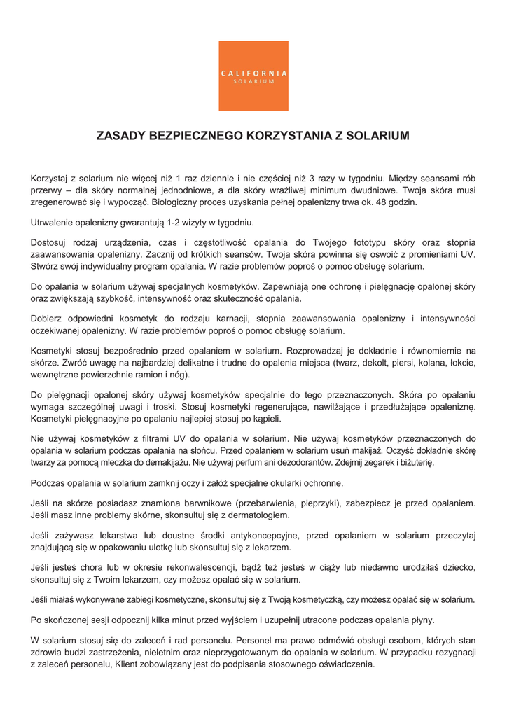 ZASADY BEZPIECZNEGO KORZYSTANIA Z SOLARIUM Korzystaj z solarium nie więcej niż 1 raz dziennie i nie częściej niż 3 razy w tygodniu. Między seansami rób przerwy – dla skóry normalnej jednodniowe, a dla skóry wrażliwej minimum dwudniowe. Twoja skóra musi zregenerować się i wypocząć. Biologiczny proces uzyskania pełnej opalenizny trwa ok. 48 godzin. Utrwalenie opalenizny gwarantują 1-2 wizyty w tygodniu. Dostosuj rodzaj urządzenia, czas i częstotliwość opalania do Twojego fototypu skóry oraz stopnia zaawansowania opalenizny. Zacznij od krótkich seansów. Twoja skóra powinna się oswoić z promieniami UV. Stwórz swój indywidualny program opalania. W razie problemów poproś o pomoc obsługę solarium. Do opalania w solarium używaj specjalnych kosmetyków. Zapewniają one ochronę i pielęgnację opalonej skóry oraz zwiększają szybkość, intensywność oraz skuteczność opalania. Dobierz odpowiedni kosmetyk do rodzaju karnacji, stopnia zaawansowania opalenizny i intensywności oczekiwanej opalenizny. W razie problemów poproś o pomoc obsługę solarium. Kosmetyki stosuj bezpośrednio przed opalaniem w solarium. Rozprowadzaj je dokładnie i równomiernie na skórze. Zwróć uwagę na najbardziej delikatne i trudne do opalenia miejsca (twarz, dekolt, piersi, kolana, łokcie, wewnętrzne powierzchnie ramion i nóg). Do pielęgnacji opalonej skóry używaj kosmetyków specjalnie do tego przeznaczonych. Skóra po opalaniu wymaga szczególnej uwagi i troski. Stosuj kosmetyki regenerujące, nawilżające i przedłużające opaleniznę. Kosmetyki pielęgnacyjne po opalaniu najlepiej stosuj po kąpieli. Nie używaj kosmetyków z filtrami UV do opalania w solarium. Nie używaj kosmetyków przeznaczonych do opalania w solarium podczas opalania na słońcu. Przed opalaniem w solarium usuń makijaż. Oczyść dokładnie skórę twarzy za pomocą mleczka do demakijażu. Nie używaj perfum ani dezodorantów. Zdejmij zegarek i biżuterię. Podczas opalania w solarium zamknij oczy i załóż specjalne okularki ochronne. Jeśli na skórze posiadasz znamiona barwnikowe (przebarwienia, pieprzyki), zabezpiecz je przed opalaniem. Jeśli masz inne problemy skórne, skonsultuj się z dermatologiem. Jeśli zażywasz lekarstwa lub doustne środki antykoncepcyjne, przed opalaniem w solarium przeczytaj znajdującą się w opakowaniu ulotkę lub skonsultuj się z lekarzem. Jeśli jesteś chora lub w okresie rekonwalescencji, bądź też jesteś w ciąży lub niedawno urodziłaś dziecko, skonsultuj się z Twoim lekarzem, czy możesz opalać się w solarium. Jeśli miałaś wykonywane zabiegi kosmetyczne, skonsultuj się z Twoją kosmetyczką, czy możesz opalać się w solarium. Po skończonej sesji odpocznij kilka minut przed wyjściem i uzupełnij utracone podczas opalania płyny. W solarium stosuj się do zaleceń i rad personelu. Personel ma prawo odmówić obsługi osobom, których stan zdrowia budzi zastrzeżenia, nieletnim oraz nieprzygotowanym do opalania w solarium. W przypadku rezygnacji z zaleceń personelu, Klient zobowiązany jest do podpisania stosownego oświadczenia.
