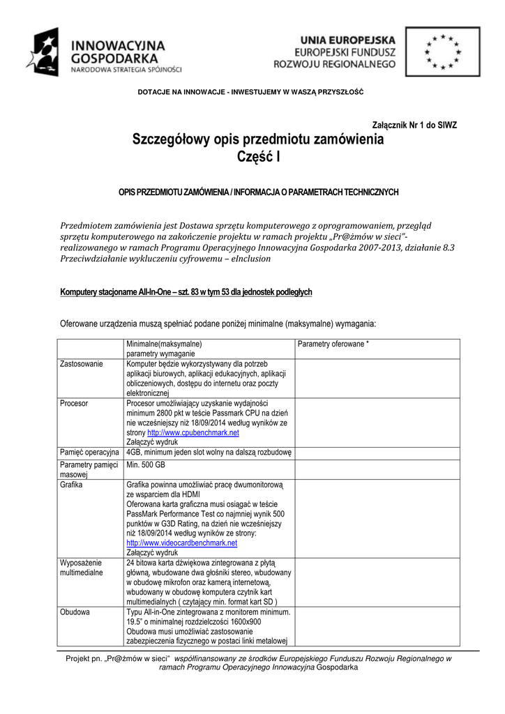 DOTACJE NA INNOWACJE - INWESTUJEMY W WASZĄ PRZYSZŁOŚĆ Załącznik Nr 1 do SIWZ Szczegółowy opis przedmiotu zamówienia Część I OPIS PRZEDMIOTU ZAMÓWIENIA / INFORMACJA O PARAMETRACH TECHNICZNYCH Przedmiotem zamówienia jest Dostawa sprzętu komputerowego z oprogramowaniem, przegląd sprzętu komputerowego na zakończenie projektu w ramach projektu „Pr@żmów w sieci”realizowanego w ramach Programu Operacyjnego Innowacyjna Gospodarka 2007-2013, działanie 8.3 Przeciwdziałanie wykluczeniu cyfrowemu – eInclusion Komputery stacjonarne All-In-One – szt. 83 w tym 53 dla jednostek podległych Oferowane urządzenia muszą spełniać podane poniżej minimalne (maksymalne) wymagania: Minimalne(maksymalne) Parametry oferowane * parametry wymaganie Zastosowanie Komputer będzie wykorzystywany dla potrzeb aplikacji biurowych, aplikacji edukacyjnych, aplikacji obliczeniowych, dostępu do internetu oraz poczty elektronicznej Procesor Procesor umożliwiający uzyskanie wydajności minimum 2800 pkt w teście Passmark CPU na dzień nie wcześniejszy niż 18/09/2014 według wyników ze strony http://www.cpubenchmark.net Załączyć wydruk Pamięć operacyjna 4GB, minimum jeden slot wolny na dalszą rozbudowę Parametry pamięci Min. 500 GB masowej Grafika Grafika powinna umożliwiać pracę dwumonitorową ze wsparciem dla HDMI Oferowana karta graficzna musi osiągać w teście PassMark Performance Test co najmniej wynik 500 punktów w G3D Rating, na dzień nie wcześniejszy niż 18/09/2014 według wyników ze strony: http://www.videocardbenchmark.net Załączyć wydruk Wyposażenie 24 bitowa karta dźwiękowa zintegrowana z płytą multimedialne główną, wbudowane dwa głośniki stereo, wbudowany w obudowę mikrofon oraz kamerą internetową, wbudowany w obudowę komputera czytnik kart multimedialnych ( czytający min. format kart SD ) Obudowa Typu All-in-One zintegrowana z monitorem minimum. 19.5” o minimalnej rozdzielczości 1600x900 Obudowa musi umożliwiać zastosowanie zabezpieczenia fizycznego w postaci linki metalowej Projekt pn. „Pr@żmów w sieci” współfinansowany ze środków Europejskiego Funduszu Rozwoju Regionalnego w ramach Programu Operacyjnego Innowacyjna Gospodarka DOTACJE NA INNOWACJE - INWESTUJEMY W WASZĄ PRZYSZŁOŚĆ Zgodność z systemami operacyjnymi i standardami BIOS Certyfikaty i standardy Warunki gwarancji (złącze blokady Kensingtona) lub kłódki (oczko w obudowie do założenia kłódki) Oferowane modele komputerów muszą posiadać certyfikat producenta oprogramowania, potwierdzający poprawną współpracę oferowanych modeli komputerów z oferowanym systemem operacyjnym (załączyć wydruk ze strony producenta oprogramowania) BIOS zgodny ze specyfikacją UEFI, z wbudowaną obsługą za pomocą klawiatury i myszy. Możliwość, bez uruchamiania systemu operacyjnego z dysku twardego komputera lub innych podłączonych do niego urządzeń zewnętrznych odczytania z BIOS informacji o: − wersji BIOS, − nr seryjnym komputera wraz z datą jego wyprodukowania, − ilości i sposobu obłożenia slotów pamięciami RAM, − typie procesora wraz z informacją o ilości rdzeni, wielkości pamięci cache L2 i L3, − MAC adresie zintegrowanej karty sieciowej − zainstalowanej bezprzewodowej karcie sieciowej − kontrolerze audio − zainstalowanej karcie graficznej Funkcja blokowania wejścia do BIOS oraz blokowania startu systemu operacyjnego, (gwarantujący utrzymanie zapisanego hasła nawet w przypadku odłączenia wszystkich źródeł zasilania i podtrzymania BIOS), Możliwość ustawienia portów USB w trybie „no BOOT”, czyli podczas startu komputer nie wykrywa urządzeń bootujących typu USB, natomiast po uruchomieniu systemu operacyjnego porty USB są aktywne. Możliwość włączenia/wyłączenia portów USB Deklaracja zgodności CE Potwierdzenie spełnienia kryteriów środowiskowych, w tym zgodności z dyrektywą RoHS Unii Europejskiej o eliminacji substancji niebezpiecznych w postaci oświadczenia producenta jednostki (wg wytycznych Krajowej Agencji Poszanowania Energii S.A., zawartych w dokumencie „Opracowanie propozycji kryteriów środowiskowych dla produktów zużywających energię możliwych do wykorzystania przy formułowaniu specyfikacji na potrzeby zamówień publicznych”, pkt. 3.4.2.1; dokument z grudnia 2006). Zamawiający nie wymaga załączenia dokumentów potwierdzających powyższych wymogów do oferty. Co najmniej 5 lat gwarancji od daty dostawy w miejscu instalacji komputera. Usunięcie awarii - następny dzień roboczy po Projekt pn. „Pr@żmów w sieci” współfinansowany ze środków Europejskiego Funduszu Rozwoju Regionalnego w ramach Programu Operacyjnego Innowacyjna Gospodarka DOTACJE NA INNOWACJE - INWESTUJEMY W WASZĄ PRZYSZŁOŚĆ otrzymaniu zgłoszenia (przyjmowanie zgłoszeń w dni robocze w godzinach 8.00 — 16.00 telefonicznie, faksem, e-mail), w przypadku braku możliwości naprawy w w/w terminie. Serwis świadczony na miejscu u klienta Czas reakcji serwisu - do końca następnego dnia roboczego podstawienie sprzętu zastępczego o niegorszych parametrach technicznych. System operacyjny Zainstalowany system operacyjny klasy PC musi spełniać następujące wymagania, poprzez wbudowane mechanizmy, bez użycia dodatkowych aplikacji: • możliwość dokonywania aktualizacji i poprawek systemu przez Internet z możliwością wyboru instalowanych poprawek; • Możliwość dokonywania uaktualnień sterowników urządzeń przez Internet – witrynę producenta systemu; • Darmowe aktualizacje w ramach wersji systemu operacyjnego przez Internet (niezbędne aktualizacje, poprawki, biuletyny bezpieczeństwa muszą być dostarczane bez dodatkowych opłat) – wymagane podanie nazwy strony serwera WWW; • Internetowa aktualizacja zapewniona w języku polskim; • Wbudowana zapora internetowa (firewall) dla ochrony połączeń internetowych; zintegrowana z systemem konsola do zarządzania ustawieniami zapor