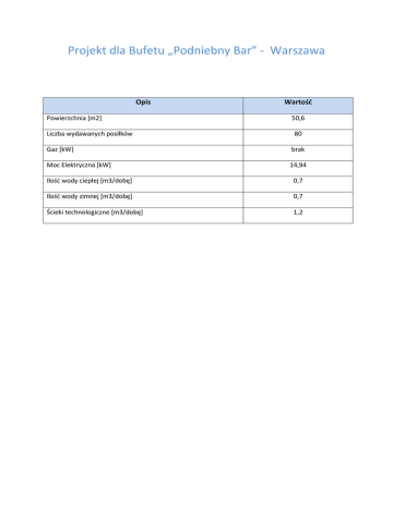 Projekt dla Bufetu „Podniebny Bar” - Warszawa Opis Powierzchnia [m2] Liczba wydawanych posiłków Wartość 50,6 80 Gaz [kW] brak Moc Elektryczna [kW] 14,94 Ilość wody ciepłej [m3/dobę] 0,7 Ilość wody zimnej [m3/dobę] 0,7 Ścieki technologiczne [m3/dobę] 1,2 Wykaz urządzeń "Podniebny Barek" LOT Catering W Warszawie L.p. 1 2 Nazwa urządzenia Szt Witryna naroŜna - wyroby garmaŜeryjne Lada sałatkowa + komplet pojemników GN + nadstawka 2-półkowa, neutralna Kociołek do zupy Kostkarka do lodu 24 kg/24 h Zmywarka do naczyń i szkła Szafa chłodnicza 500 l, biała emaliowana Szafa mroźnicza 500 l, biała emaliowana 1 1 1 1 2 1 1 1 1 10 11 12 13 14 15 Witryna chłodnicza na napoje, 500 l, nierdzewna Kuchenka mikrofalowa, profesjonalna + półka Płyta glassceramiczna Młynek koloidalny do pracy ciągłej Umywalka wbudowana + bateria sztorcowa Zlew wbudowany + bateria sztorcowa Lada barowa Kasa fiskalna 1 2 2 1 1 1 1 1 1 16 17 18 19 20 Zlew 1-komorowy bez półki + bateria sztorcowa Stół chłodniczy Umywalka + bateria sztorcowa Szafa przelotowa Stół bez półki 1 1 1 1 1 21 22 23 Zlew 1-komorowy bez półki + prysznic gastronomiczny Szafa porządkowa Szafka szatniowa 2-działowa 1 1 2 24 25 26 27 Witryna chłodnicza do wyrobów garmaŜeryjnych Wolny numer Biurko + krzesło + komputer Szafa magazynowa 28 Automat do kawy 1 1 1 1 1 1 1 1 3 4 5 6 7 8 9