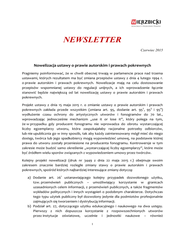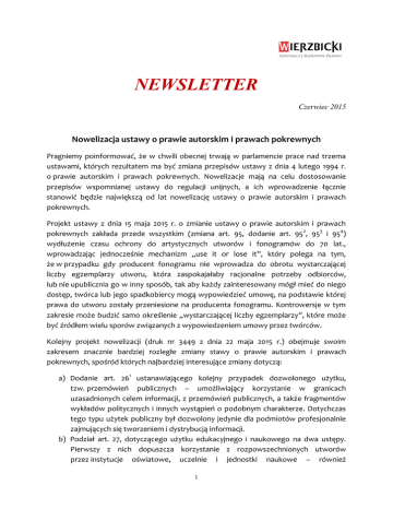 NEWSLETTER Czerwiec 2015 Nowelizacja ustawy o prawie autorskim i prawach pokrewnych Pragniemy poinformować, że w chwili obecnej trwają w parlamencie prace nad trzema ustawami, których rezultatem ma być zmiana przepisów ustawy z dnia 4 lutego 1994 r. o prawie autorskim i prawach pokrewnych. Nowelizacje mają na celu dostosowanie przepisów wspomnianej ustawy do regulacji unijnych, a ich wprowadzenie łącznie stanowić będzie największą od lat nowelizację ustawy o prawie autorskim i prawach pokrewnych. Projekt ustawy z dnia 15 maja 2015 r. o zmianie ustawy o prawie autorskim i prawach pokrewnych zakłada przede wszystkim (zmiana art. 95, dodanie art. 952, 953 i 954) wydłużenie czasu ochrony do artystycznych utworów i fonogramów do 70 lat., wprowadzając jednocześnie mechanizm „use it or lose it”, który polega na tym, że w przypadku gdy producent fonogramu nie wprowadza do obrotu wystarczającej liczby egzemplarzy utworu, która zaspokajałaby racjonalne potrzeby odbiorców, lub nie upublicznia go w inny sposób, tak aby każdy zainteresowany mógł mieć do niego dostęp, twórca lub jego spadkobiercy mogą wypowiedzieć umowę, na podstawie której prawa do utworu zostały przeniesione na producenta fonogramu. Kontrowersje w tym zakresie może budzić samo określenie „wystarczającej liczby egzemplarzy”, które może być źródłem wielu sporów związanych z wypowiedzeniem umowy przez twórców. Kolejny projekt nowelizacji (druk nr 3449 z dnia 22 maja 2015 r.) obejmuje swoim zakresem znacznie bardziej rozległe zmiany stawy o prawie autorskim i prawach pokrewnych, spośród których najbardziej interesujące zmiany dotyczą: a) Dodanie art. 261 ustanawiającego kolejny przypadek dozwolonego użytku, tzw. przemówień publicznych – umożliwiający korzystanie w granicach uzasadnionych celem informacji, z przemówień publicznych, a także fragmentów wykładów politycznych i innych wystąpień o podobnym charakterze. Dotychczas tego typu użytek publiczny był dozwolony jedynie dla podmiotów profesjonalnie zajmujących się tworzeniem i dystrybucją informacji. b) Podział art. 27, dotyczącego użytku edukacyjnego i naukowego na dwa ustępy. Pierwszy z nich dopuszcza korzystanie z rozpowszechnionych utworów przez instytucje oświatowe, uczelnie i jednostki naukowe – również 1 c) d) e) f) g) h) i) j) poprzez zwielokrotnianie całych drobnych utworów jak i fragmentów większych utworów, dla zilustrowania treści przekazywanych w celach dydaktycznych lub w celu prowadzenia badań naukowych. Posłużenie się pojęciem zwielokrotniania umożliwi wykorzystanie rozpowszechnionych utworów również w ramach e-learningu. Projektowany ust. 2 wprowadza jednakże zastrzeżenie, że udostępnianie na odległość jest możliwe tylko w przypadku e-learningu przeznaczonego dla ograniczonego, zidentyfikowanego kręgu osób. Zmiana art. 28 ust. 1 pkt 2 – poruszającego kwestię sporządzania egzemplarzy zapasowych przez biblioteki, szkoły czy archiwa. Dotychczasowy termin „sporządzanie egzemplarzy” ma zostać zastąpiony terminem „zwielokrotnianie”, co ma pozwolić na tworzenie kopii w postaci cyfrowej i umożliwić digitalizację zbiorów. Zmiany w zakresie art. 28 – wprowadzenie dodatkowego wynagrodzenia dla twórców (public lending right), którego powstanie wiąże się wyłącznie z użyczeniem egzemplarzy utworów wyrażonych słowem (powstałych lub opublikowanych w języku polskim) przez biblioteki publiczne. Nie oznacza to wprowadzenia odpłatności za korzystanie z bibliotek publicznych – wynagrodzenie ma być wypłacane ze środków Funduszu Promocji Kultury. W projektowanych art. 351 – 354 określono mechanizm wypłaty wynagrodzenia. Zmiana art. 29 poprzez rozszerzenie prawa cytatu również na utwory plastyczne i fotograficzne. Dodanie art. 291, wprowadzającego odrębne od prawa cytatu prawo do wykorzystania utworu dla potrzeb parodii, karykatury lub pastiszu – co stanowi uregulowanie kwestii, które do tej pory były niejasne. Dodanie art. 292, przewidującego nową instytucję zezwolenia na incydentalne i niezamierzone włączenie utworu do innego materiału – co jest interpretowane jako brak znaczenia włączonego utworu dla materiału do którego został włączony oraz brak celowego związku. Zmiana art. 30 poprzez uwzględnienie cyfrowych form opracowywania i magazynowania danych i utworów. Zmiana art. 31 umożliwiająca wykorzystanie w ramach ceremonii religijnych i oficjalnych uroczystości organizowanych przez władze państwowe z utworów, które nie zostały przedtem w żaden sposób upublicznione. Projekt art. 355 – 3511 – uregulowanie kwestii wykorzystania z tzw. utworów sierocych – podlegających wprawdzie ochronie prawno-autorskiej, ale do których autorów lub osób uprawnionych nie można dotrzeć. Trudności mogą wynikać bądź z faktu niemożności zidentyfikowania uprawnionego lub przeszkód w ustaleniu miejsca ich pobytu. ****** 2